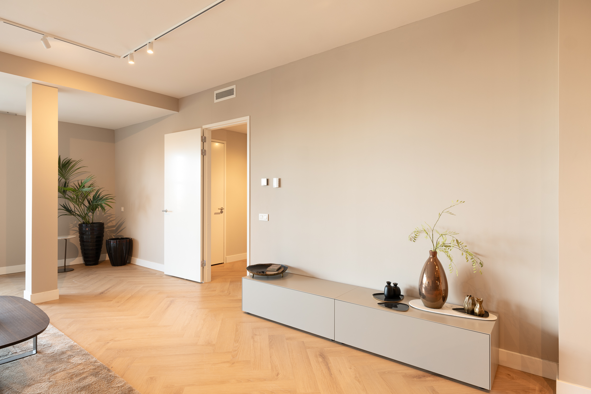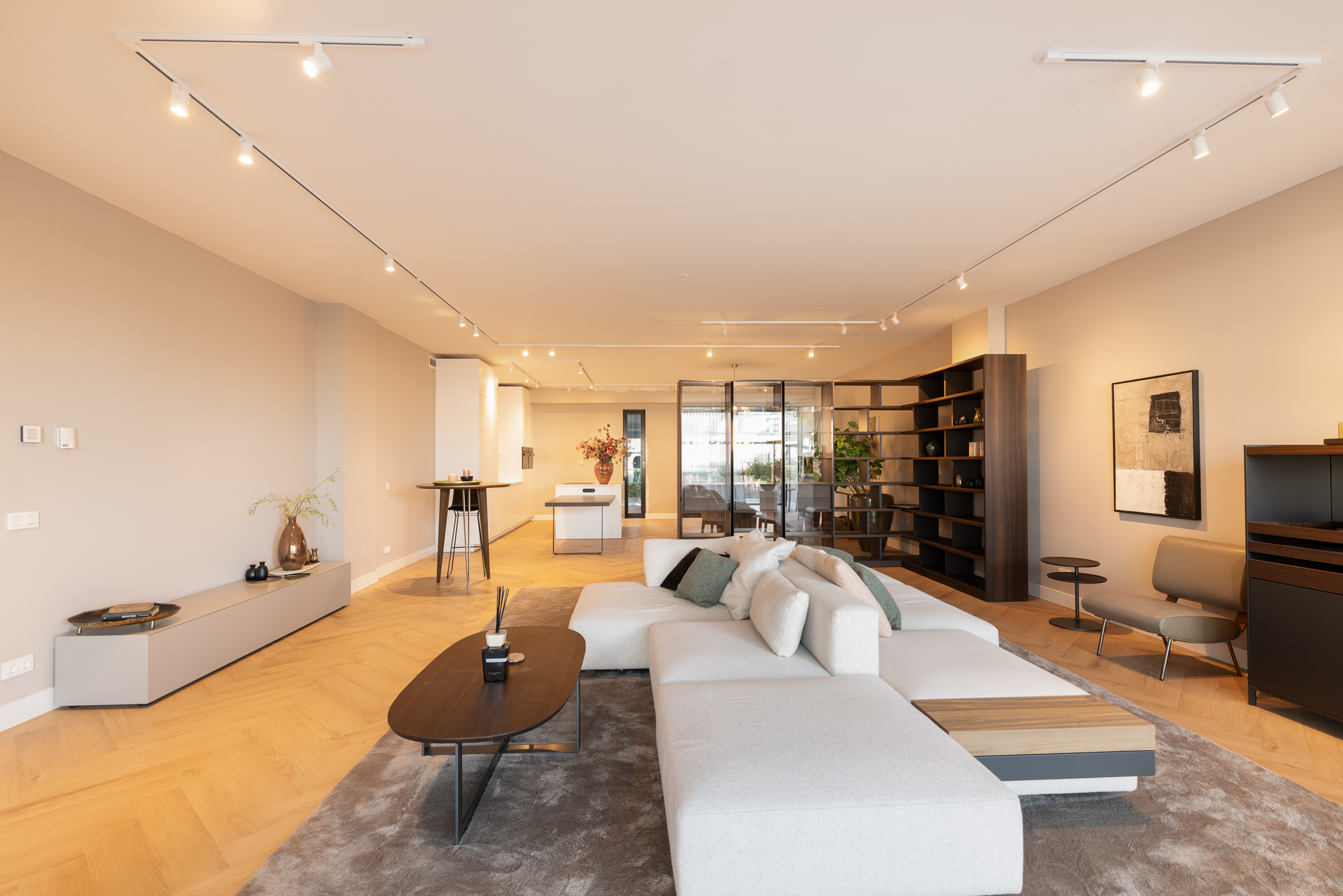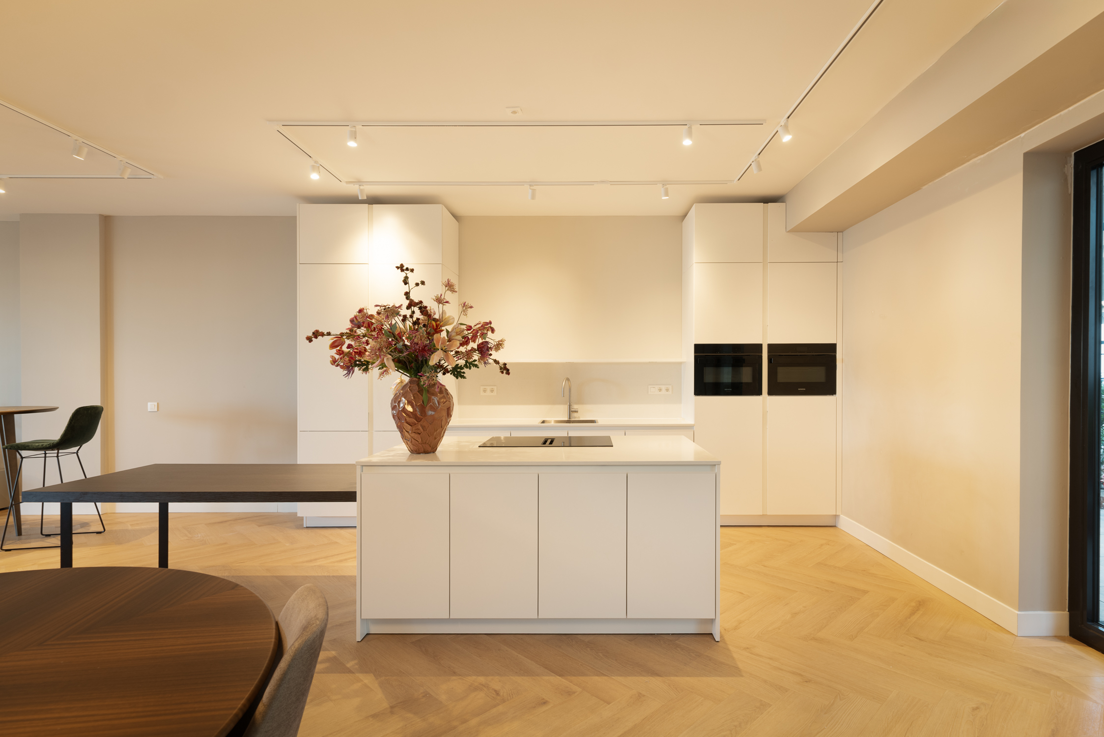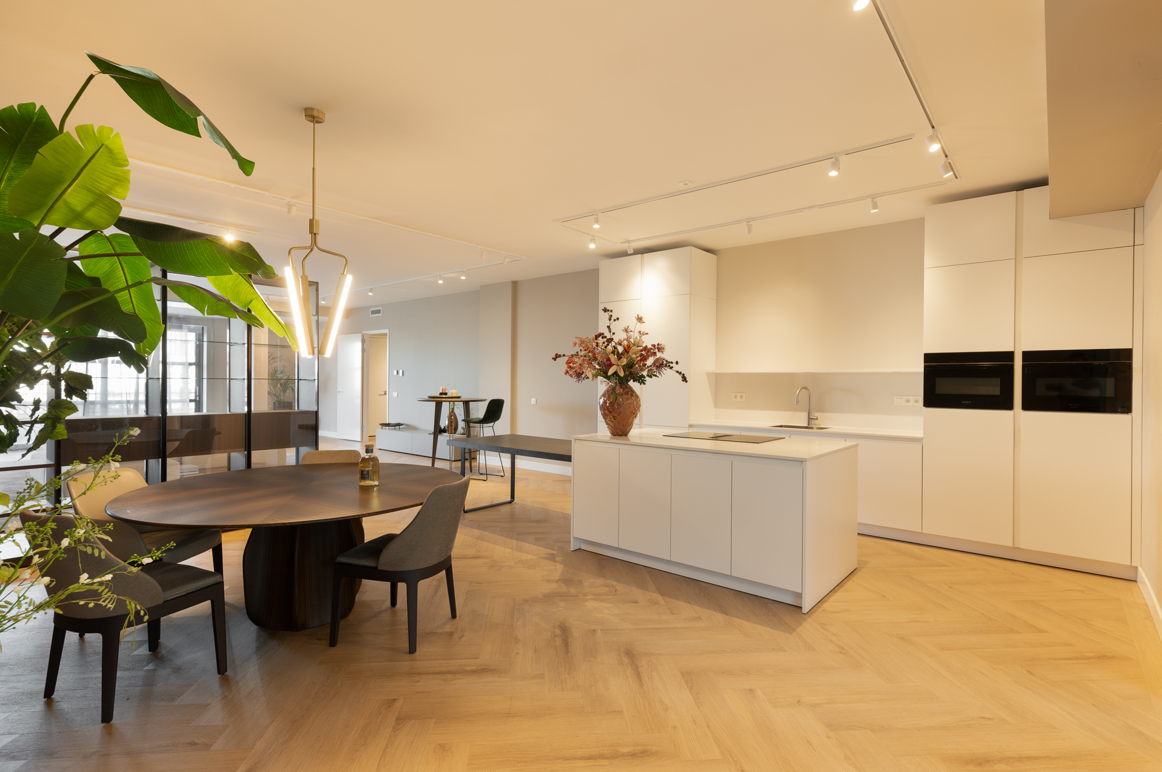 De enorme leefruimte van bijna 90 m² combineert een stijlvolle zithoek, eetkamer en moderne open keuken. Alles is strak gestuukt, voorzien van een prachtige PVC visgraatvloer, luxe raambekleding, maatwerkverlichting en hoogwaardig interieurdesign. De grote raampartijen zorgen voor een overvloed aan daglicht en een directe verbinding met de tuin.