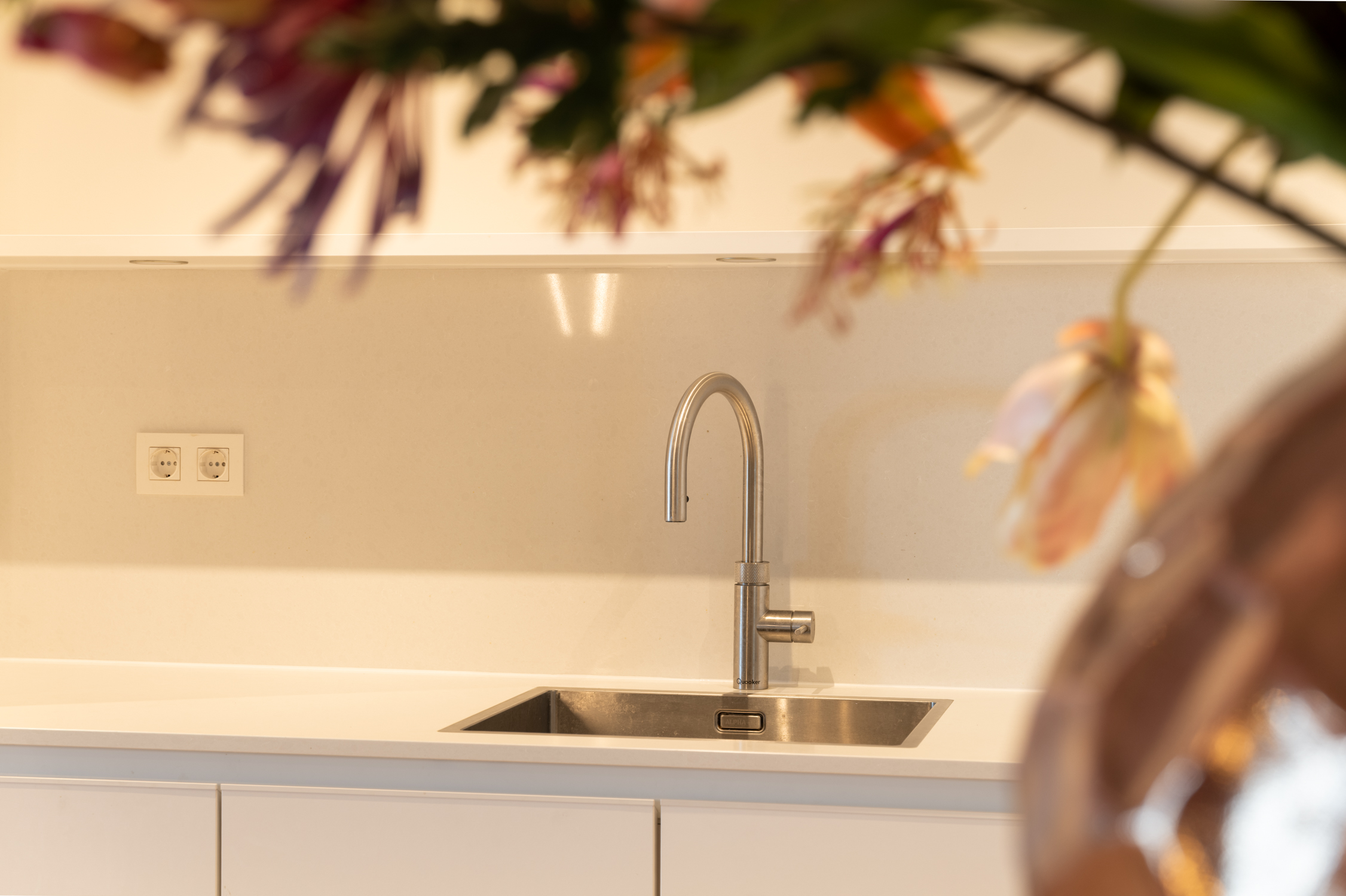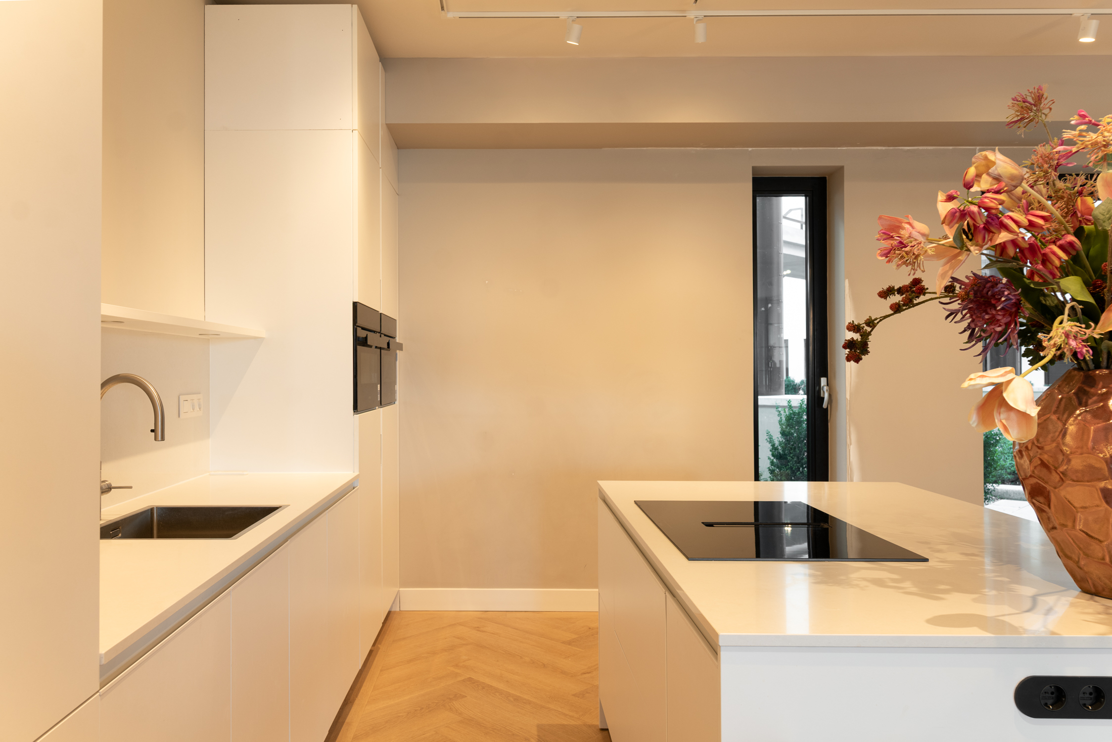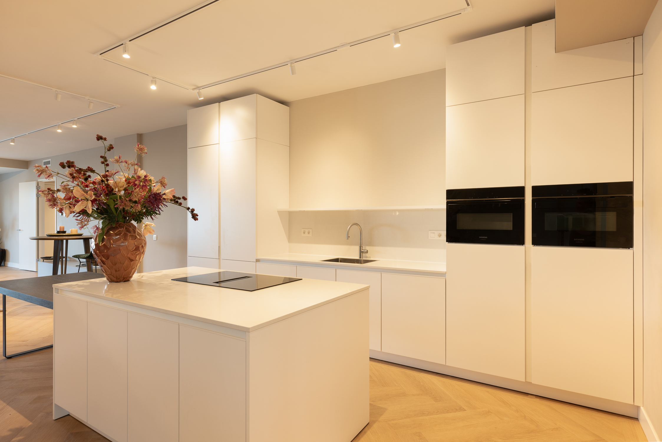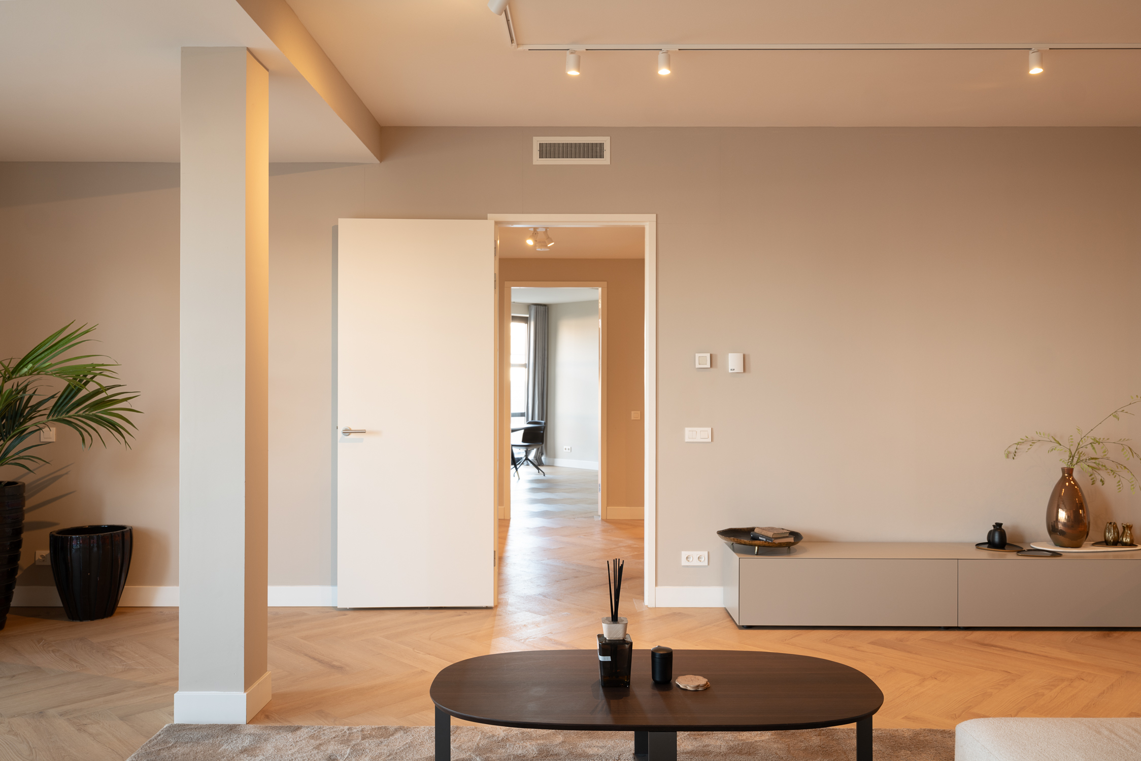 De enorme leefruimte van bijna 90 m² combineert een stijlvolle zithoek, eetkamer en moderne open keuken. Alles is strak gestuukt, voorzien van een prachtige PVC visgraatvloer, luxe raambekleding, maatwerkverlichting en hoogwaardig interieurdesign. De grote raampartijen zorgen voor een overvloed aan daglicht en een directe verbinding met de tuin.