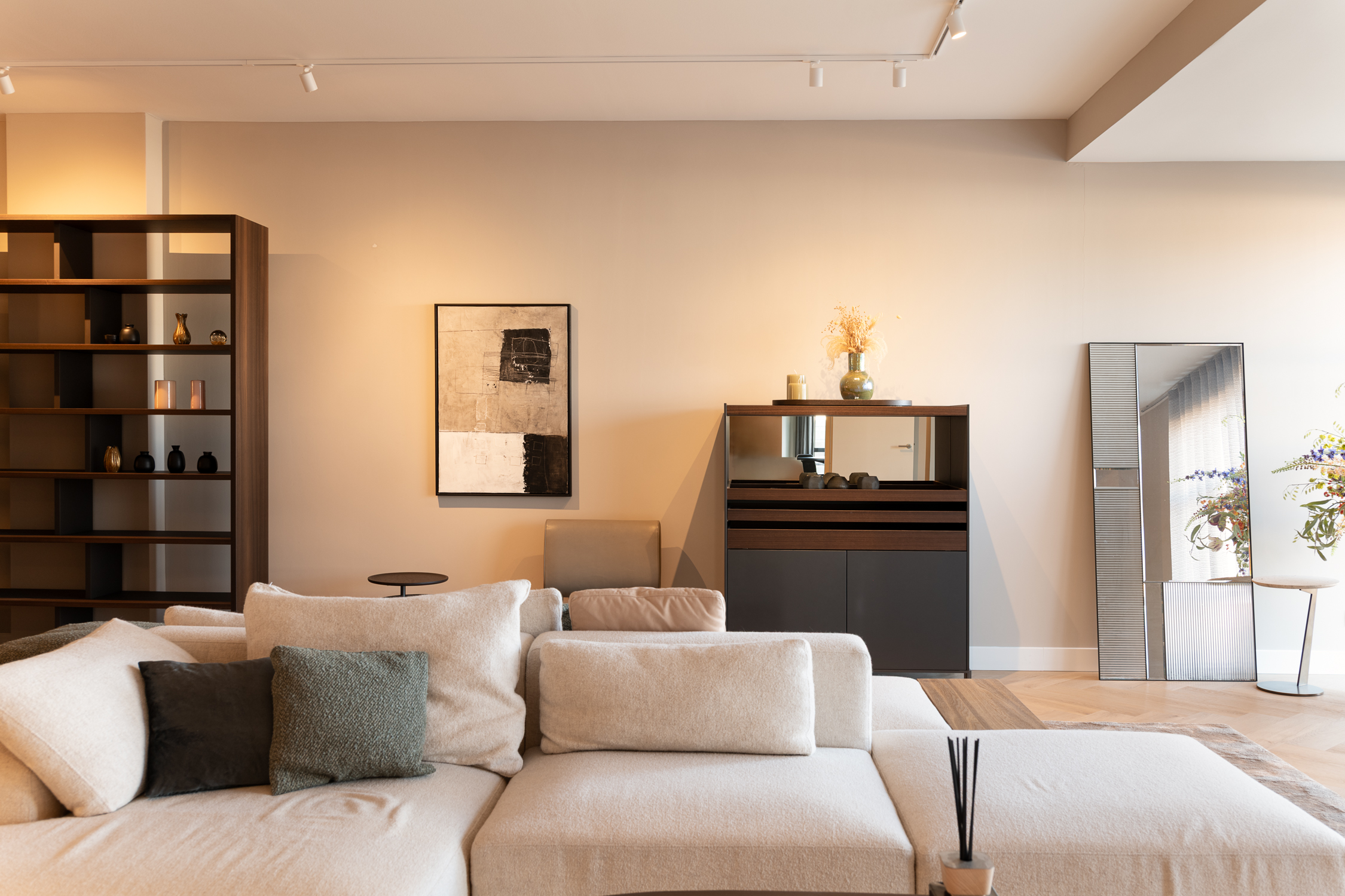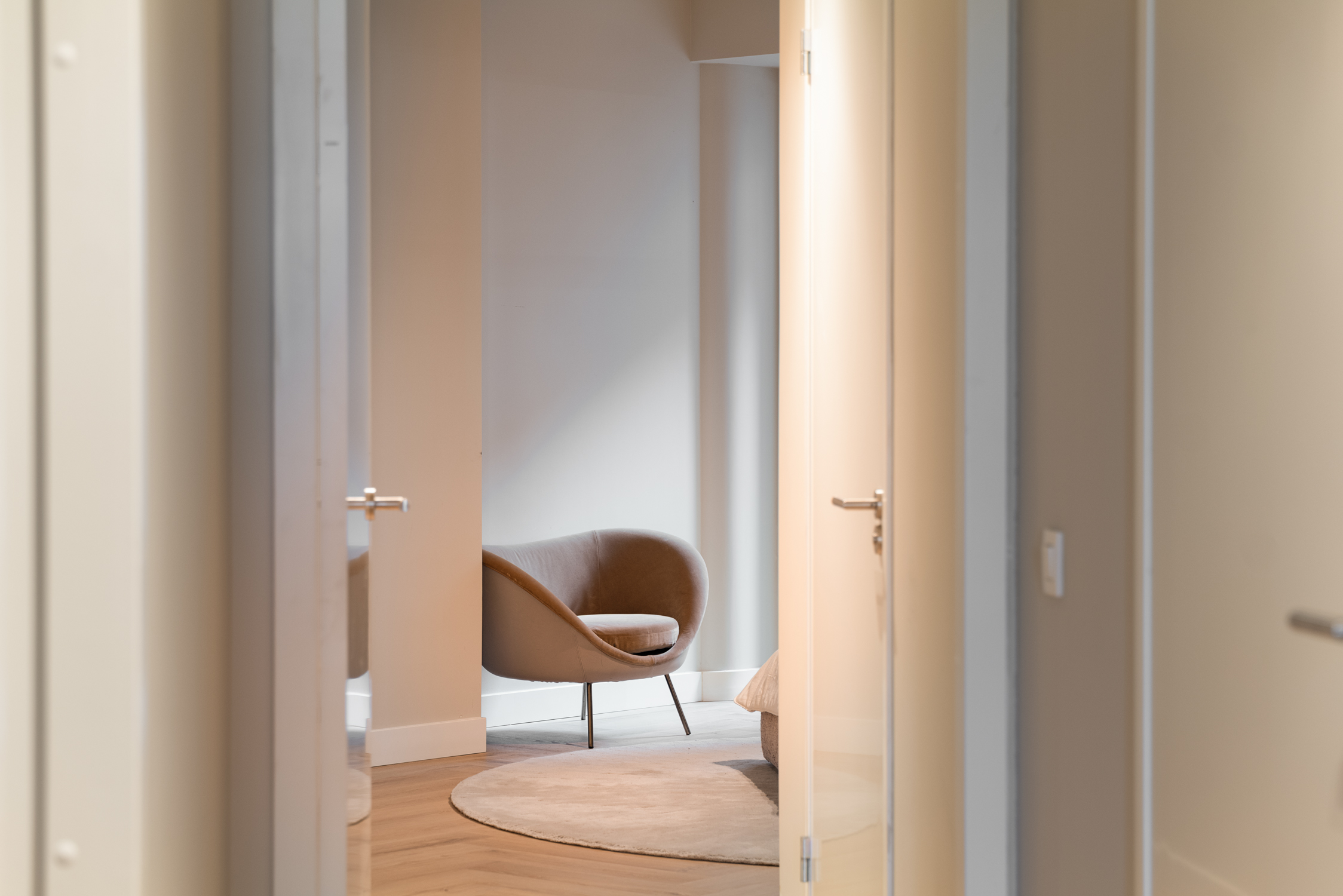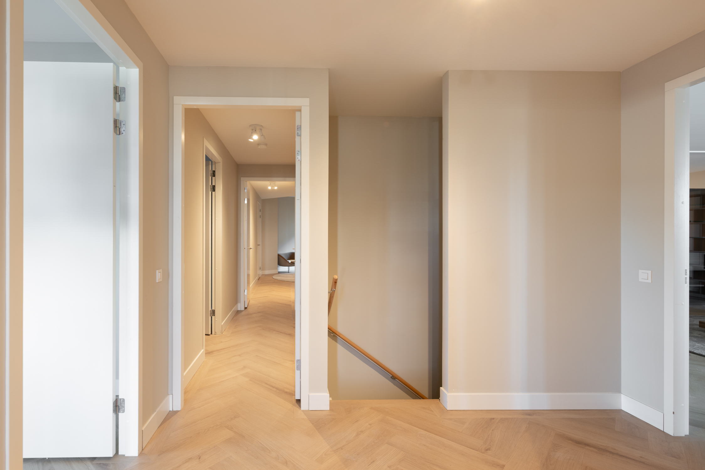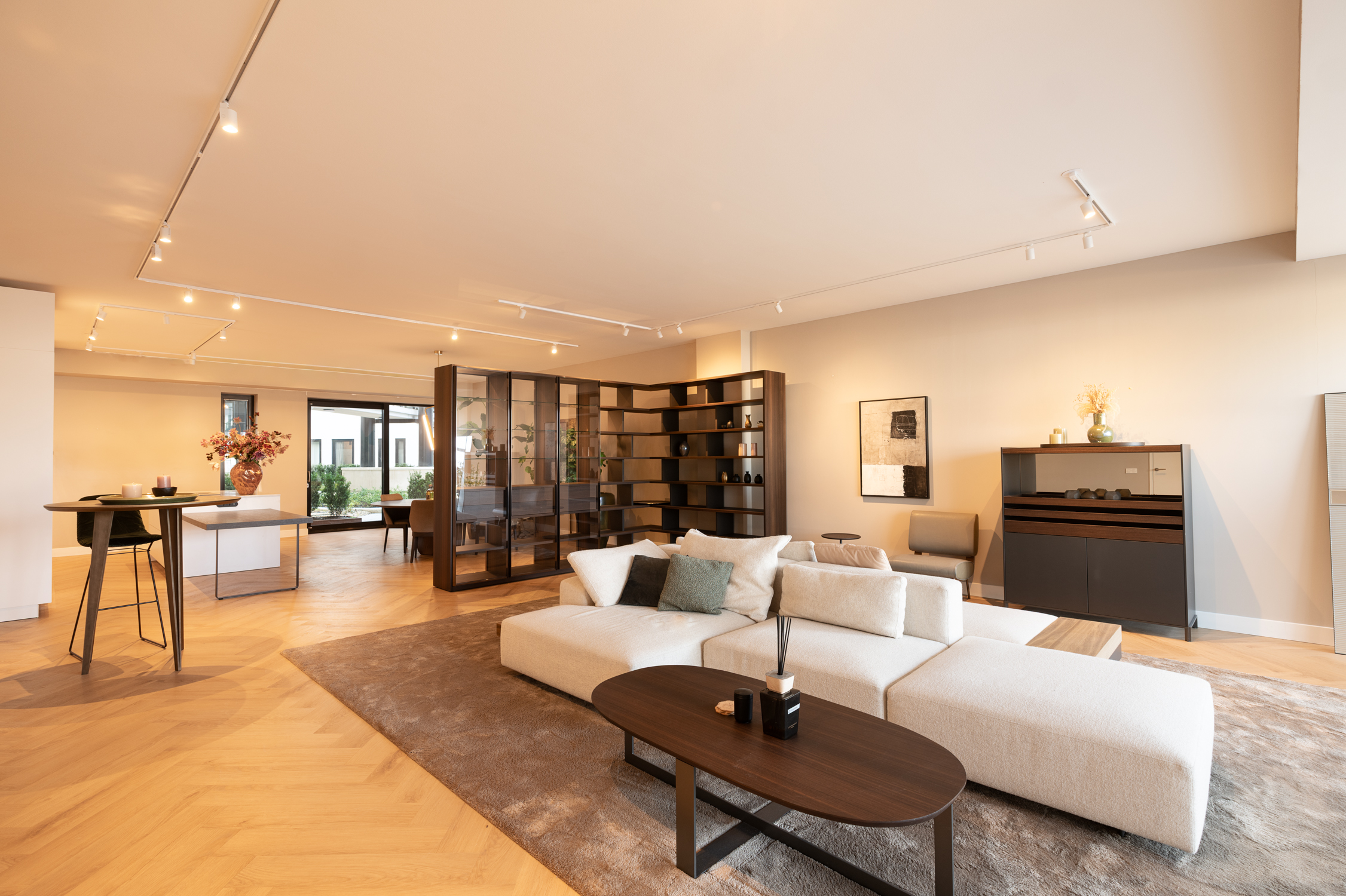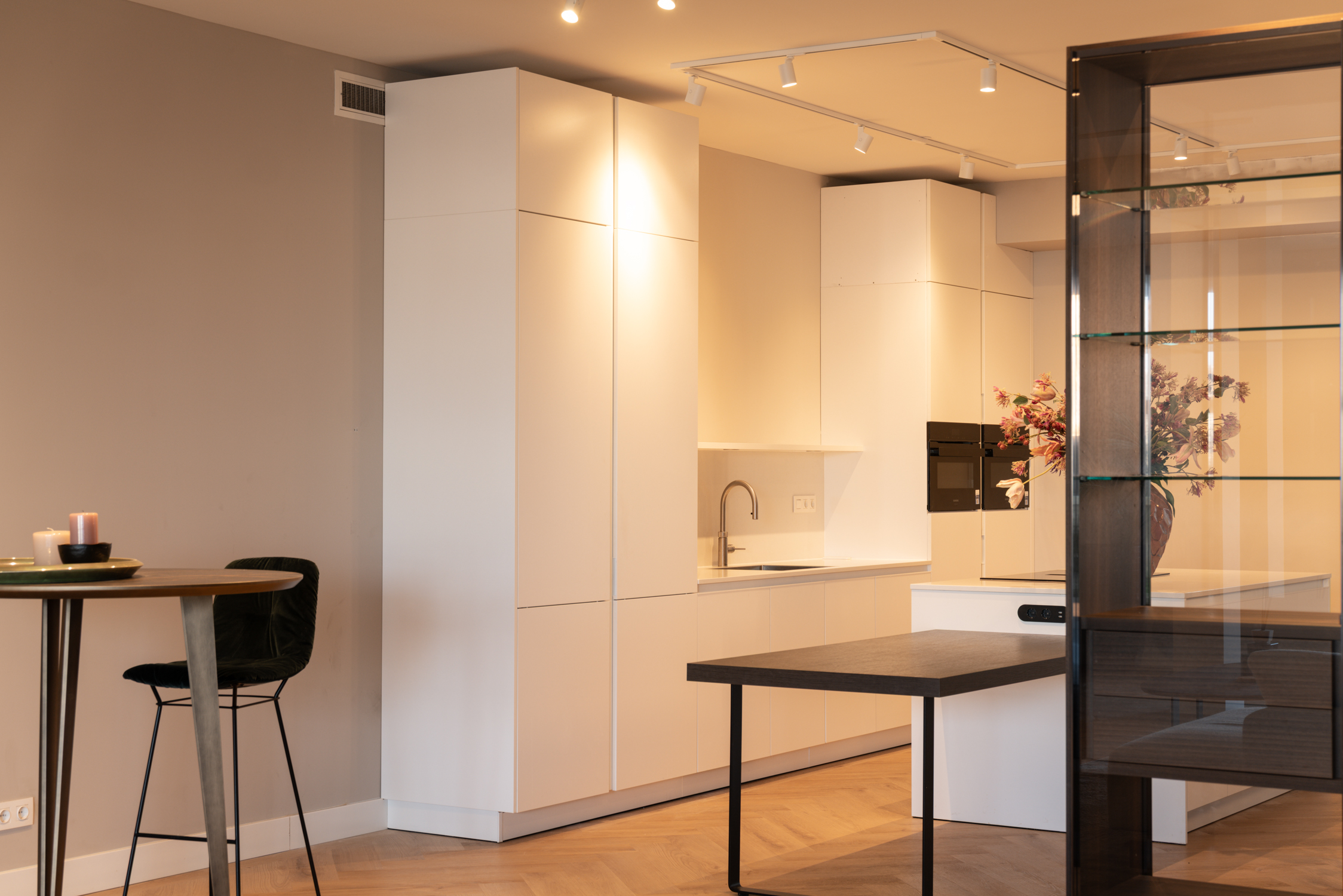 De enorme leefruimte van bijna 90 m² combineert een stijlvolle zithoek, eetkamer en moderne open keuken. Alles is strak gestuukt, voorzien van een prachtige PVC visgraatvloer, luxe raambekleding, maatwerkverlichting en hoogwaardig interieurdesign. De grote raampartijen zorgen voor een overvloed aan daglicht en een directe verbinding met de tuin.