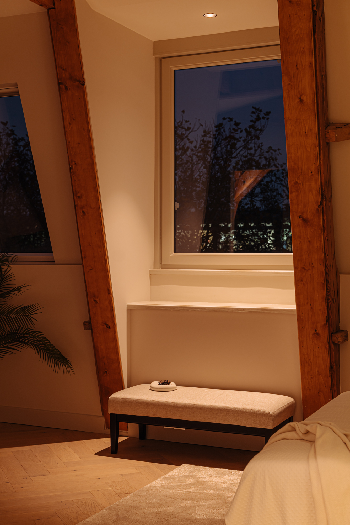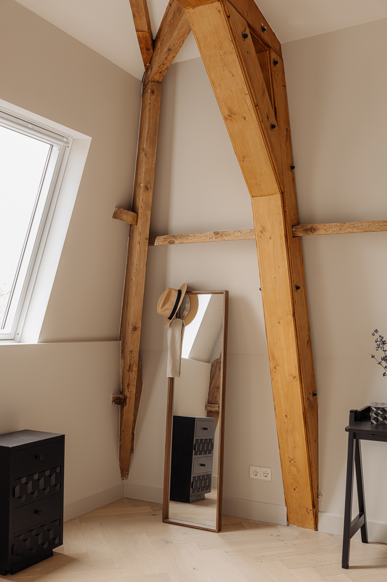 De slaapkamers aan de achterzijde genieten van een overvloed aan natuurlijk licht en zijn beide royaal van afmeting, waardoor er eenvoudig een derde slaapkamer te realiseren is. Ook hier zijn de prachtige originele houten balken, die bijdragen aan de karakteristieke charme van de woning, volop aanwezig. De Master bedroom beschikt over een eigen en-suite badkamer, uitgerust met een dubbele wastafel, een royaal ligbad, een ruime inloopdouche en een toilet. Deze badkamer biedt alle comfort en luxe die men zich kan wensen. De tweede badkamer is eveneens elegant ingericht en voorzien van een dubbele wastafel en een inloopdouche.