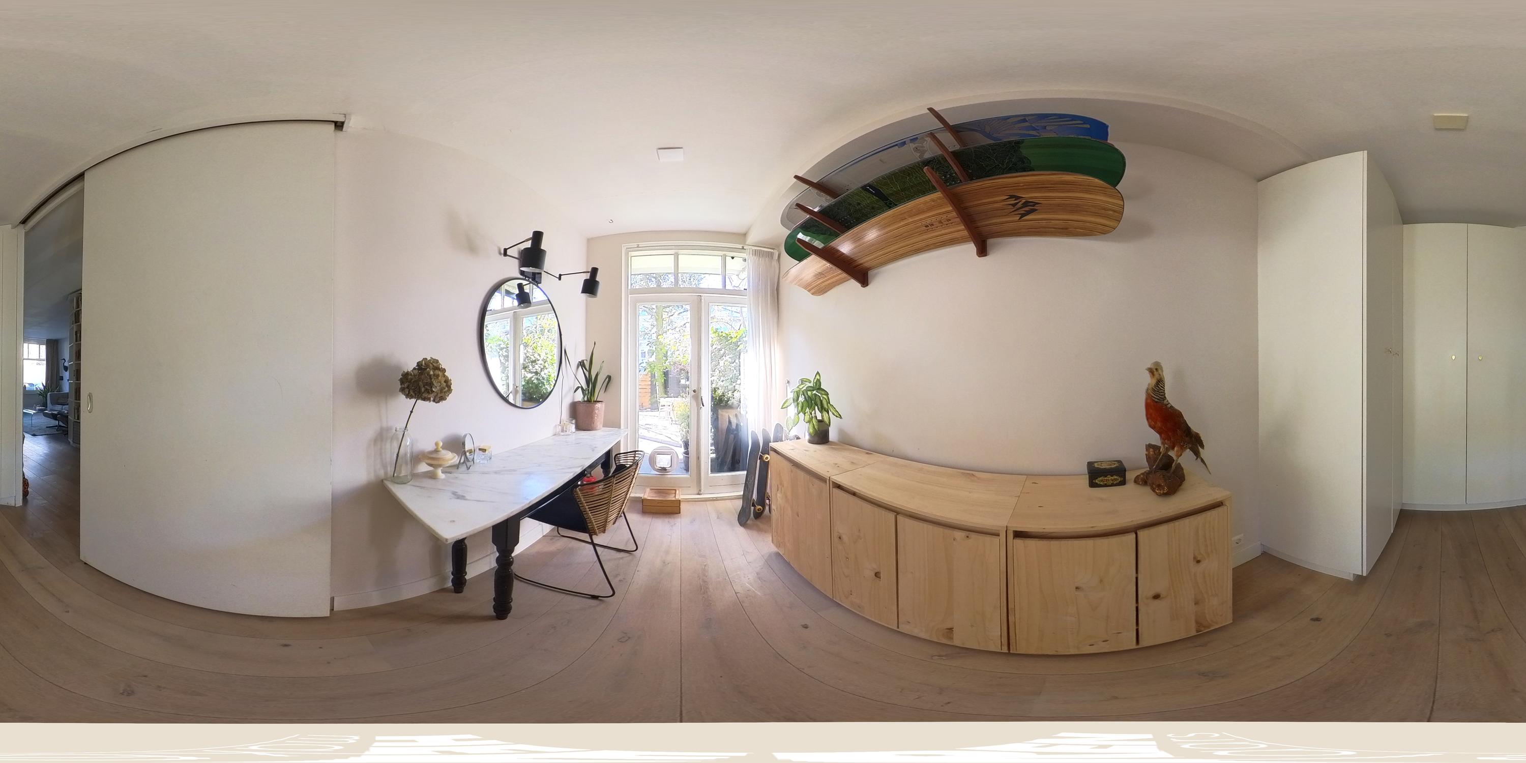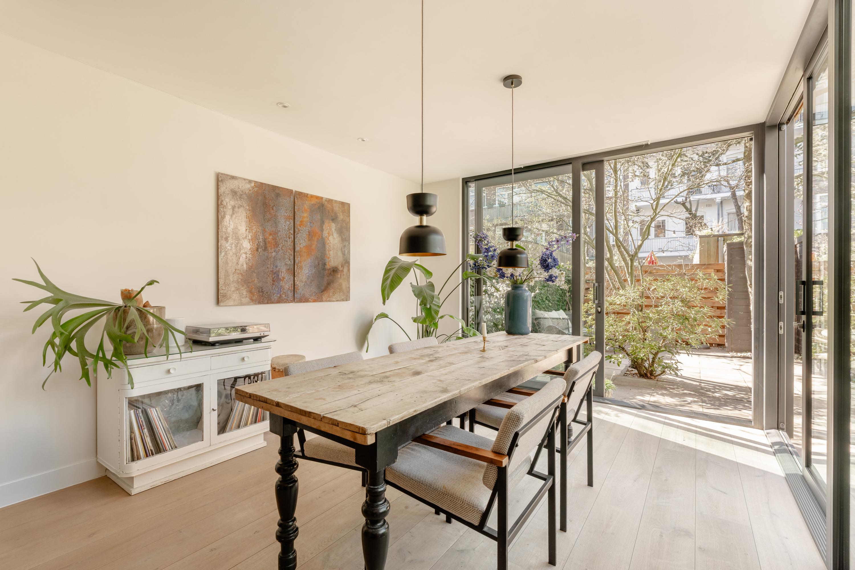 Aan de achterzijde bevindt zich een separate slaap-, werk- of studeerkamer met praktische inbouwkasten en openslaande deuren naar de tuin. Aansluitend treft u de fraaie uitbouw met een royale open keuken, voorzien van diverse inbouwapparatuur, waaronder een elektrische oven, inductiekookplaat met geïntegreerde afzuiging, koel-/vriescombinatie en een Quooker met kokend- en bruiswater.