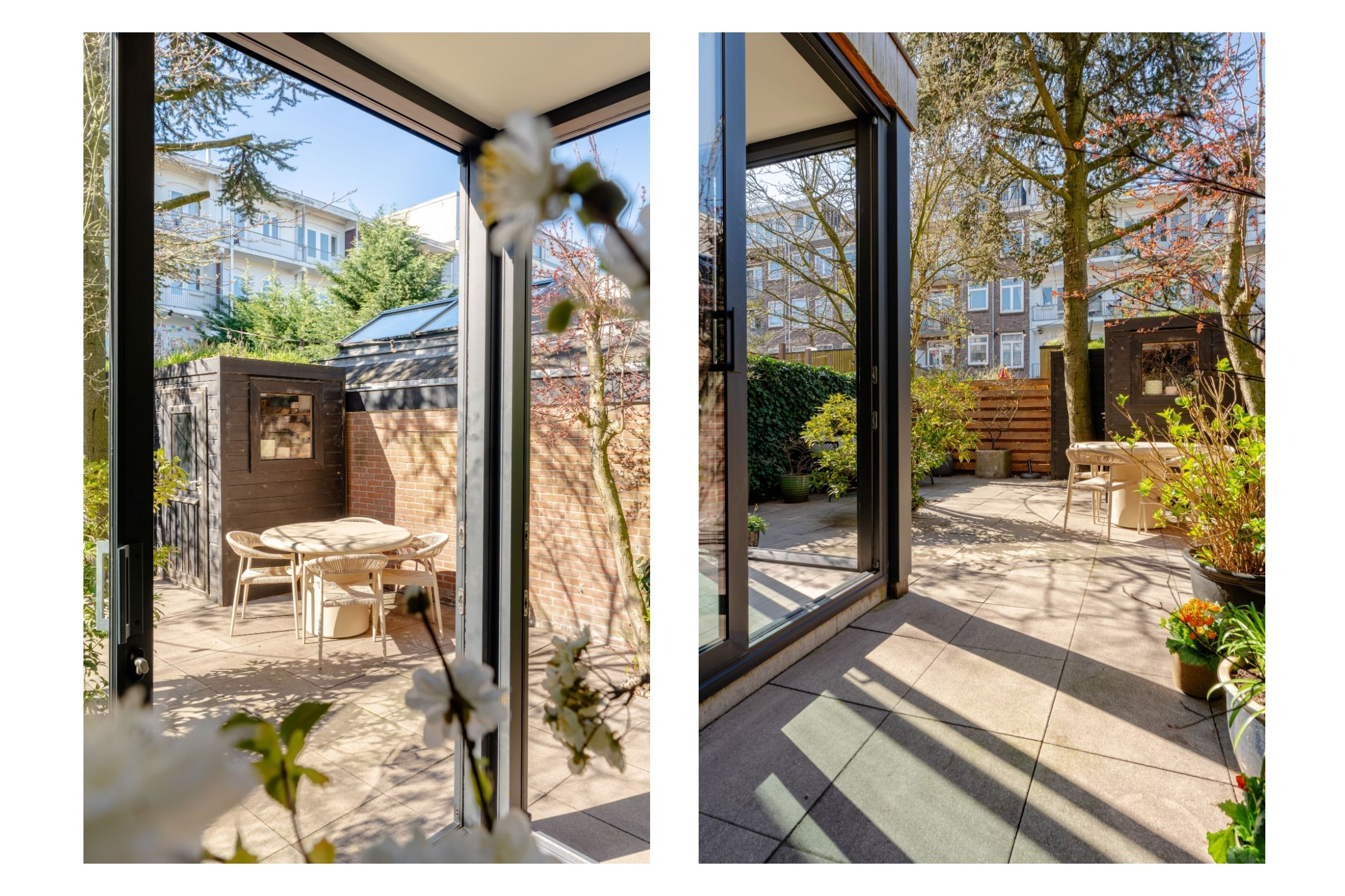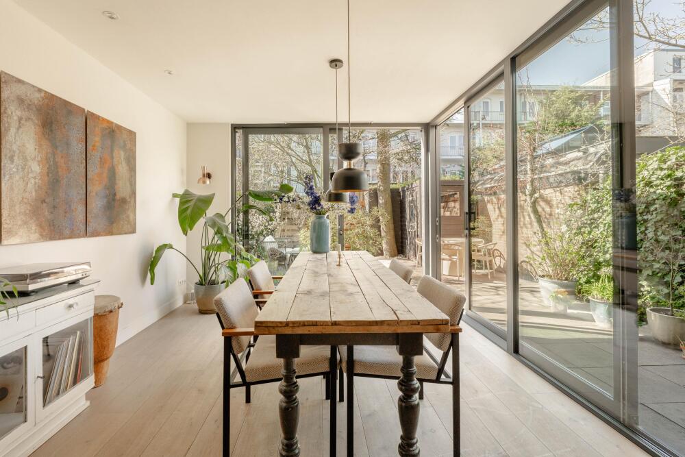 Dankzij de rondom geplaatste schuifpui is er een naadloze verbinding tussen binnen en buiten en staat de leefruimte in direct contact met de zonnige achtertuin. De tuin is verzorgd aangelegd en beschikt over een praktische schuur voor extra bergruimte.