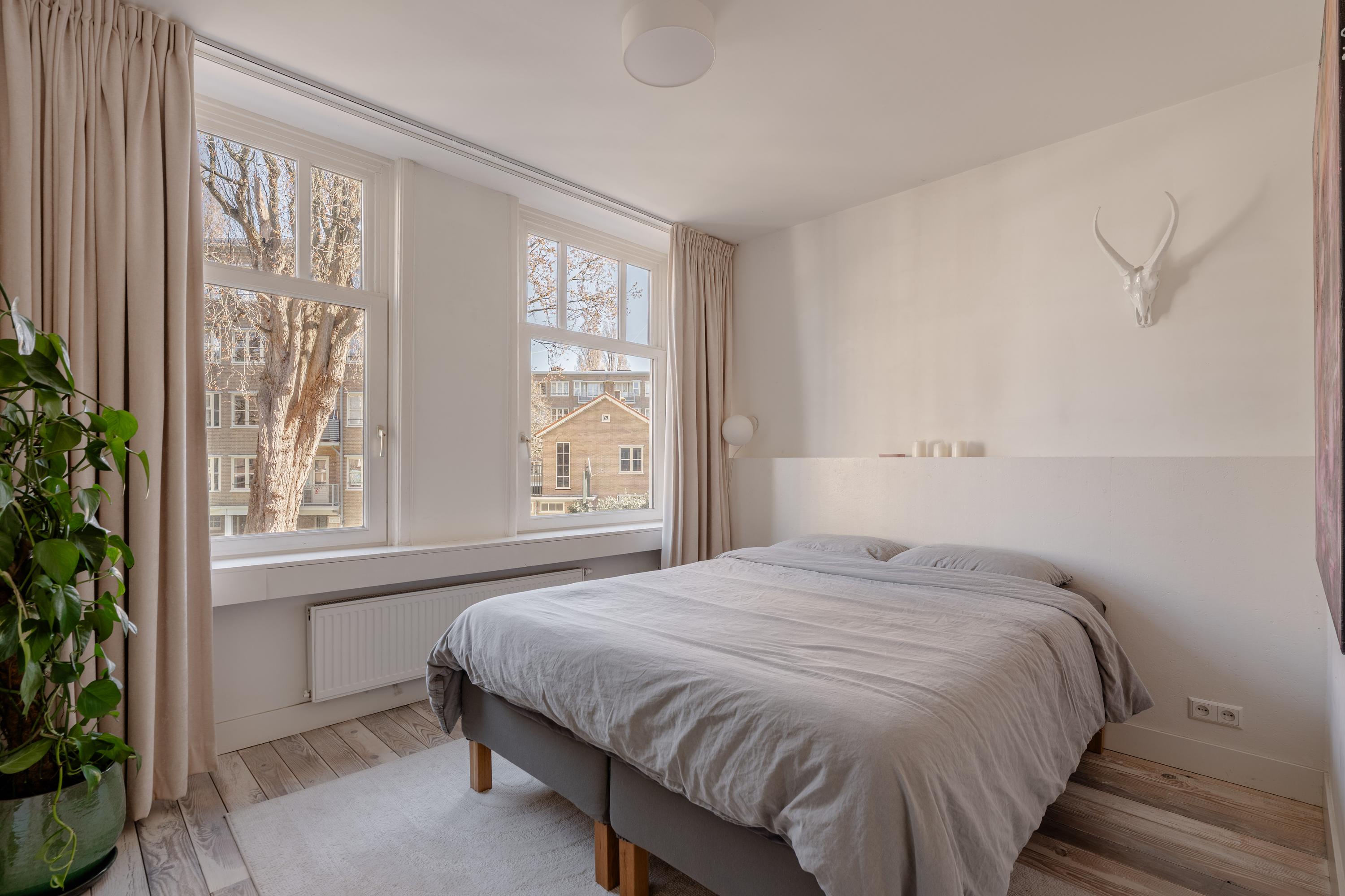 Aan de achterzijde van de woning bevinden zich twee goed bemeten slaapkamers, beide voorzien van openslaande deuren naar het balkon. Hierdoor ontstaat een fijne verbinding tussen binnen en buiten en genieten de kamers van veel licht en een groen uitzicht.