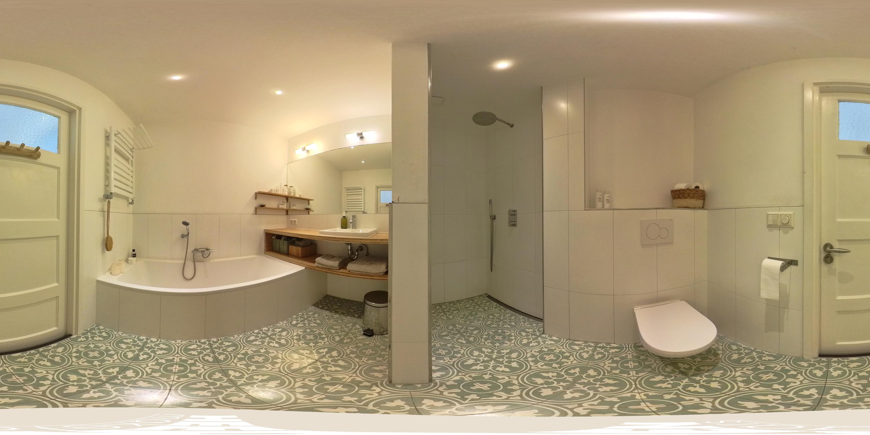 Op de overloop bevindt zich de moderne badkamer, uitgevoerd in een rustige en verzorgde stijl en voorzien van een ligbad, inloopdouche, toilet en een fraaie wastafel met meubel.