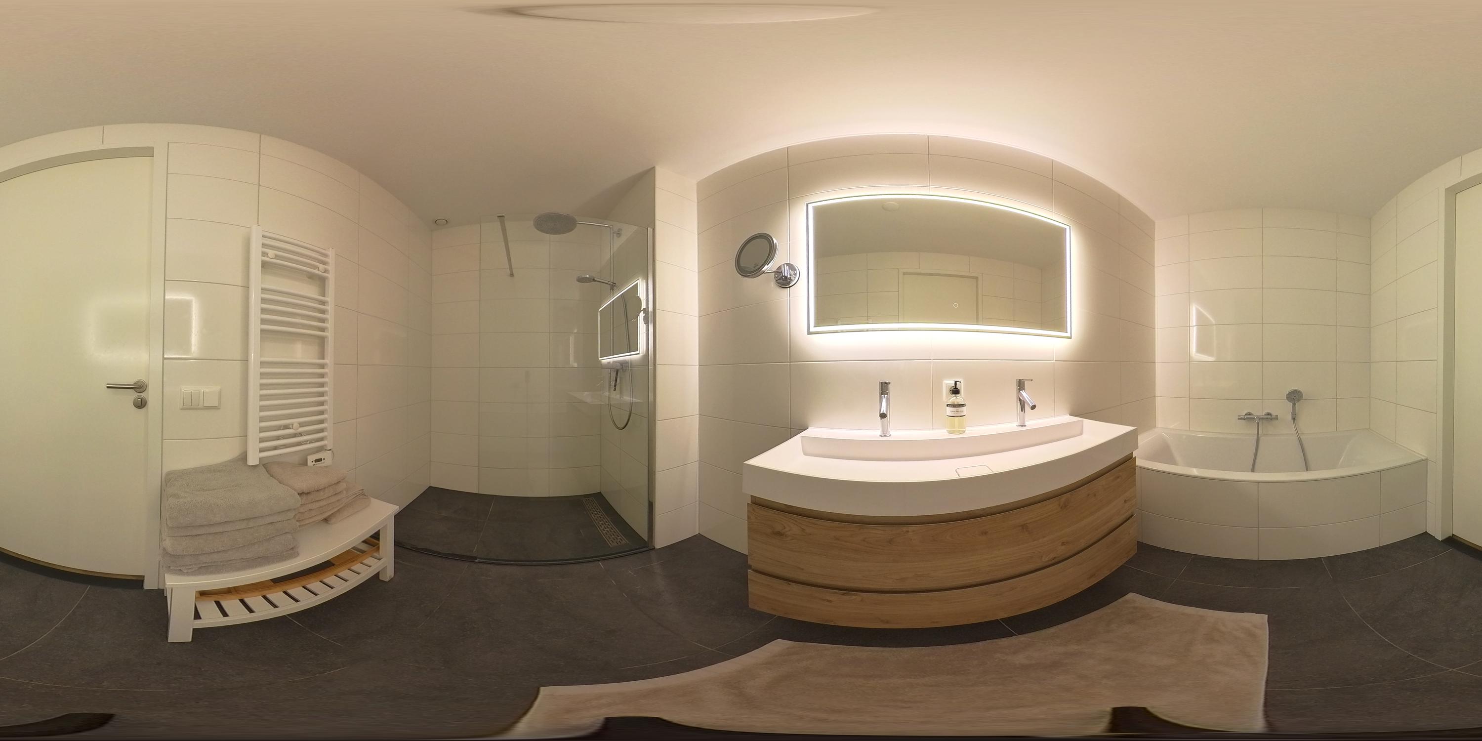 De badkamer is modern en comfortabel ingericht met een inloopdouche, ligbad, dubbel wastafelmeubel en een grote spiegel met geïntegreerde verlichting en verwarming. Aan het einde van de hal bevindt zich de lichte woonkamer met grote raampartijen rondom – een fijne leefruimte met uitzicht op de omliggende omgeving en het groen. De woonkamer en open keuken lopen vloeiend in elkaar over en bieden samen een prettige, open indeling.