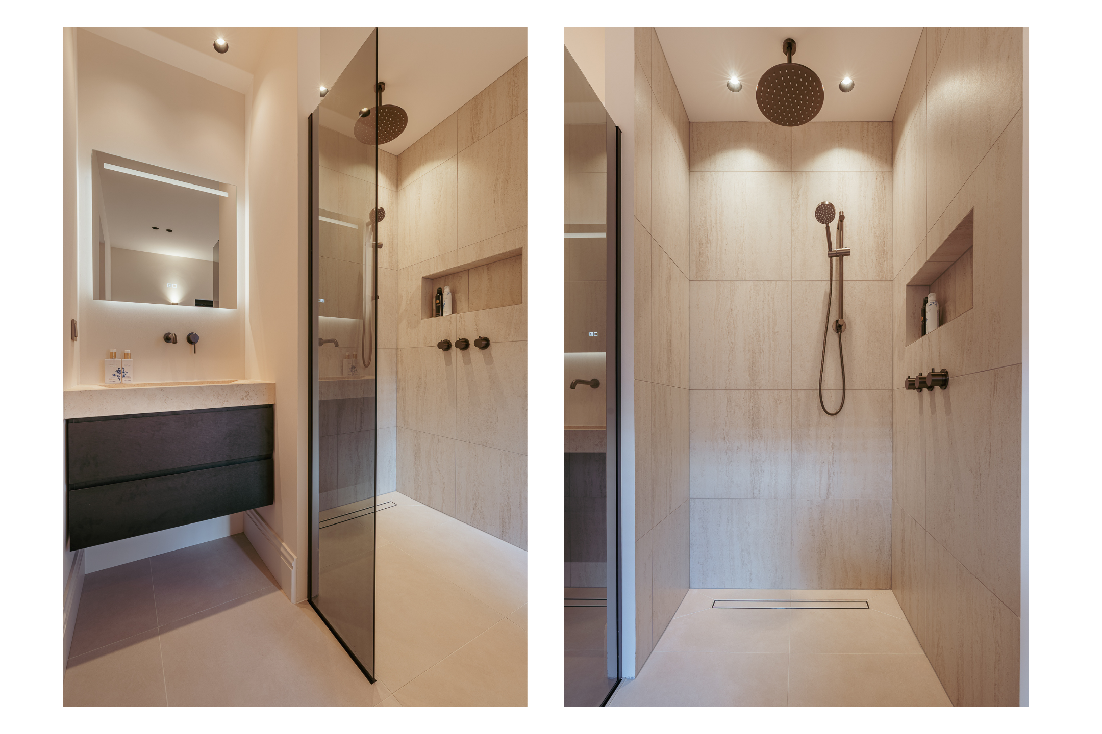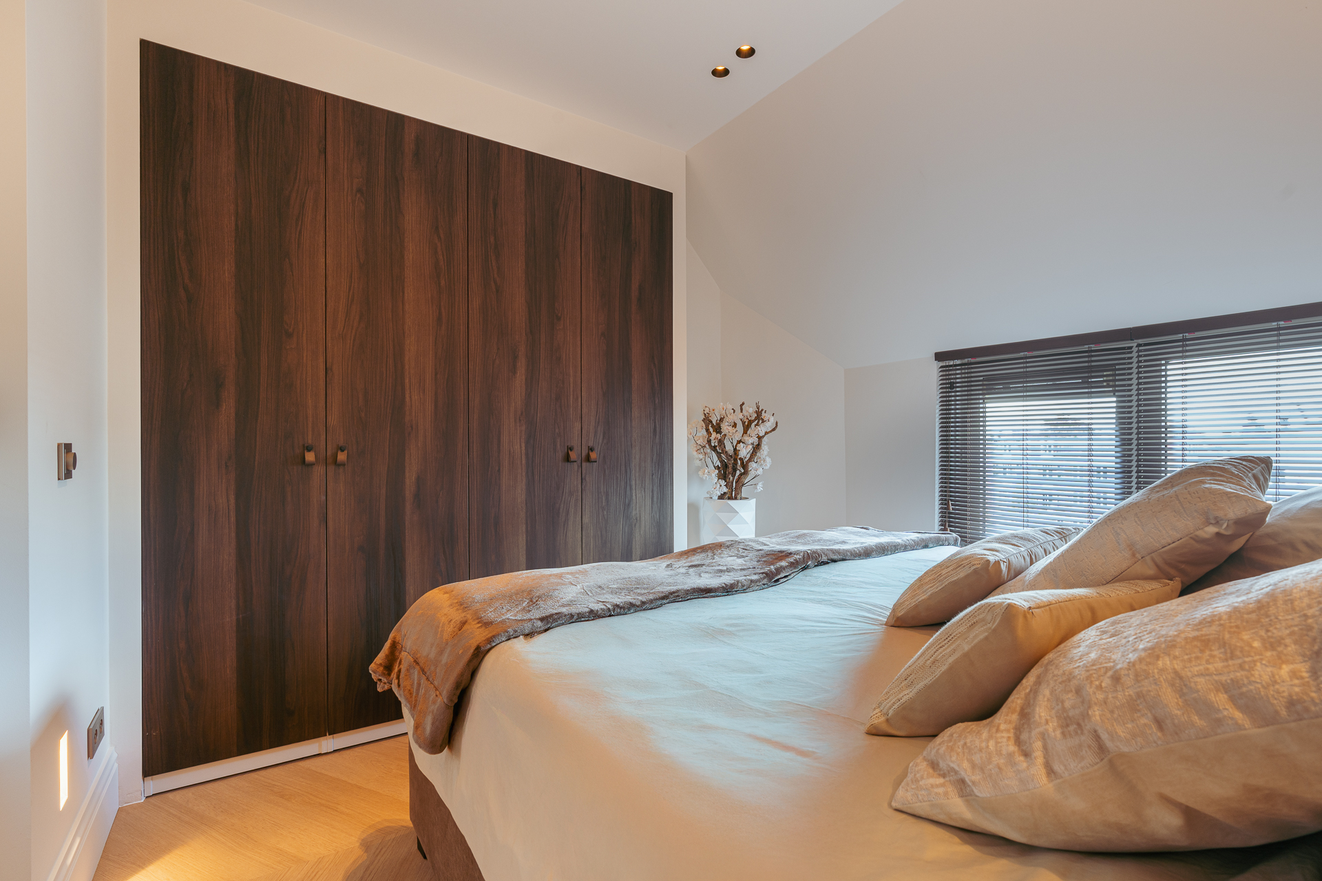 Vanuit de hal heeft u toegang tot de badkamer en twee slaapkamers. De eerste, aan de voorzijde, is multifunctioneel inzetbaar en leent zich ook uitstekend als kinder-, werk- of studeerkamer. Hier bevindt zich tevens de vernieuwde meterkast met 3-fase aansluiting. Aan de achterzijde ligt de master bedroom met fraaie inbouwkasten en directe toegang tot de royale luxe badkamer. Deze is uitgerust met Villeroy en Boch ligbad, inloopdouche en stijlvol natuurstenen wastafel. De badkamer kan met een geïntegreerde schuifdeur worden afgesloten van de slaapkamer indien gewenst.