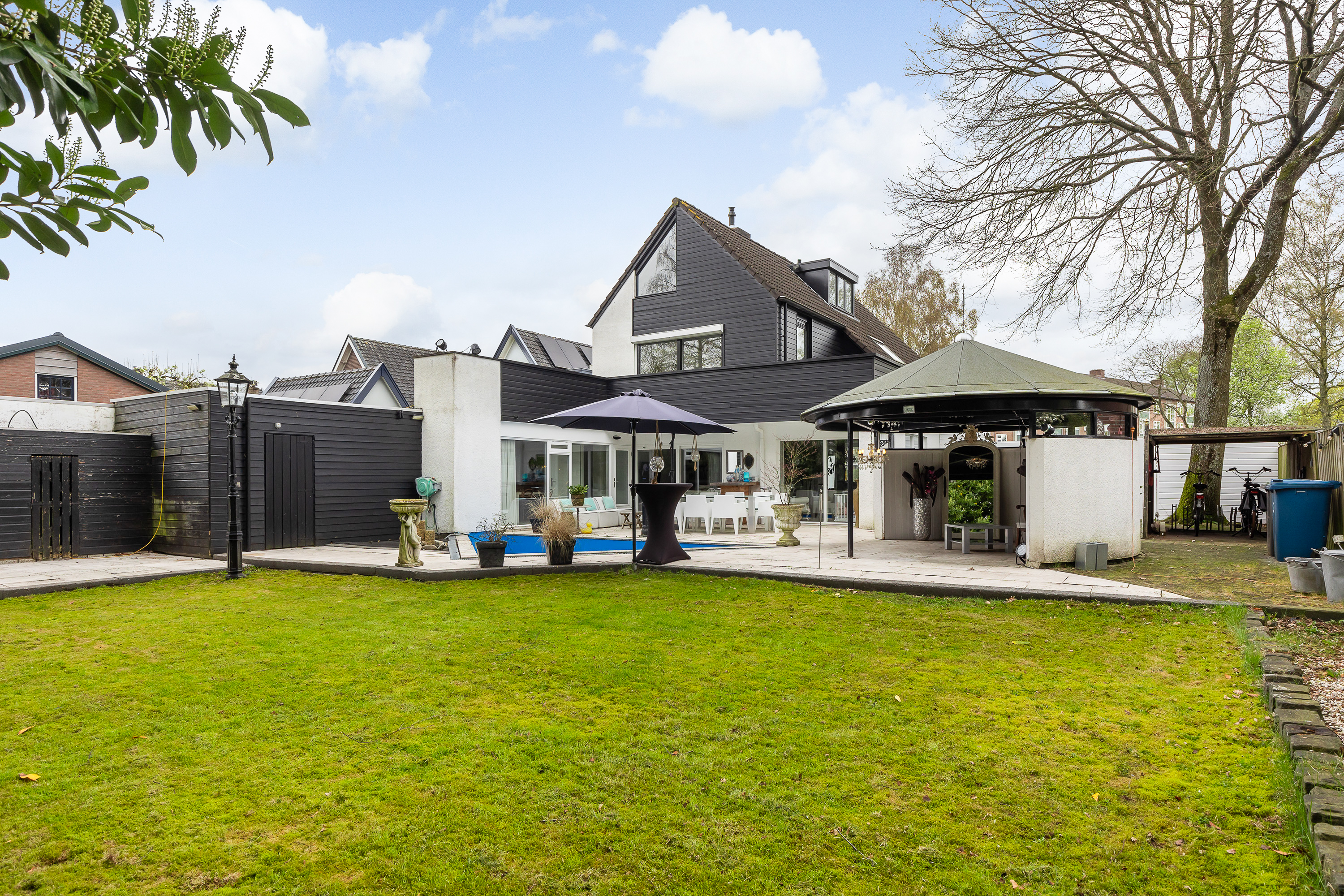 Met een woonoppervlakte van maar liefst 230 m² biedt deze woning uitzonderlijk veel ruimte voor zowel wonen als werken. De woning werd in 1987 ontworpen en gebouwd door een architect als eigen woonhuis, wat zichtbaar is in de bouwkwaliteit en de doordachte indeling. De entreehal met dubbele deuren geeft toegang tot een royale T-vormige living en een ruime woonkeuken, beide voorzien van vloerverwarming. De tuinkamer, geïsoleerde voormalige garage, zes slaapkamers en twee badkamers maken de woning multifunctioneel. De vele raampartijen zorgen voor een prettige lichtinval en dragen bij aan het aangename woonklimaat.