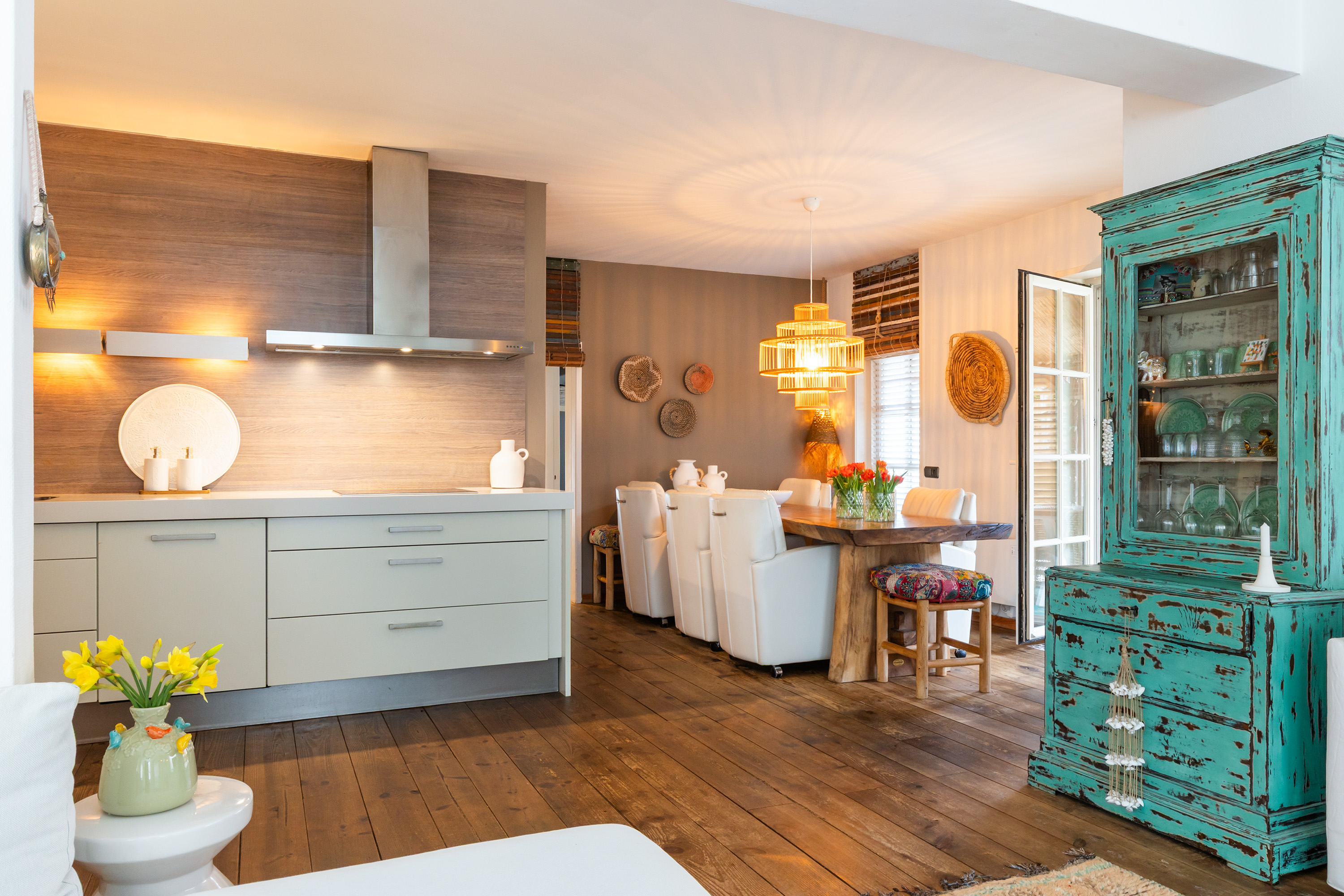 Er is ruimte voor een grote eettafel met acht stoelen en de dubbele tuindeuren verbinden de woonkeuken met de veranda in de zijtuin. Hierdoor lopen binnen en buiten naadloos in elkaar over. De veranda heeft een zonnige uitstraling door de toepassing van houten vlonders en houten louvre-schermen die tevens als zonwering dienen. Het is een heerlijke plek om een eettafel te plaatsen en beschut buiten te dineren en te genieten van mooie momenten met vrienden en familie.