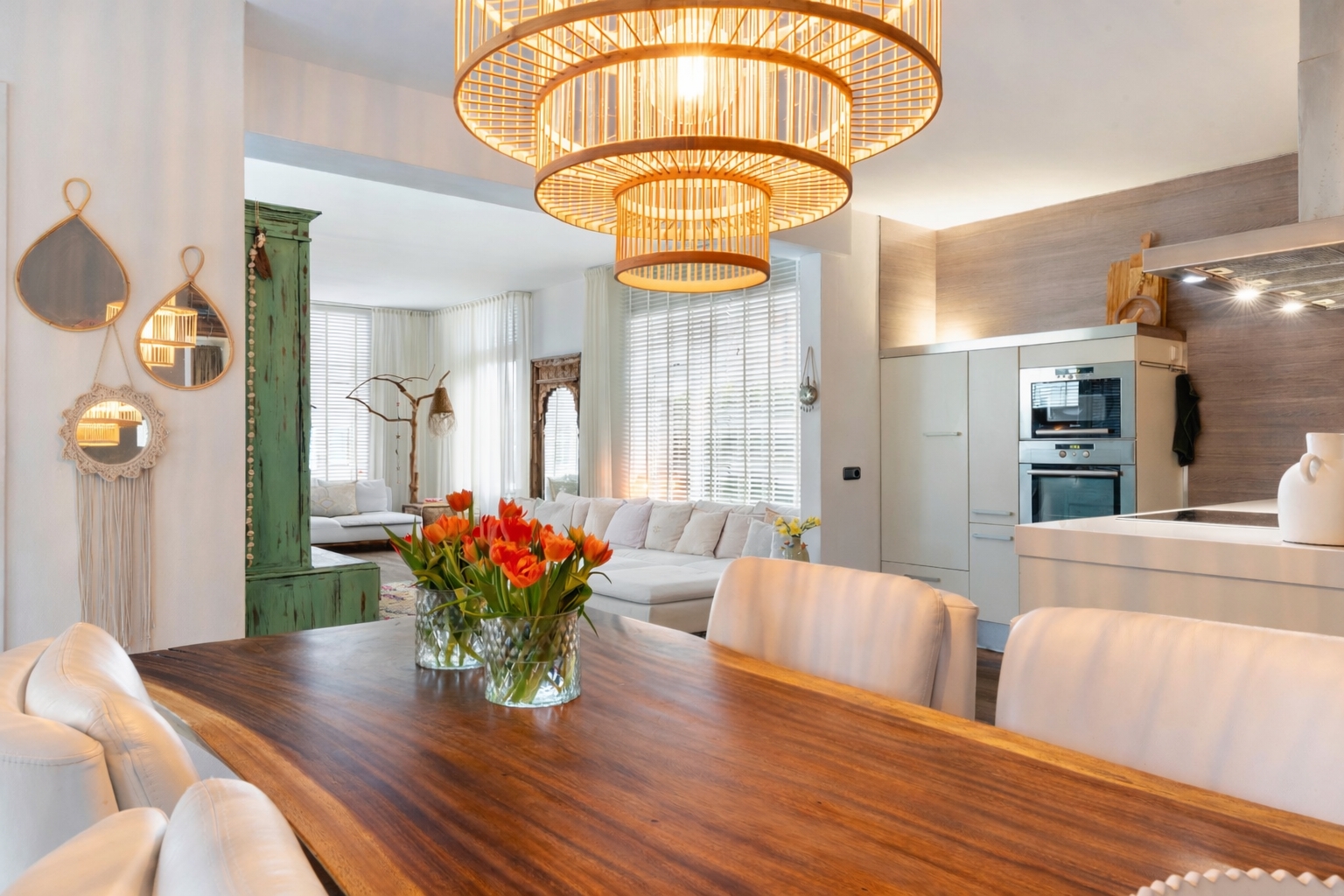 De omvang van de leefruimte is aan de voorzijde van de woning nauwelijks waarneembaar. Pas bij binnenkomst ontvouwt zich de volledige ruimte, met meerdere woon- en slaapmogelijkheden, twee badkamers, twee garages, twee veranda’s en een zonnige, volledig besloten tuin met zwembad. De huidige afwerking is geheel eigentijds en geïnspireerd op een warme Zuid-Europese Ibiza-stijl. De gevels zijn in 2026 in een warme tint uitgevoerd en voorzien van karakteristieke louvre-luiken. In combinatie met de zonnige terrassen en het zwembad ontstaat een ontspannen, bijna mediterrane woonbeleving.