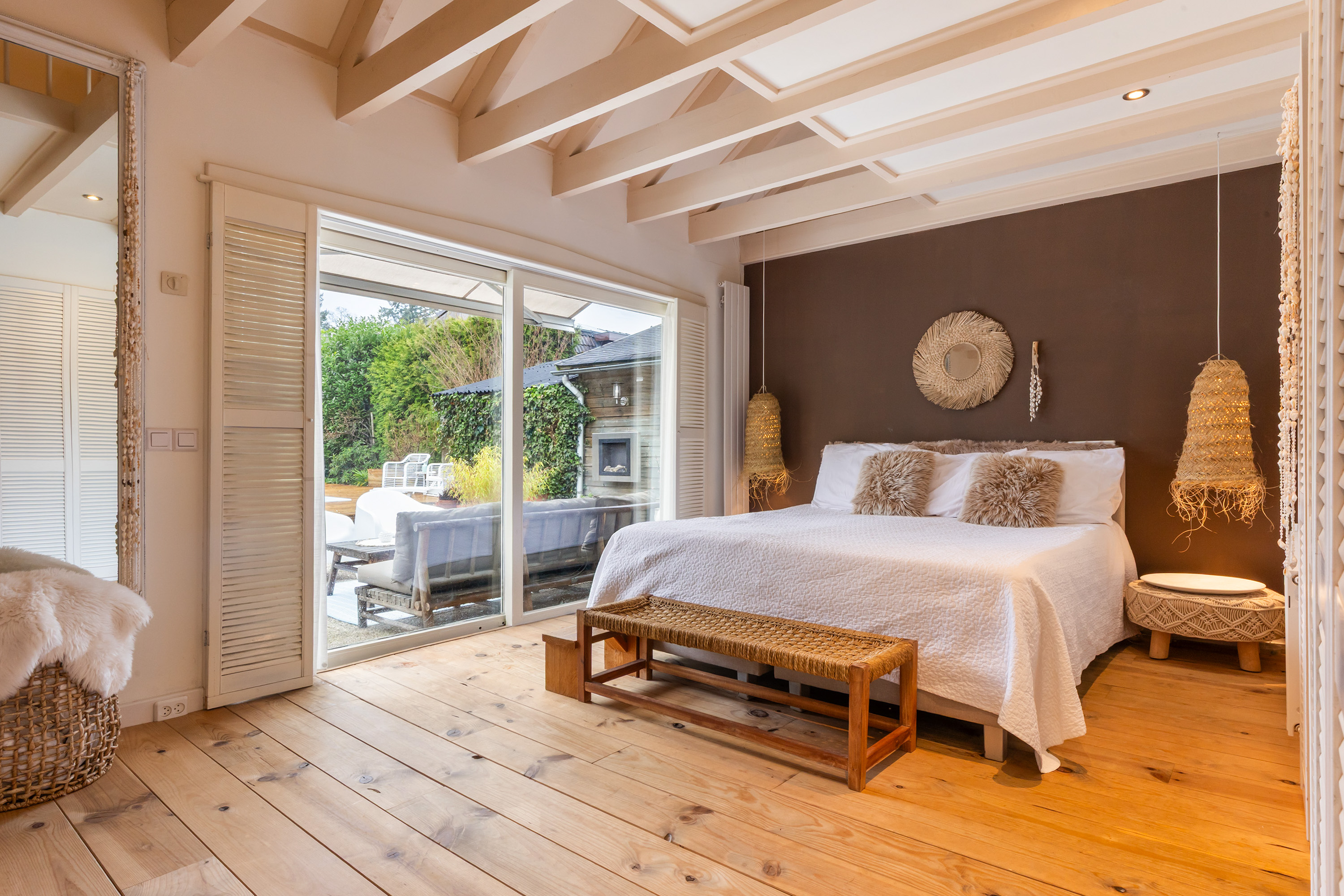 Daarachter bevindt zich een royale hoofdslaapkamer met een eigen luxe badkamer. De slaapkamer heeft een bijzonder karakter door de zichtbare balken en een vaste trap naar een ruime vide. Deze kan uitstekend dienen als werkplek, studeerruimte of extra bergruimte. Zowel boven als beneden zijn praktische inloopkasten aanwezig. Via een schuifpui vanuit de slaapkamer loopt u direct de tuin in.
