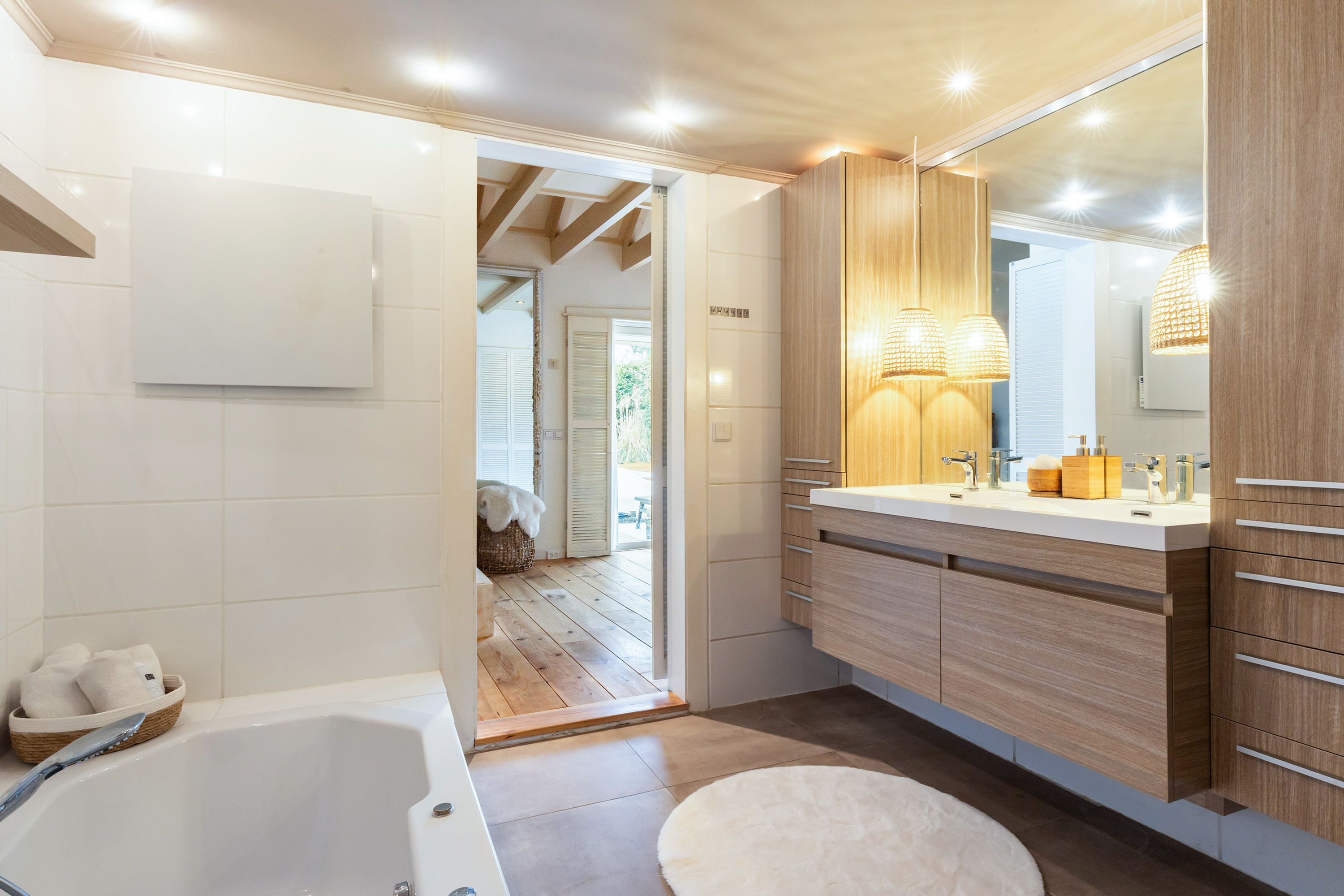 Aangrenzend bevindt zich de moderne badkamer, compleet uitgevoerd met een verdiept ligbad, een ruime inloopdouche, een wandhangend toilet en dubbele wastafels. De wanden zijn volledig betegeld en de ruimte heeft een moderne en warme uitstraling.