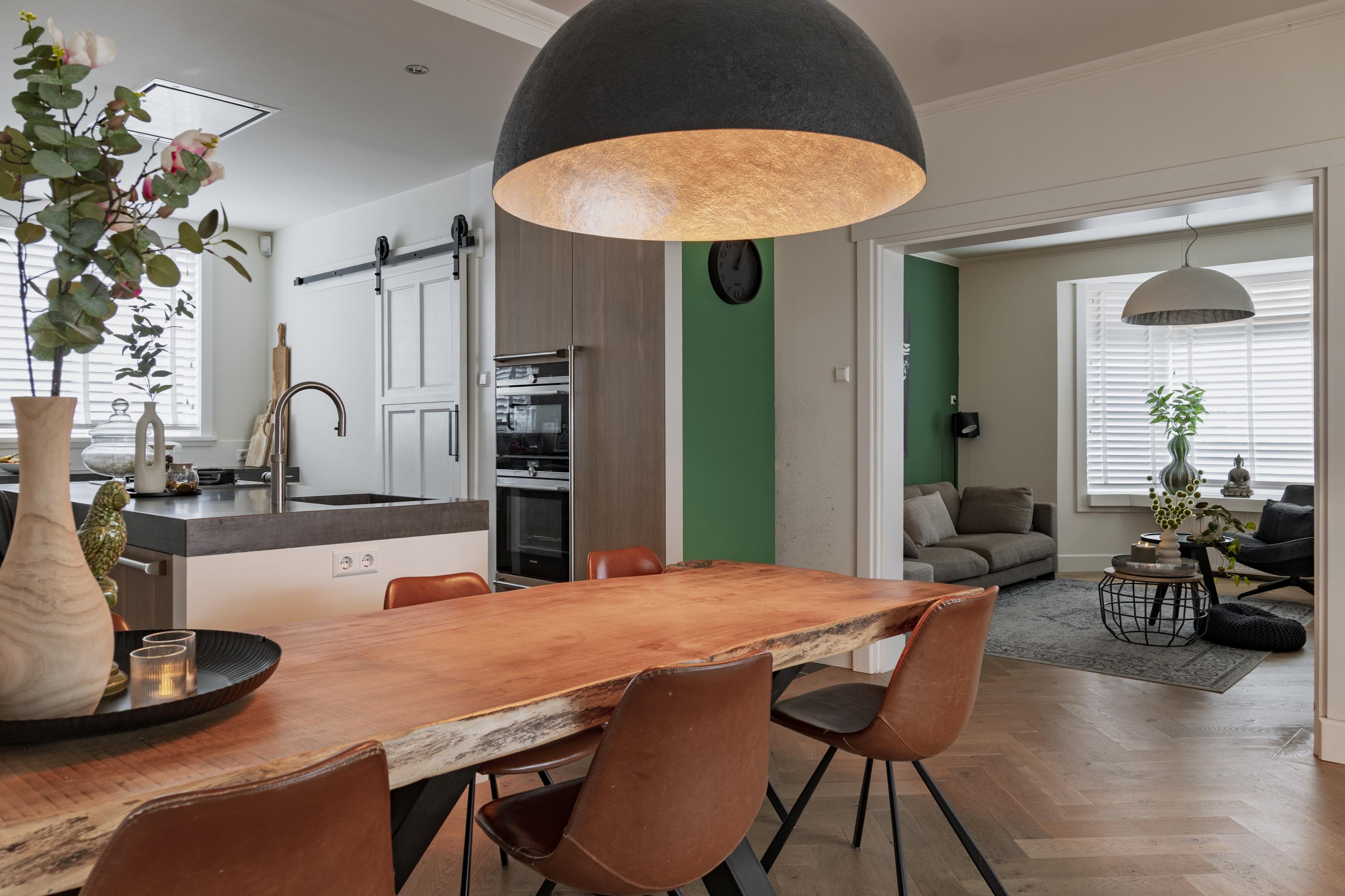 Entree met originele granitovloer, trapopgang, toilet en toegang tot de ruime kelder. De woonkamer met erker en houthaard biedt een fijne, royale leefruimte met volop mogelijkheden voor een comfortabele loungehoek. De luxe woonkeuken vormt het hart van de woning: ruim, licht en stijlvol afgewerkt, met kookeiland en hoogwaardige inbouwapparatuur. Vanuit de keuken is er een prettige verbinding met de entree en met de achtergelegen bijkeuken, inclusief een separate wasruimte.