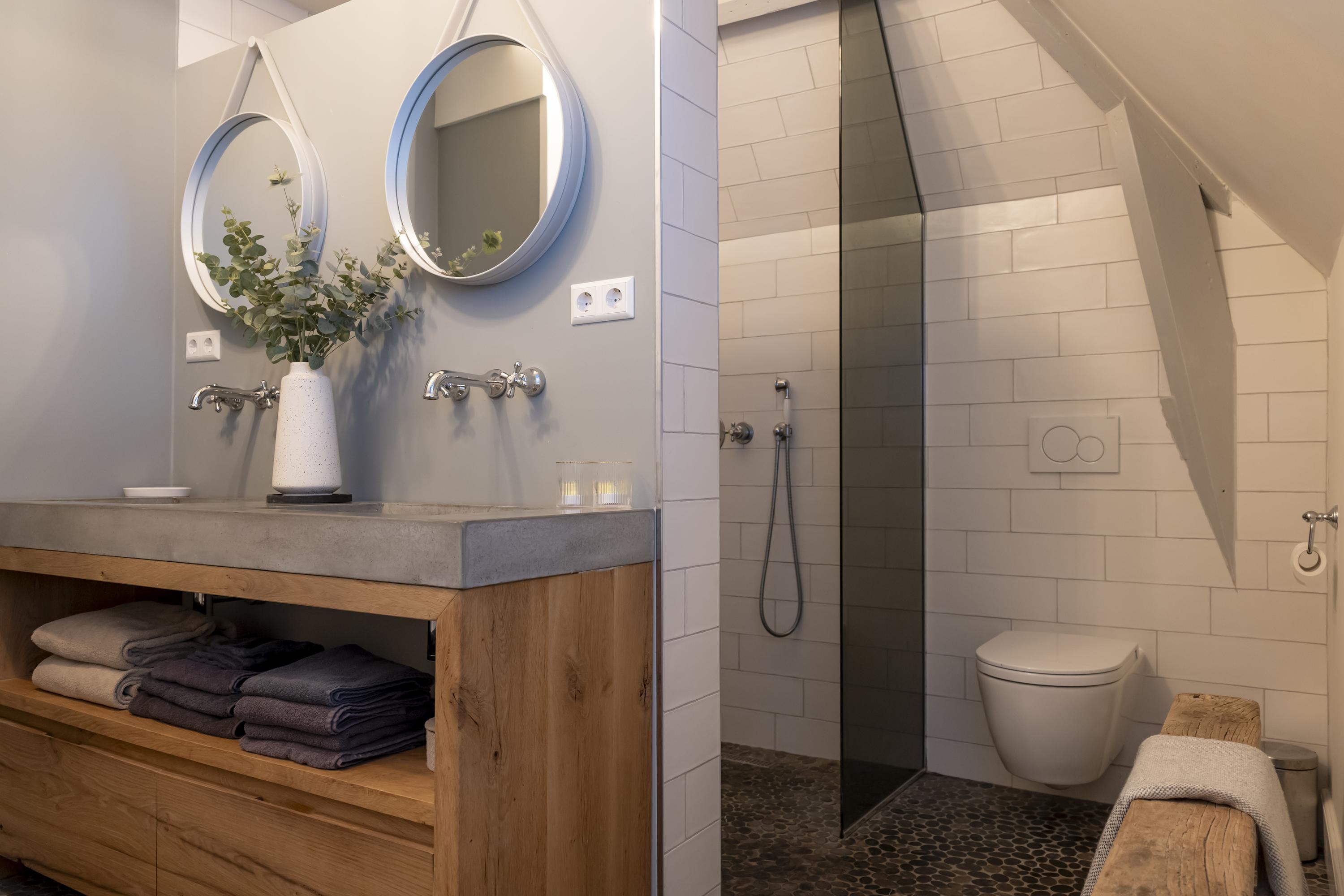Overloop met toegang tot drie ruime slaapkamers, allen geschikt voor een tweepersoonsbed. De moderne badkamer is stijlvol uitgevoerd en voorzien van een inloopdouche met stort- en handdouche, met een ingebouwde infrarood- en zonnebankfunctie in de douchewand, een dubbel wastafelmeubel en een wandhangend toilet.
