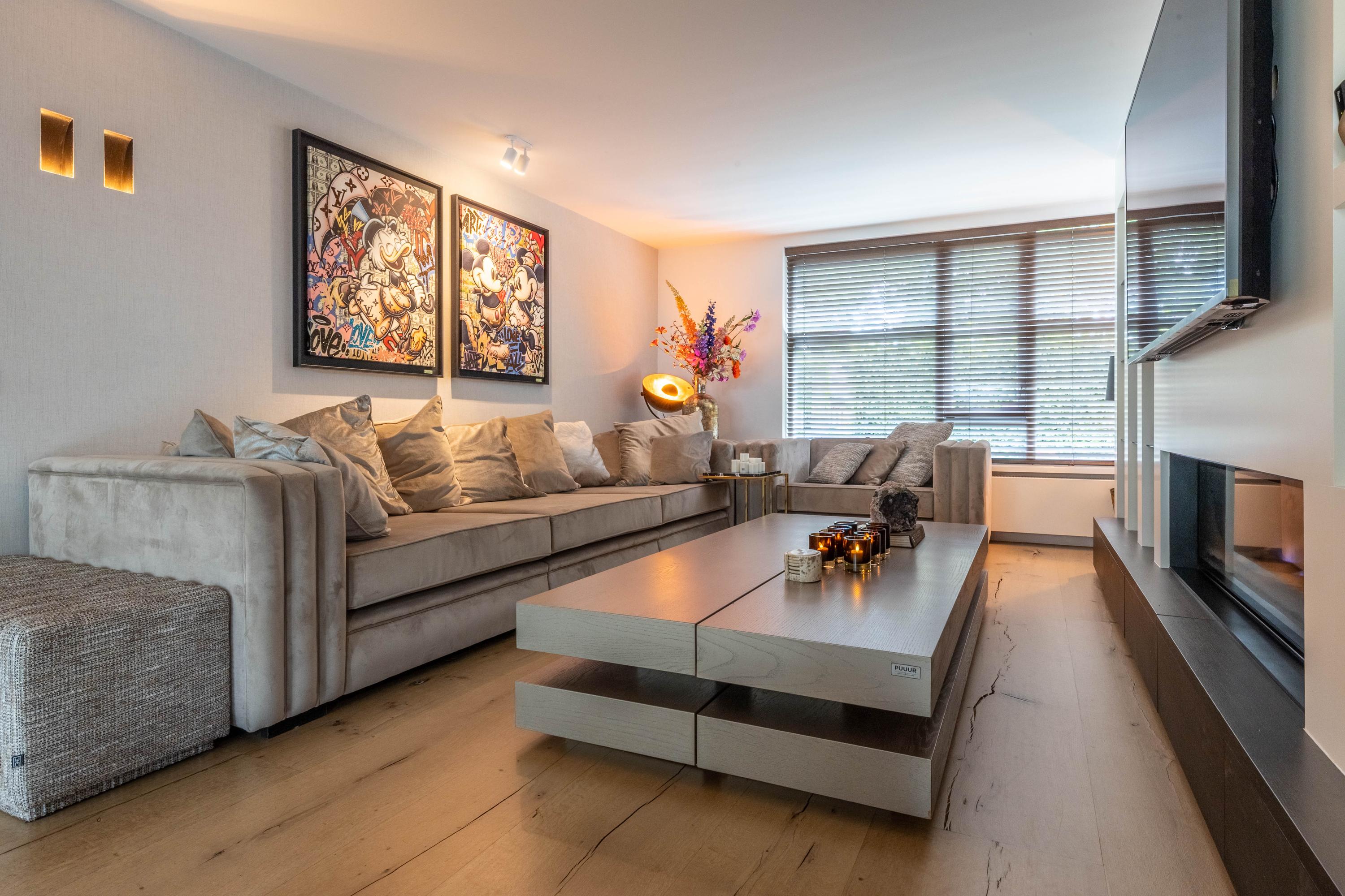 De living ademt rustige luxe, met een sfeervolle gashaard, maatwerkkasten en een geïntegreerde televisieopstelling. Grote raampartijen verbinden het interieur naadloos met de tuin; het lichtspel in huis is spectaculair.