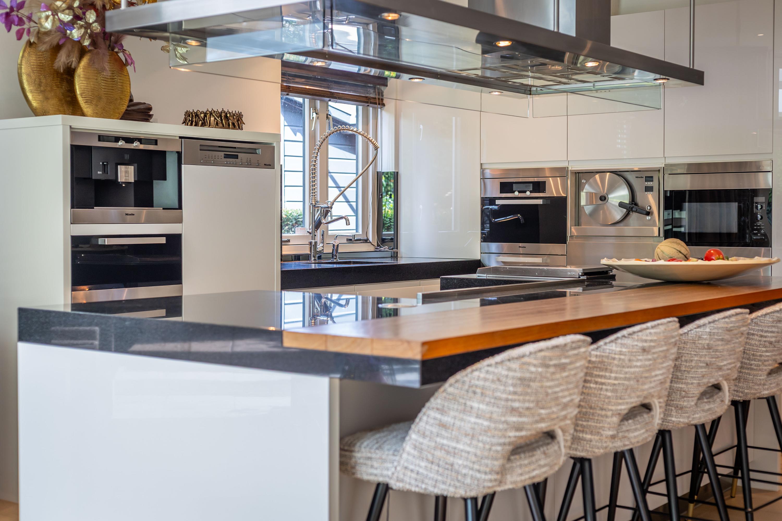 Het hart van het huis wordt gevormd door de ruime designkeuken van Arclinea met een granieten aanrechtbladen en een sculpturaal kookeiland met bar. Hierin is alle denkbare inbouwapparatuur: een vijf-pits kookplaat met wokbrander en een separate teppanyaki grill, een op maat gemaakt afzuigsysteem, een Quooker en een traditionele kraan, koffiemachine, 2 warmhoudlades, een bordenwarmer, vaatwasser op hoogte, een magnetron, combi-stoomoven en een hogedrukstoomoven. Alles is ontworpen om koken tot een verfijnde belevenis te maken.