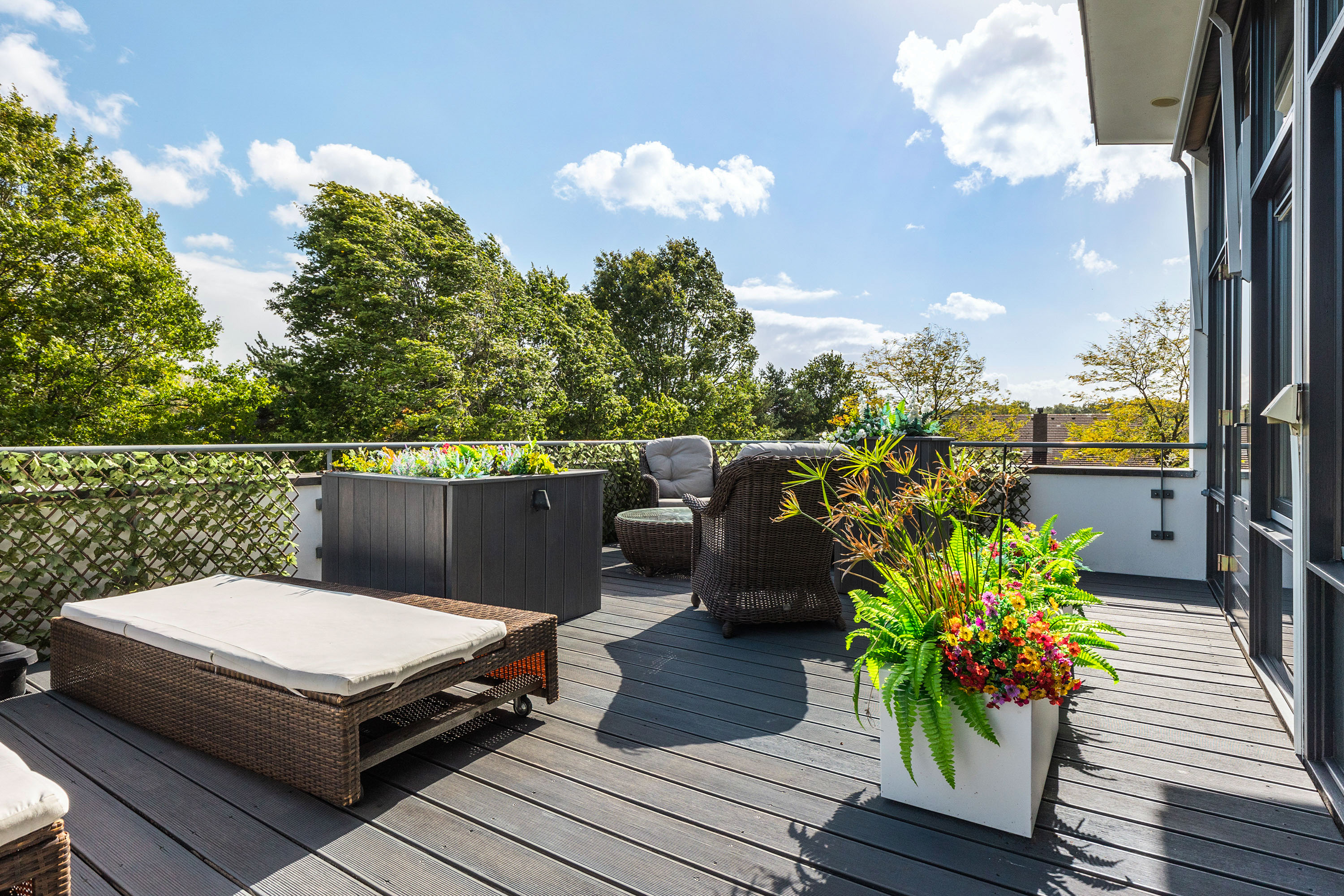 Drie grote slaapkamers bieden eveneens luxe maatwerk; één ervan heeft toegang tot een eigen dakterras. Op de overloop is een tweede badkamer met dubbele wastafel, inloopdouche, bidet en apart toilet.