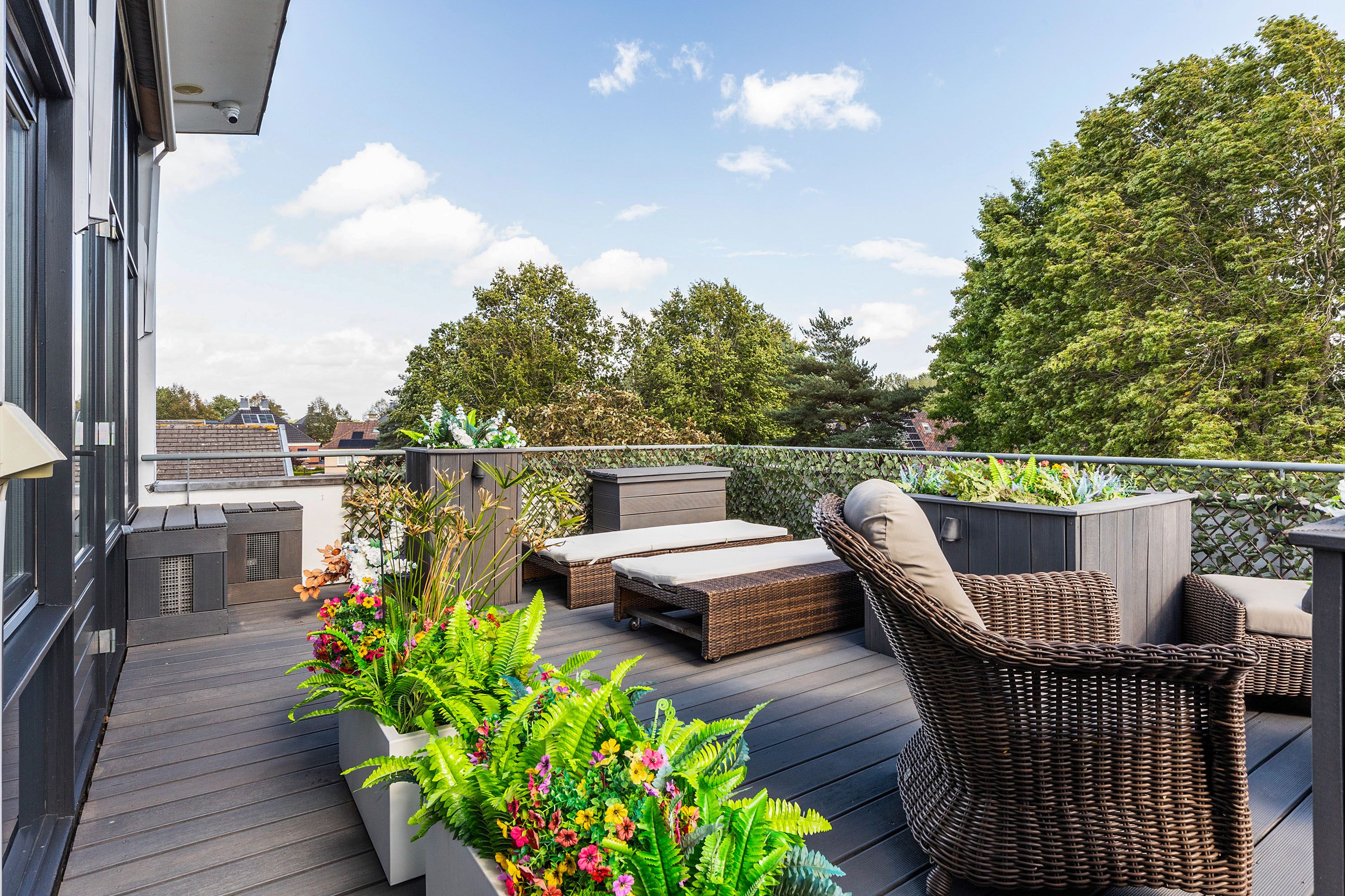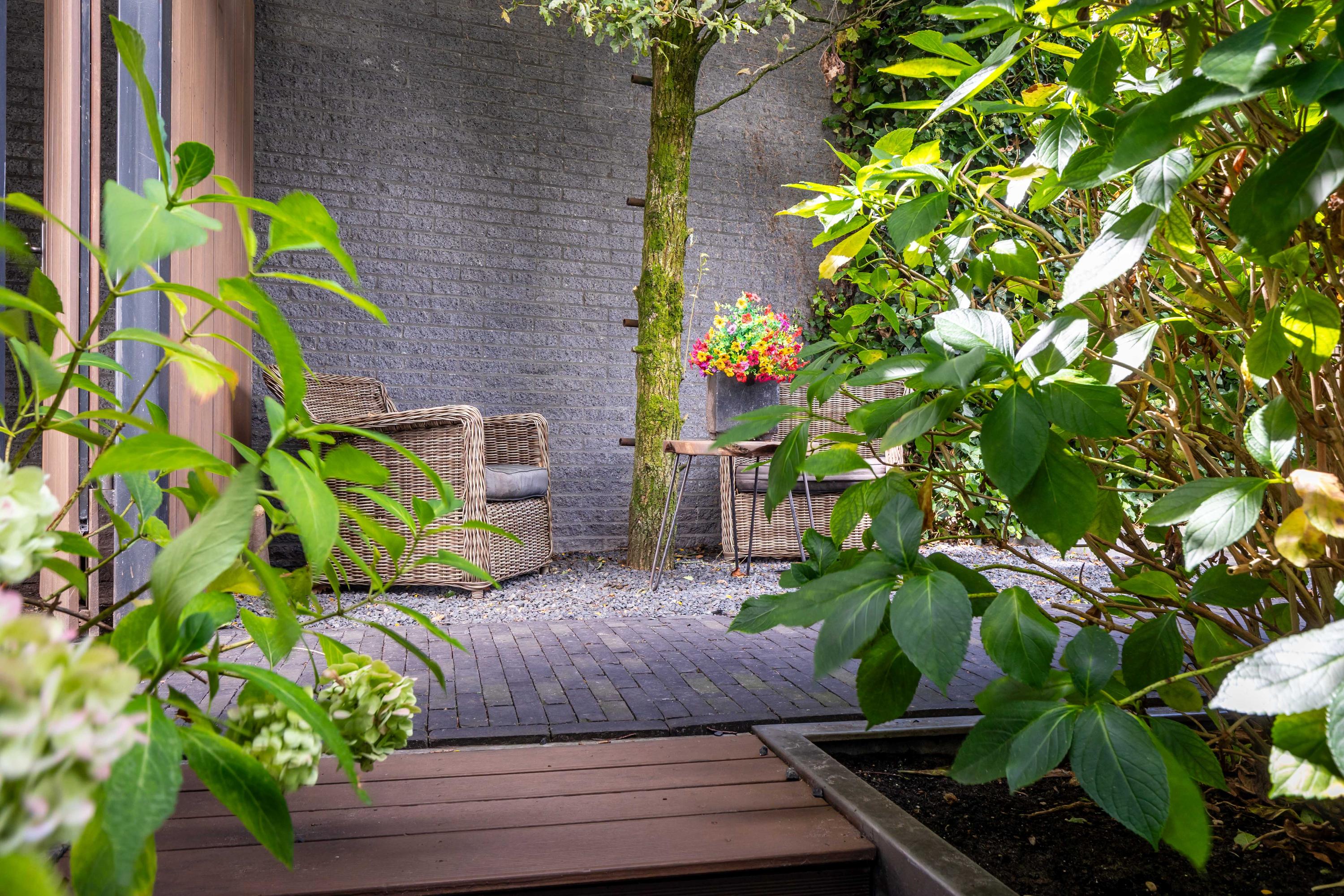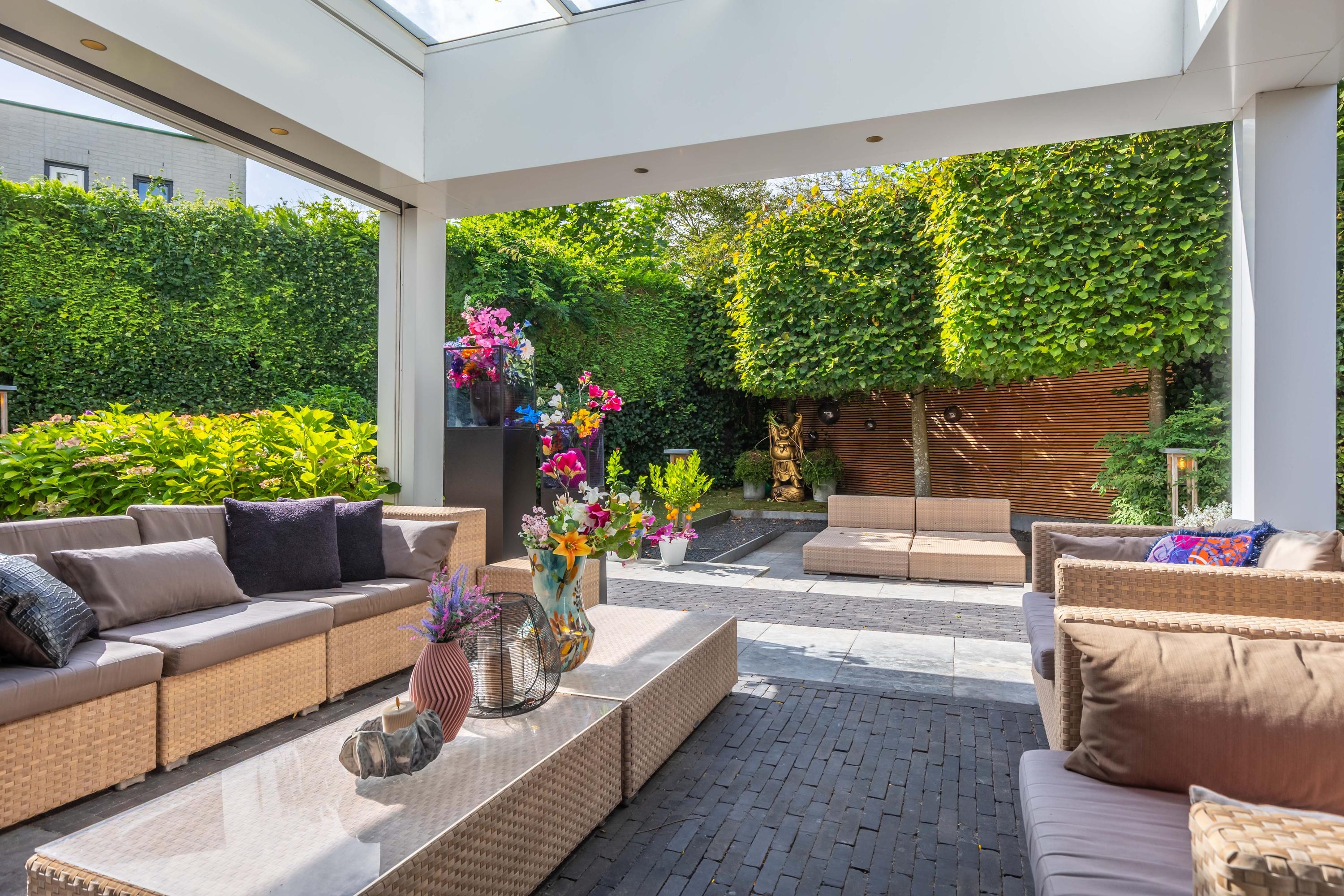 De in 2025 opnieuw aangelegde tuin is een oase van privacy en groen, gunstig gelegen op het zuidwesten. Meerdere terrassen bieden steeds een andere sfeerbeleving. De veranda is uitgevoerd met een riant hoog plafond waarin een grote lichtstraat is opgenomen. Het terras onder de veranda is daardoor aangenaam licht. Door de voorzieningen kunt u hier aangenaam in alle jaargetijden van de buitenruimte genieten met de sfeervolle open haard, een heater en windscreen. De twee balkons bieden besloten plekken om te ontspannen. De tuin beschikt over automatische beregening en is ideaal voor barbecues of lange zomeravonden.