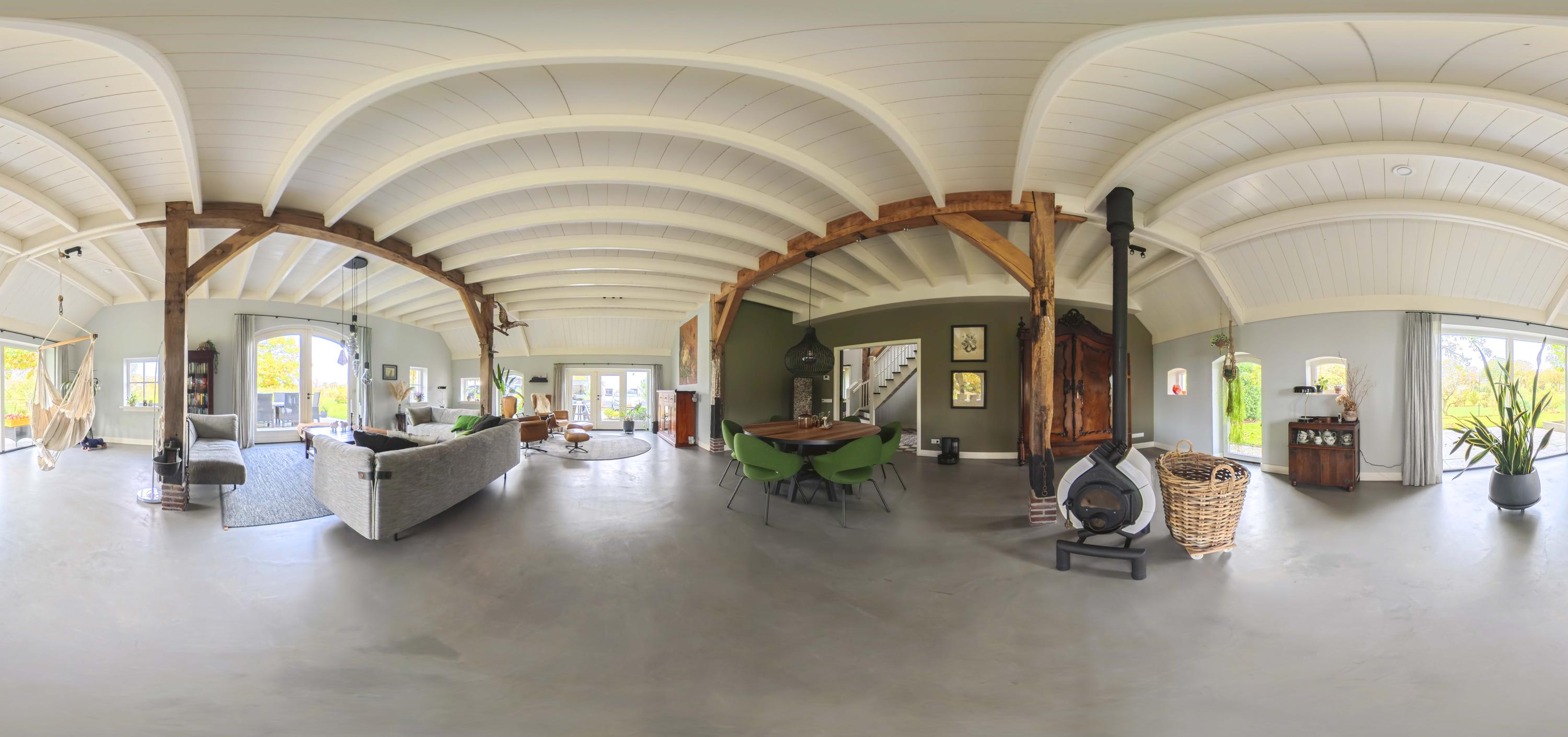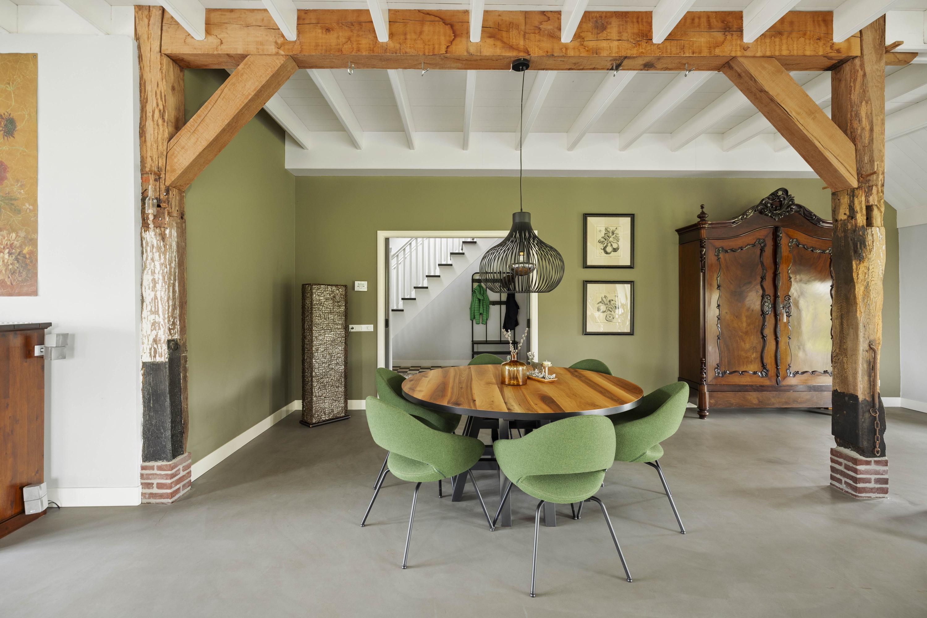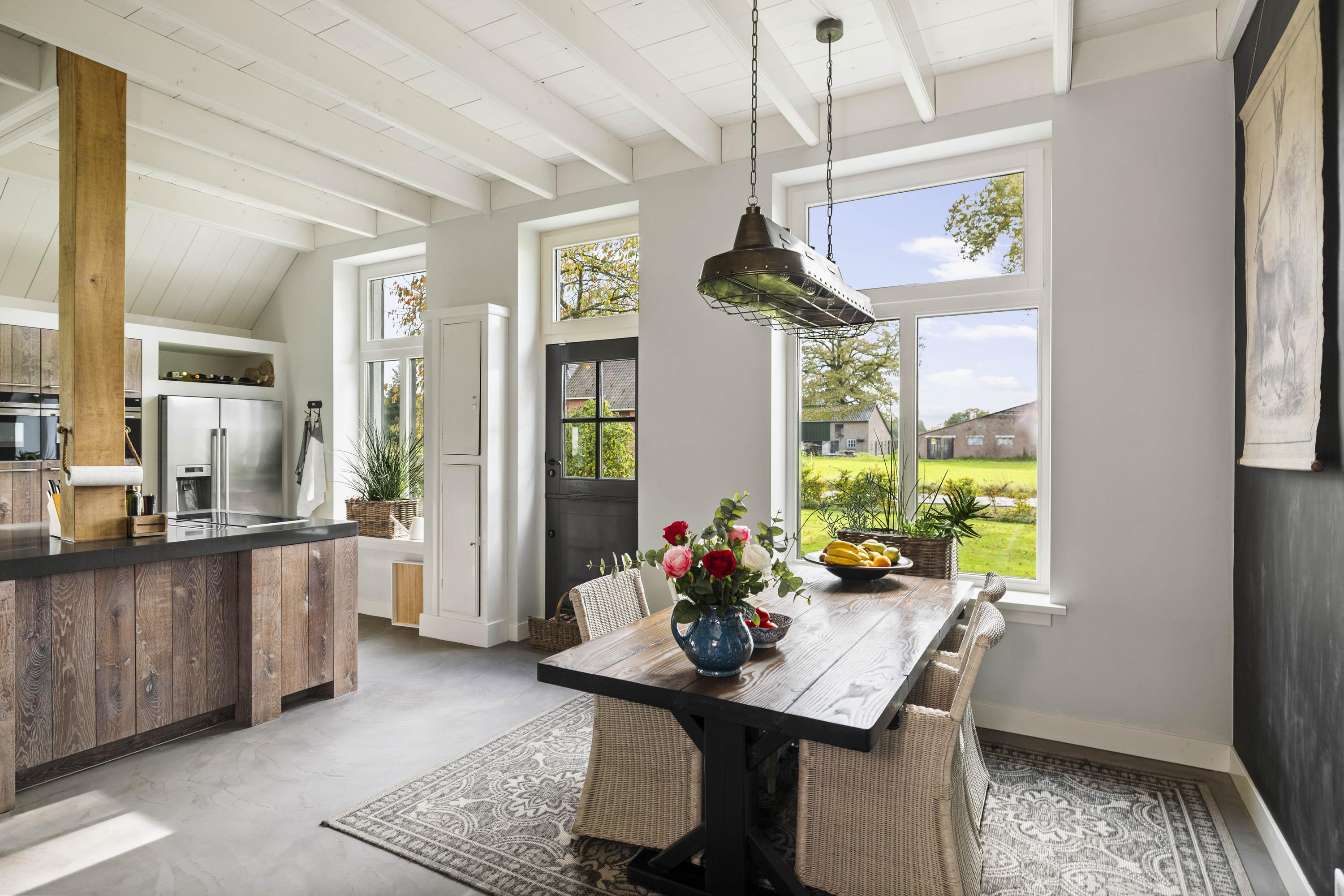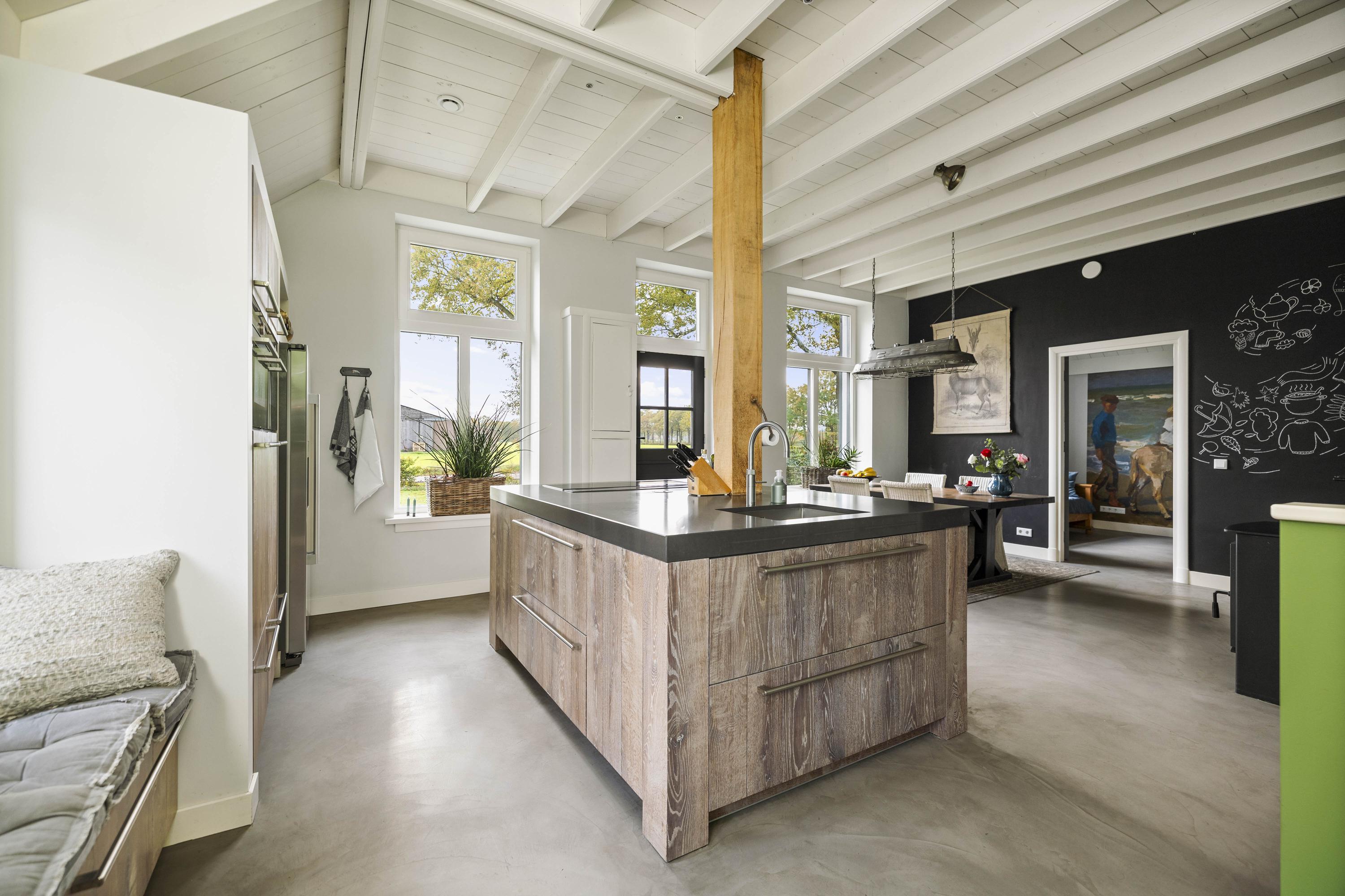 De keuken is maatwerk van Scheffer Keukens Zelhem en is ronduit indrukwekkend; met een dik, composiet werkblad, robuuste massief eiken fronten en alle moderne inbouwapparatuur – van inductieplaat tot Quooker - is het een heerlijke plek om je als chef-kok uit te leven. In de oude schouw staat nog een stoere Nordic Fire-houtkachel, die de keuken voorziet van extra sfeer en warmte.