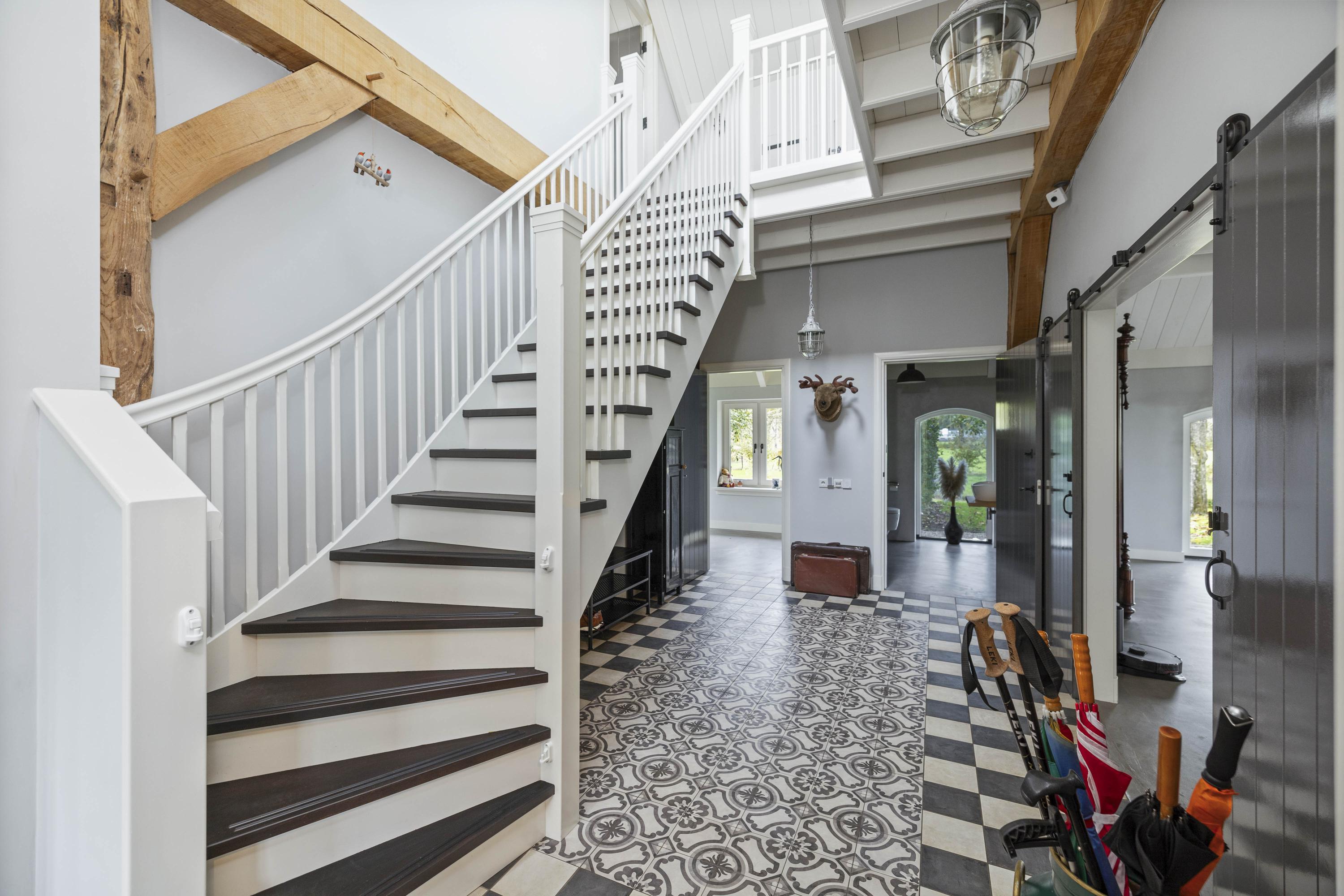 Deze magnifieke woonboerderij kreeg in 2016 haar huidige gestalte; toen werd de boerderij, die in 1924 gebouwd werd, van onder tot boven gerenoveerd. Hierbij lag de nadruk op verduurzaming; de buitenzijde werd volledig geïsoleerd met blokken styrofoam, rondom kreeg het huis nieuw HR+++-glas, er werd een water-water-warmtepomp aangelegd (die op 75 m diepte de warmte uitwisselt en ophaalt), de vloer binnen werd voorzien van een robuuste gietvloer – ideaal in combinatie met de vloerverwarming - en op de daken werden in totaal 110 (nee, dit is géén typfout) zonnepanelen gelegd. Onder de motorkap is dit huis één en al state-of-the-art technisch vernuft. Zelfs het kleurenpalet – de buitenzijde is wit gekeimd met grijs houtwerk en kraalrand – draagt bij aan het energiezuinige karakter van het huis, want waar de witte gevels het zonlicht reflecteren, absorbeert het grijs de warmte. Dit huis heeft niet alleen nul op de meter, het levert ook nog eens fiks terug! Een thuisbatterij is hier dus een prima aanvulling.
