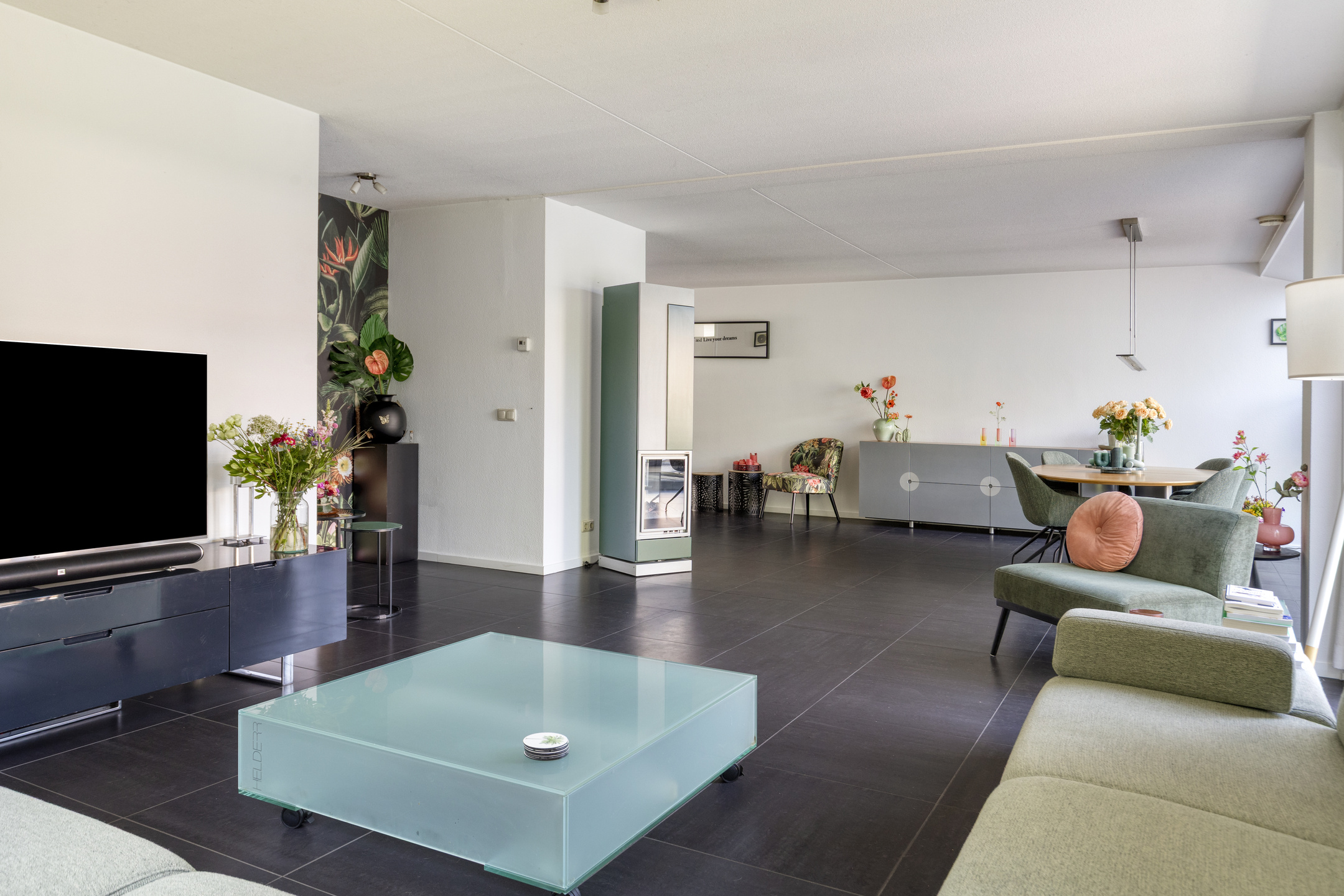 Ruime en lichte living welke is voorzien van een schitterende plavuizen vloer met vloerverwarming. Twee openslaande tuindeuren en een schuifpui met toegang tot de heerlijke achtertuin.