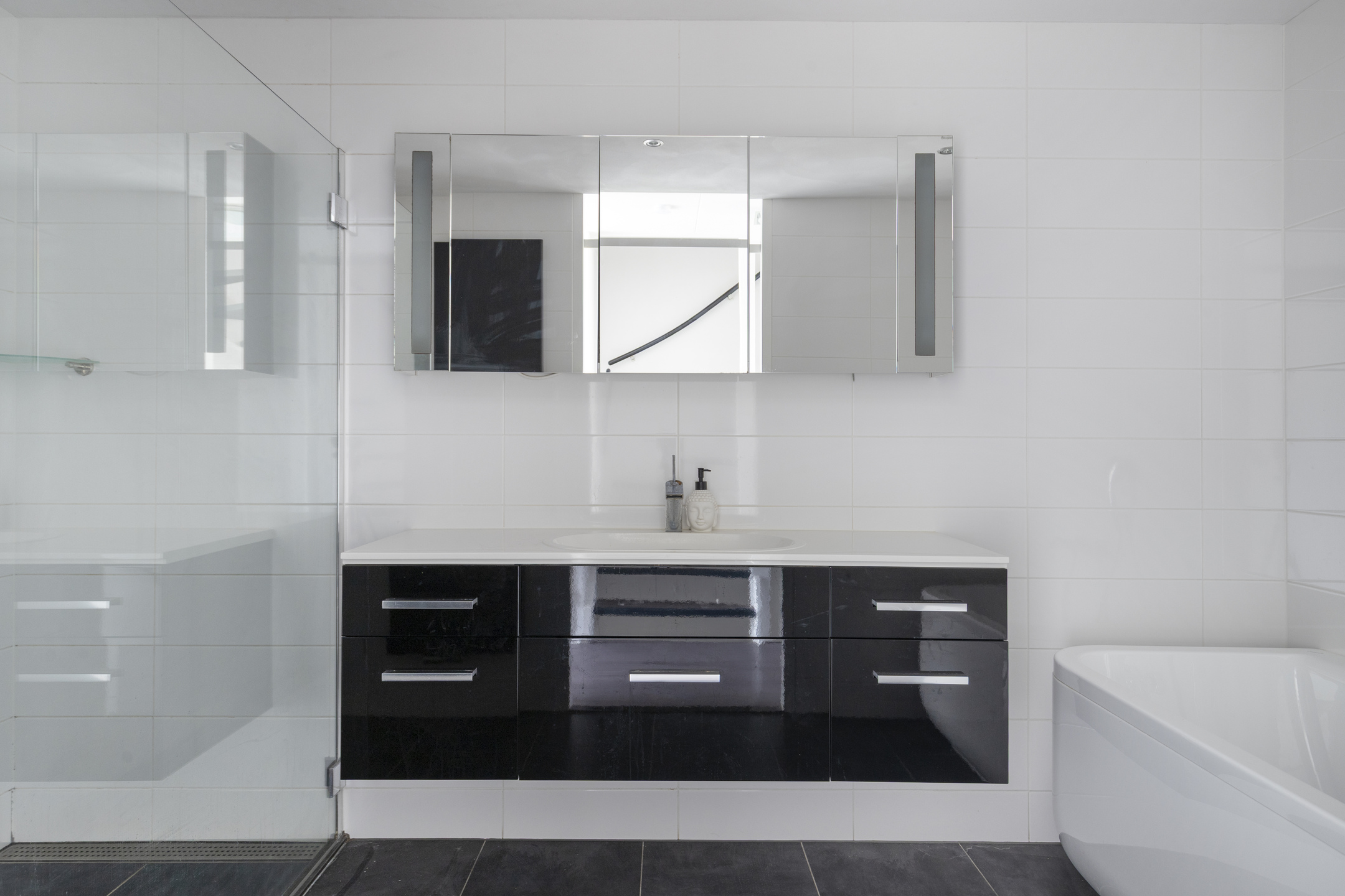 De nette badkamer is uitgerust met een ligbad, wastafel met meubel, een douche, vloerverwarming en een designradiator.