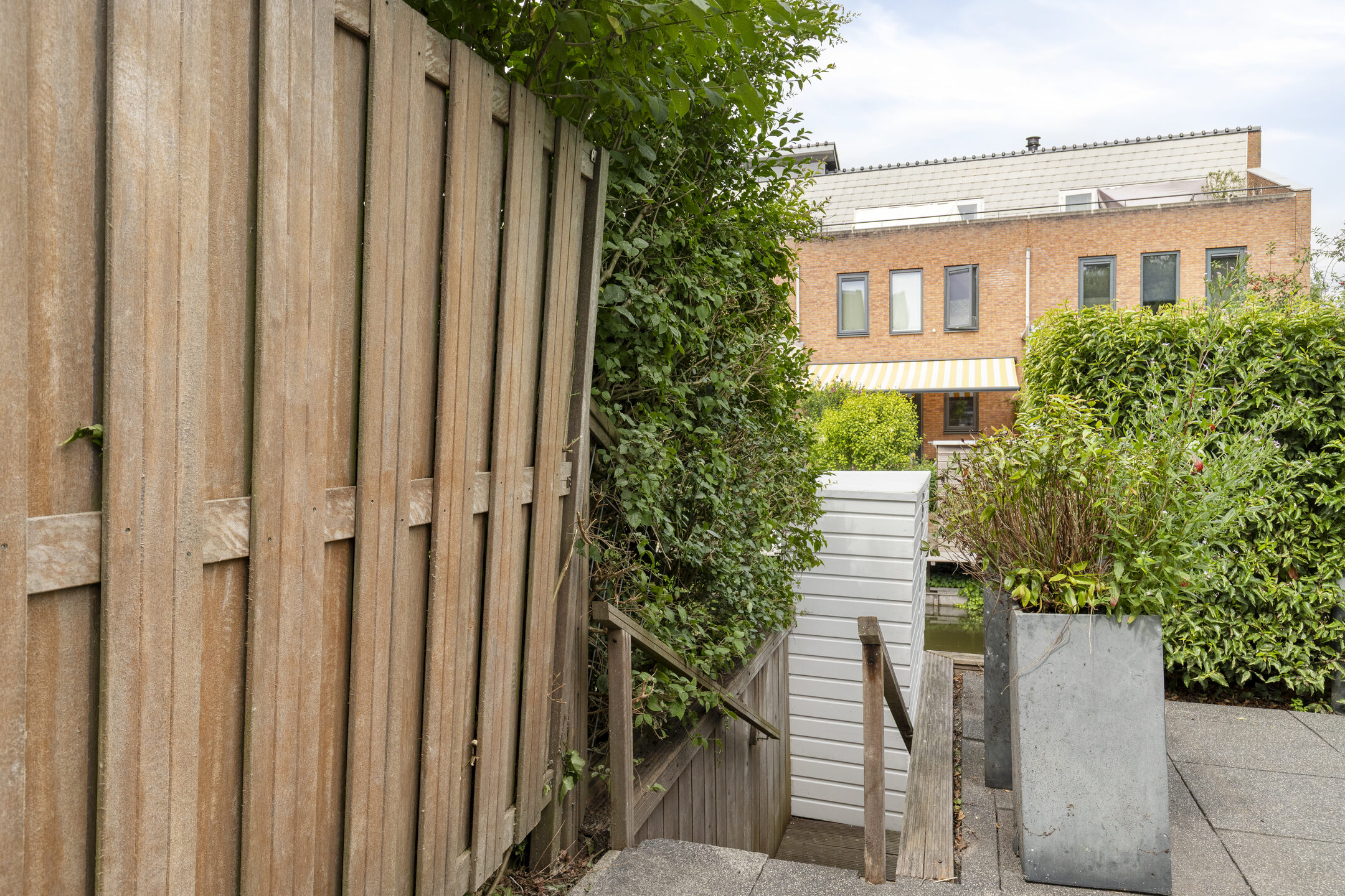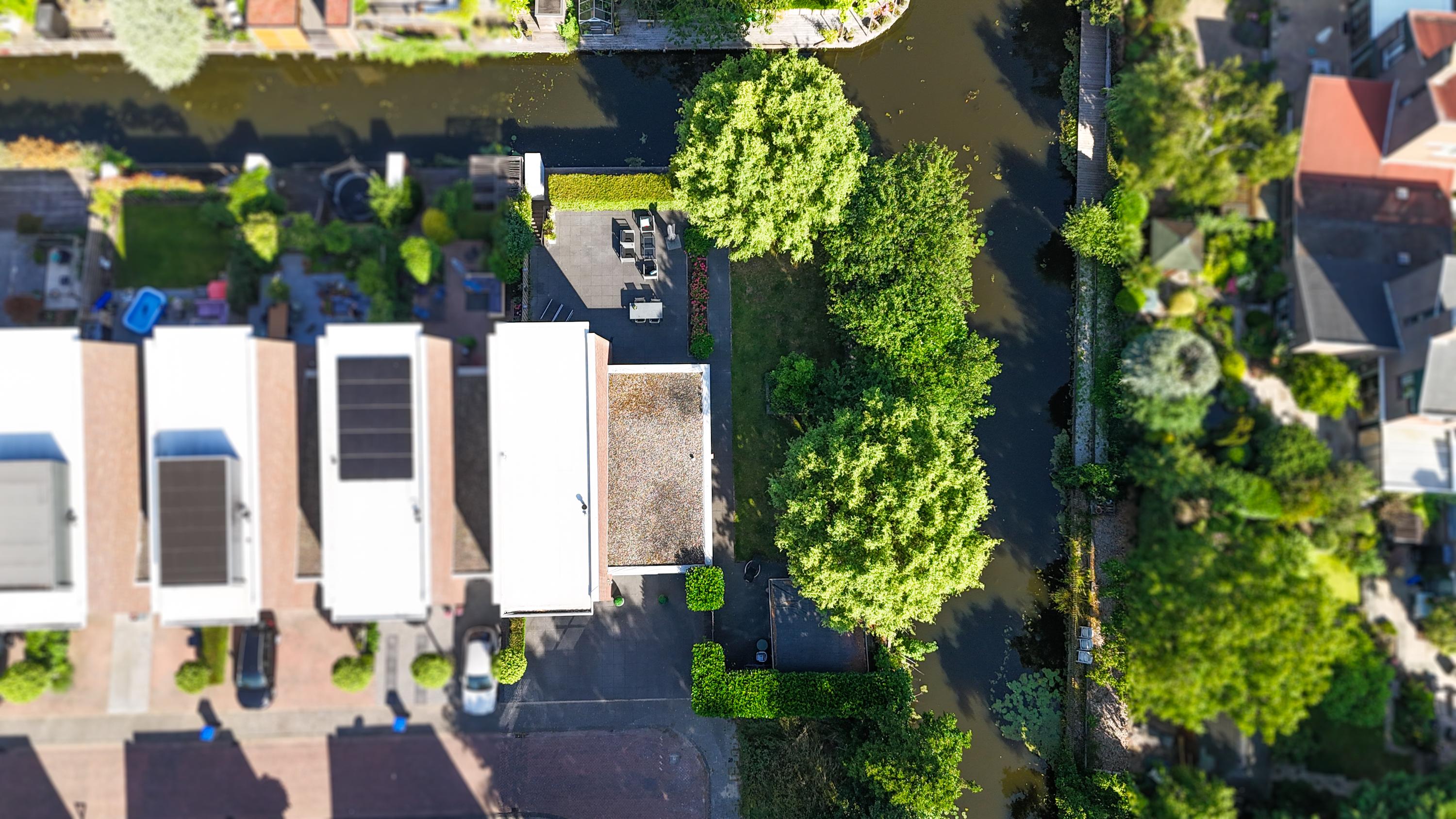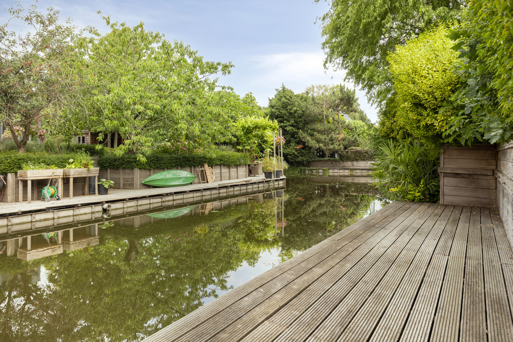 De verzorgde achtertuin is gelegen op het westen. De tuin beschikt over diverse terrassen met veel privacy, een sfeervolle overkapping en een vlonder met schitterend vrij uitzicht op de achtergelegen singel.