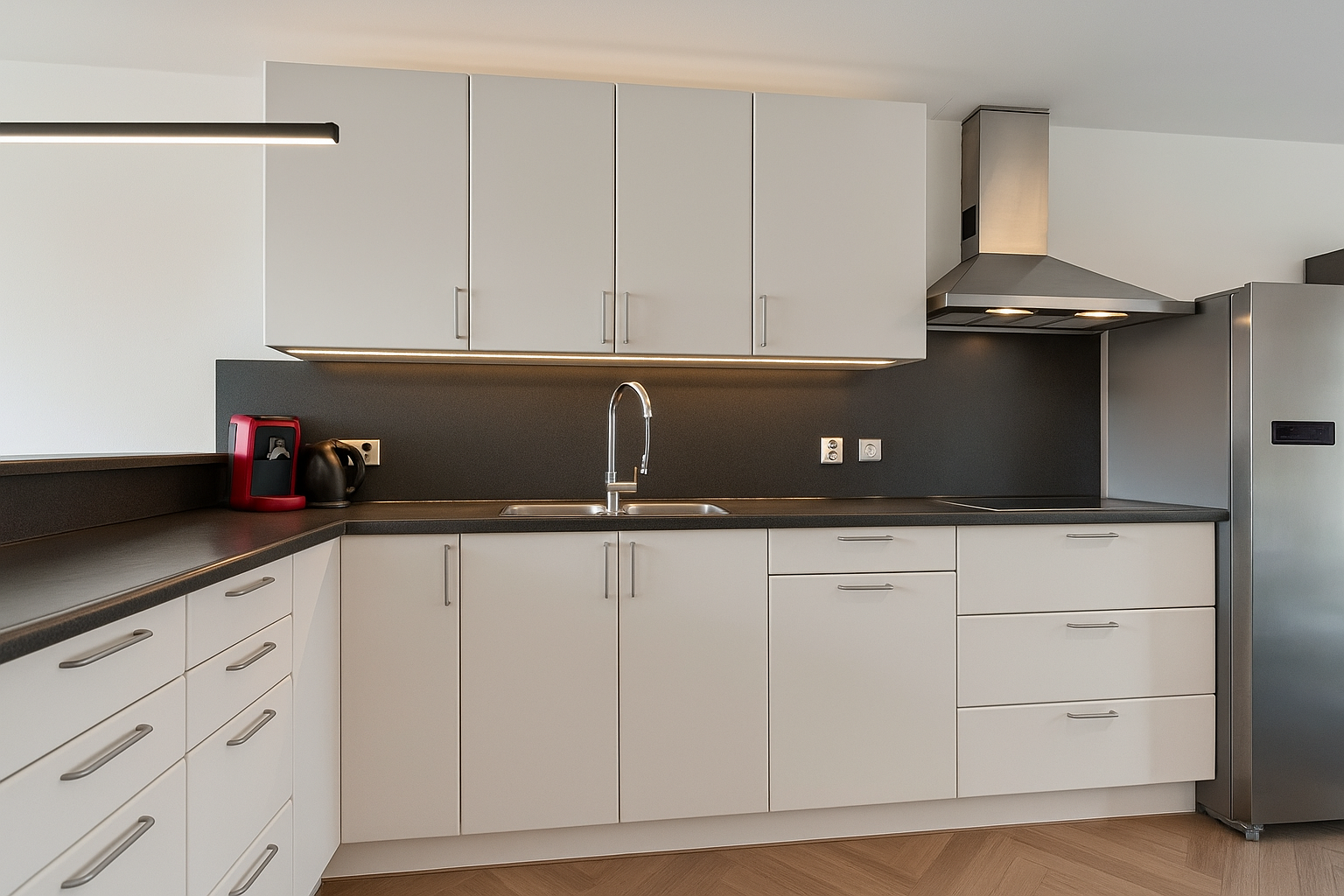 Aan de voorkant bevindt zich de open keuken met veel opbergruimte en is van alle gemakken voorzien, zoals een spoelbak met mengkraan, keramische kookplaat, afzuigkap, koelkast, vriezer en vaatwasser.