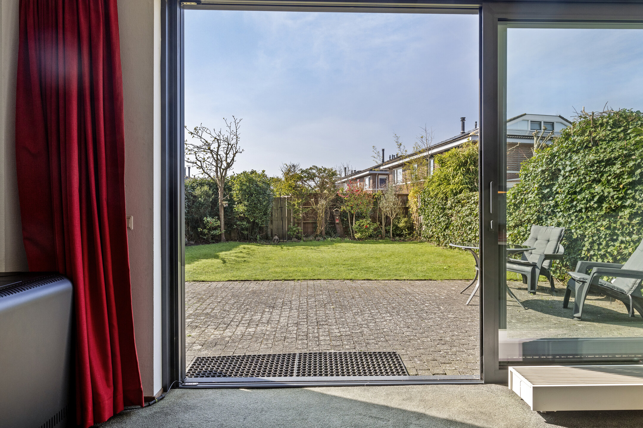 De fraai aangelegde achtertuin is een fijne plek waar je door de ligging op het zuiden heerlijk van het middag- en het avondzonnetje kunt genieten. De achtertuin is voorzien van een elektrisch zonnescherm.