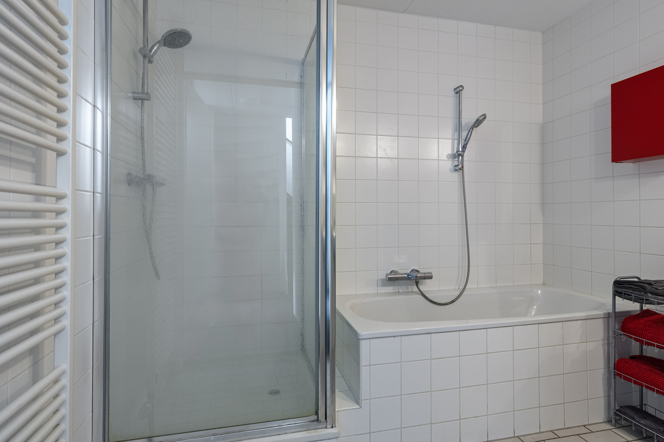 De badkamer is voorzien van een douche, ligbad, twee wastafels en een handdoekradiator.