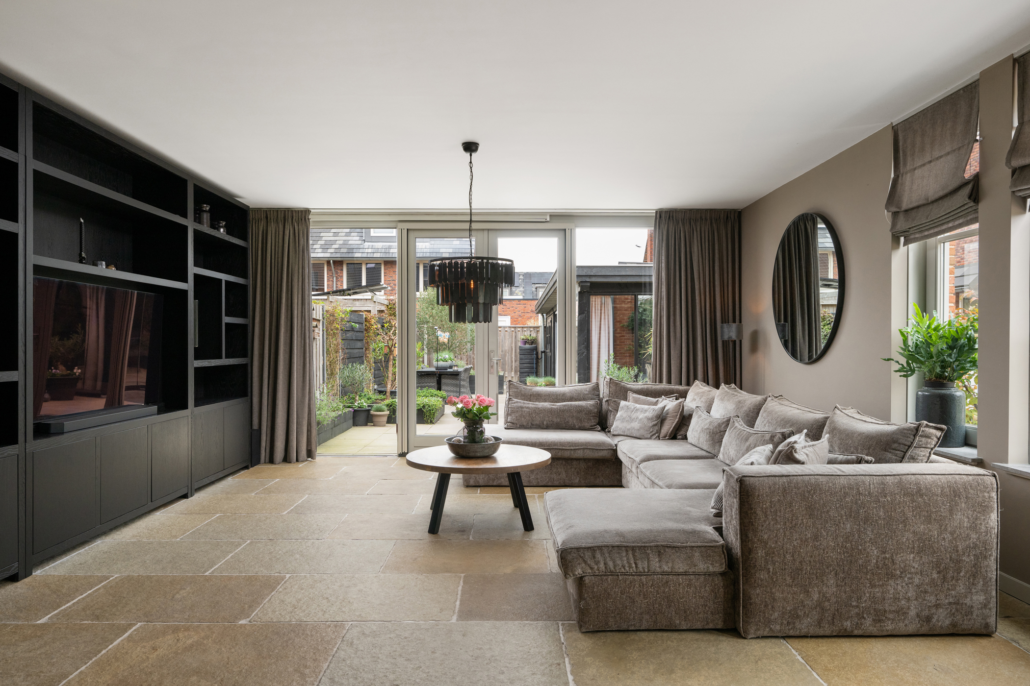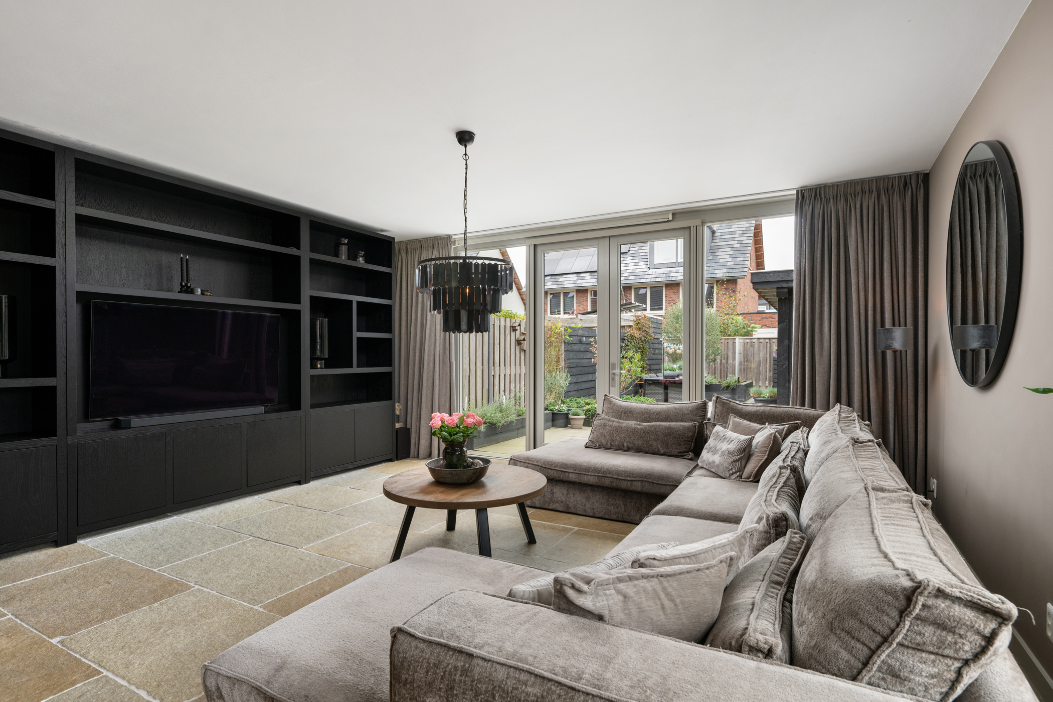 De tuingerichte woonkamer is ruim en licht, afgewerkt met een fraaie Bourgondisch dallen natuurstenen vloer met vloerverwarming. De trap naar de eerste verdieping bevindt zich in de woonkamer en de trapkast is praktisch ingericht als extra garderobe. Openslaande deuren bieden toegang tot de diepe achtertuin, compleet met overkapping en vrijstaande houten berging.