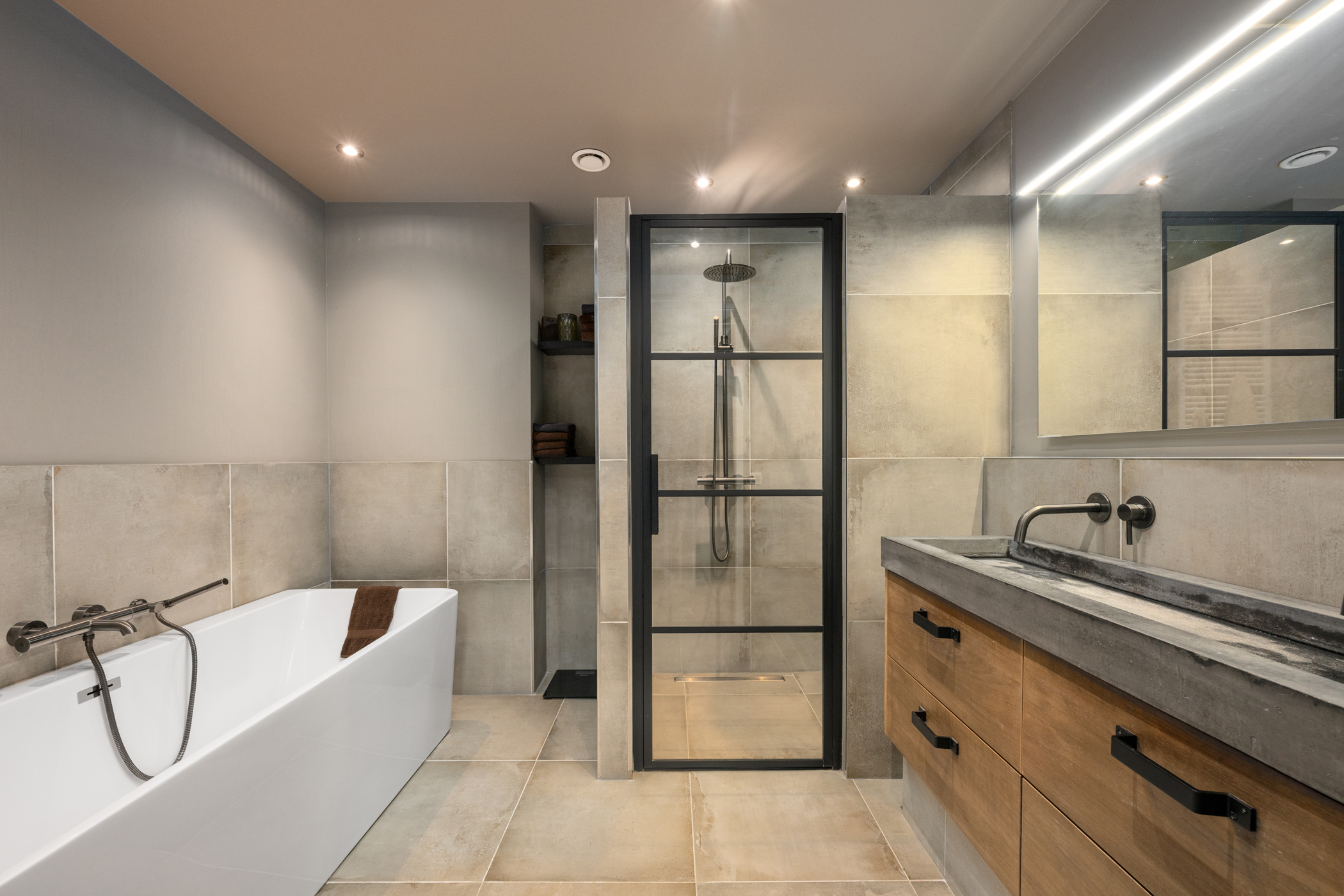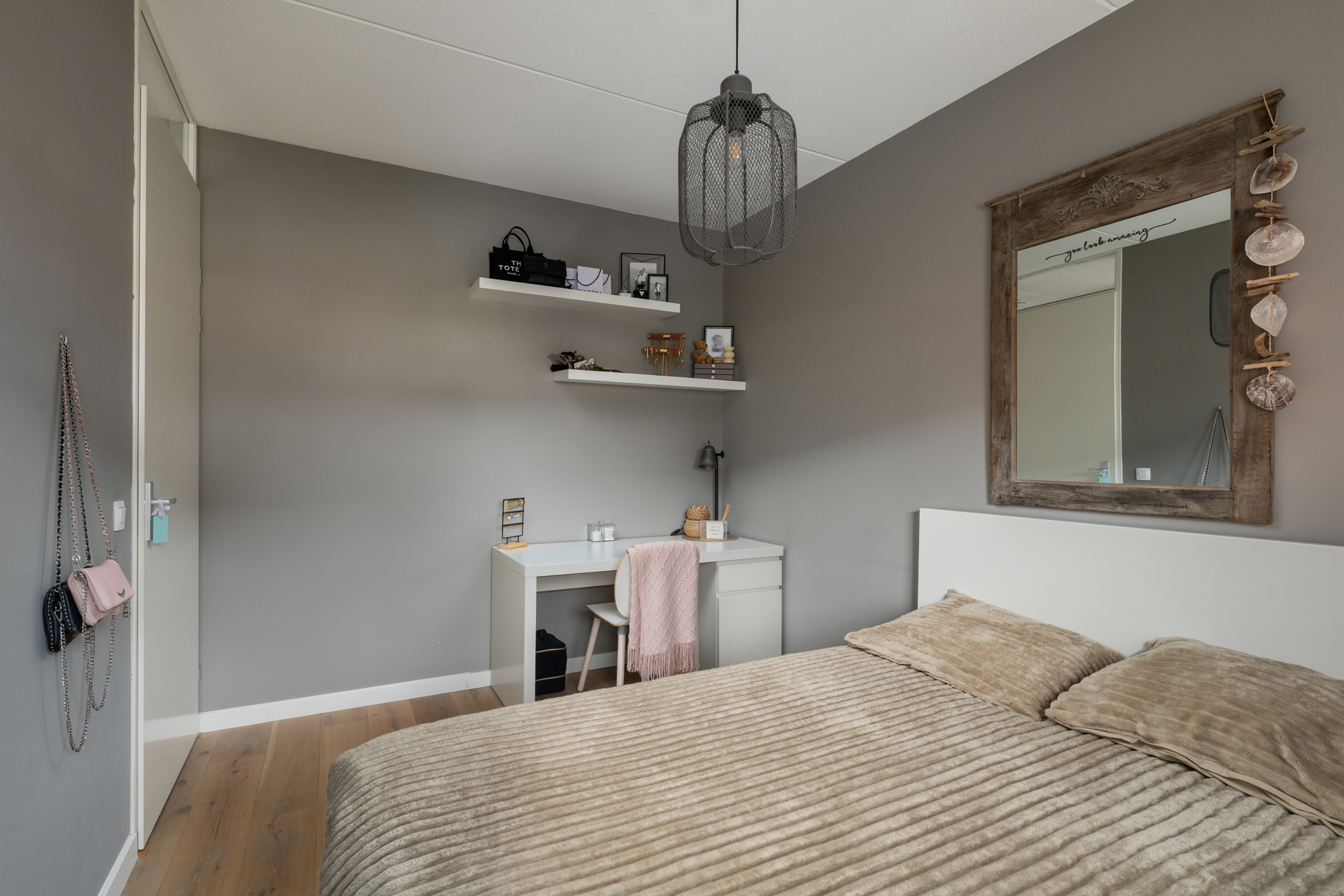 De overloop is voorzien van een houten vloer en geeft toegang tot een de toiletruimte. Aan de achterzijde van de woning bevinden zich twee slaapkamers, aan de voorzijde één slaapkamer. De volledig betegelde badkamer is luxe uitgevoerd met een inloopdouche, ligbad, badkamermeubel met dubbele wastafel, grote spiegel en handdoekradiator.