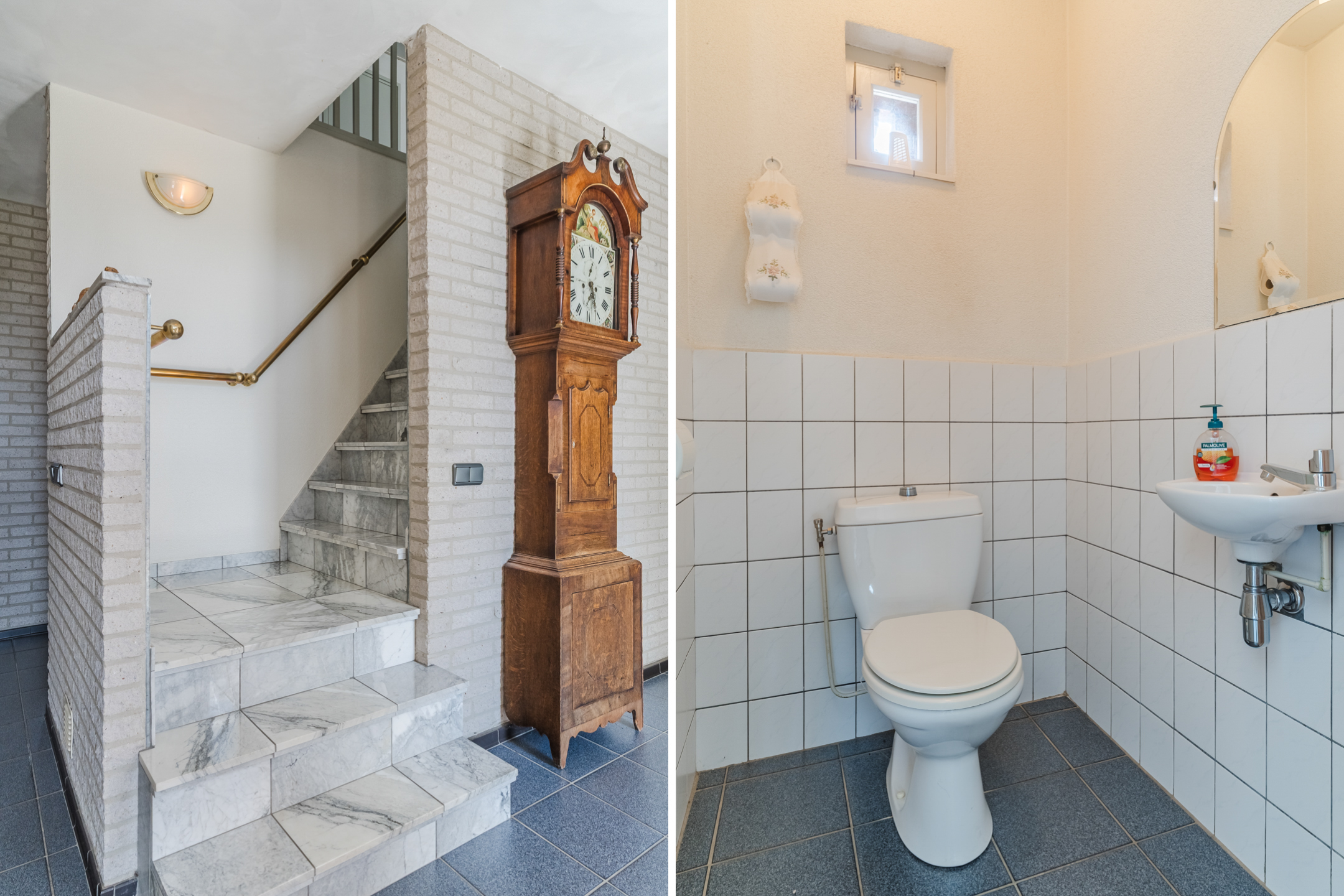 ca. 32,5 m² met tegelvloer, metselwerk wanden, stucwerk plafond en voorzien van een afsluitbare garderobekast en meterkast met 14 groepen, 3 aardlekschakelaars en 3 fase aansluiting. De hal geeft verder toegang tot de toiletruimte, keuken, woonkamer, 3 slaapkamers, badkamer, bijkeuken, inpandige garage, tuin en toegang tot de 1e verdieping middels een vaste trap.