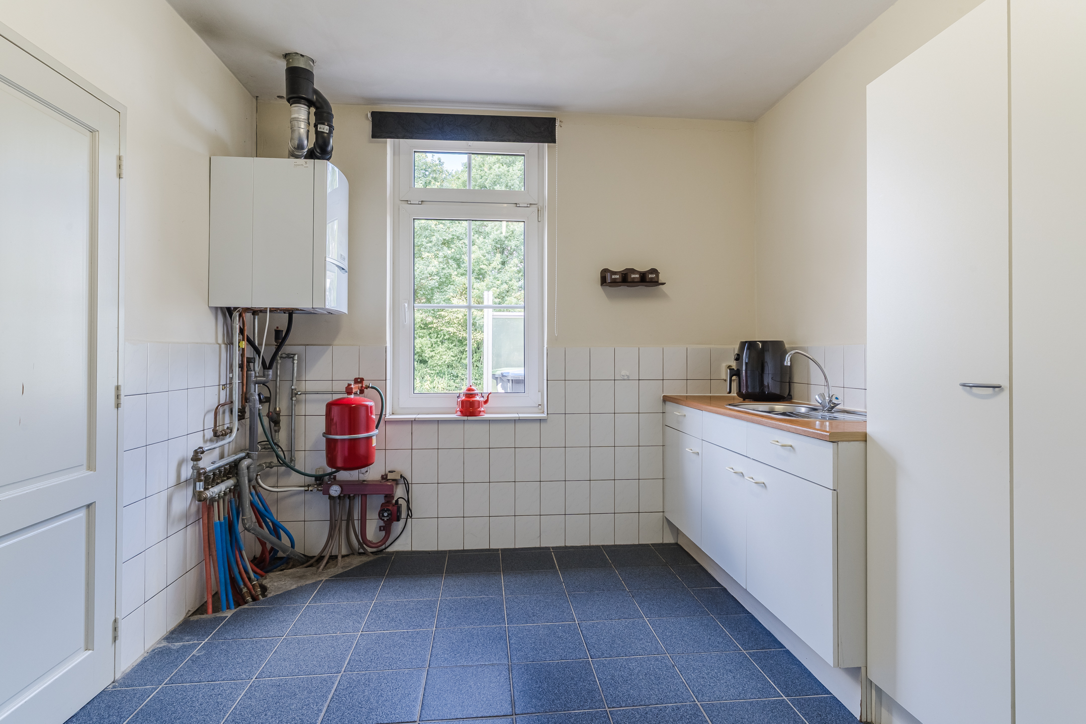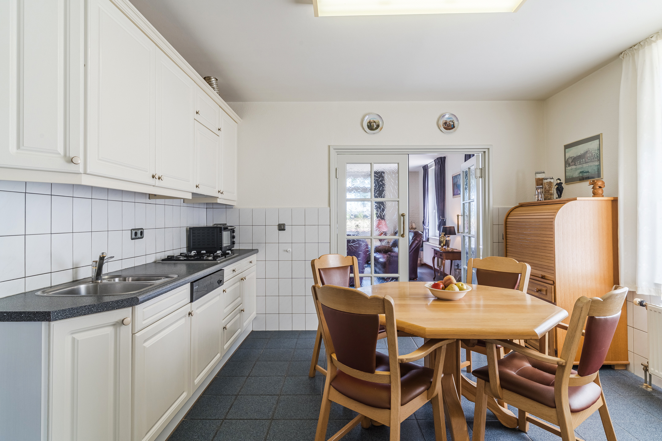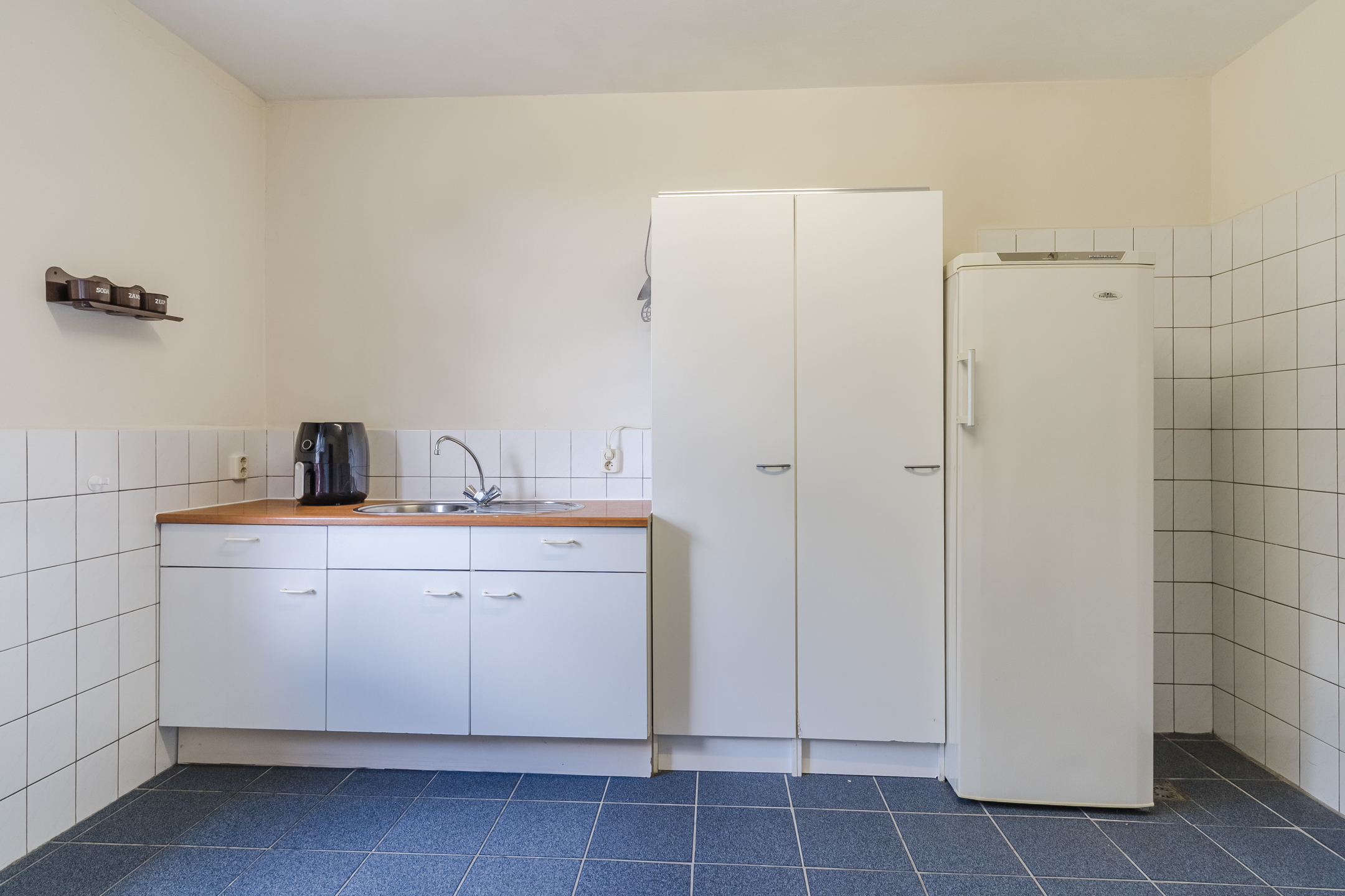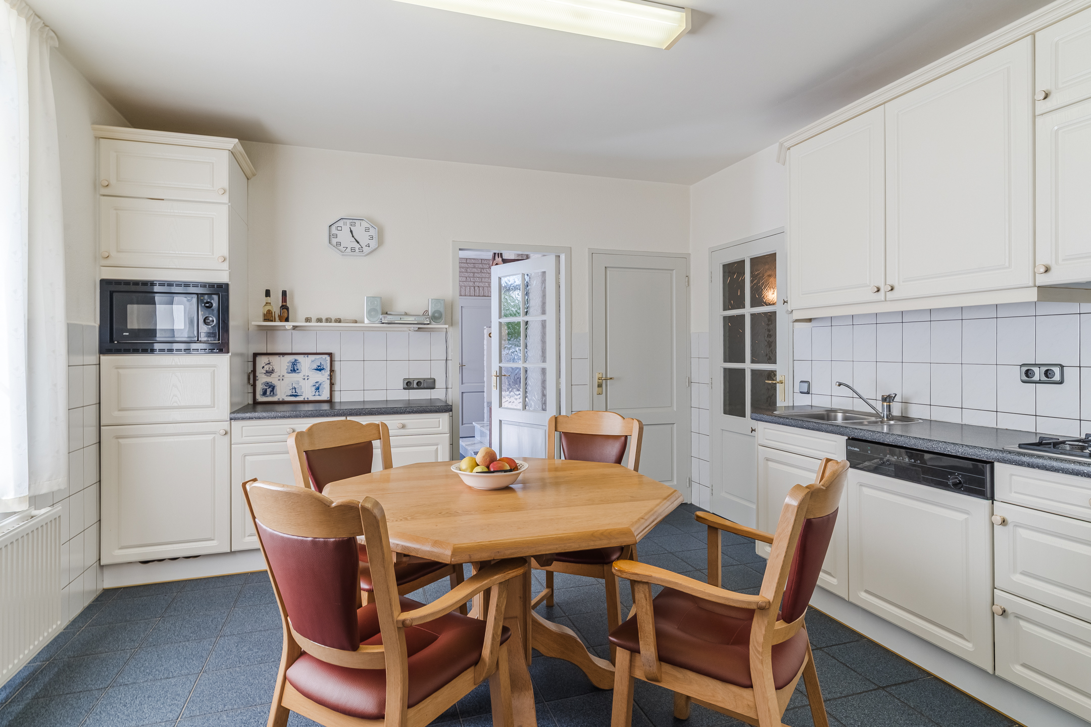ca. 15,5 m² met tegelvloer voorzien van vloerverwarming, gedeeltelijk betegelde wanden, stucwerk plafond en 2x rechte keukenopstelling voorzien van 4-pits gaskookplaat, afzuigkap, 1,5 spoelbak, koelkast, combimagnetron, vaatwasser en verdiepte trapkast.