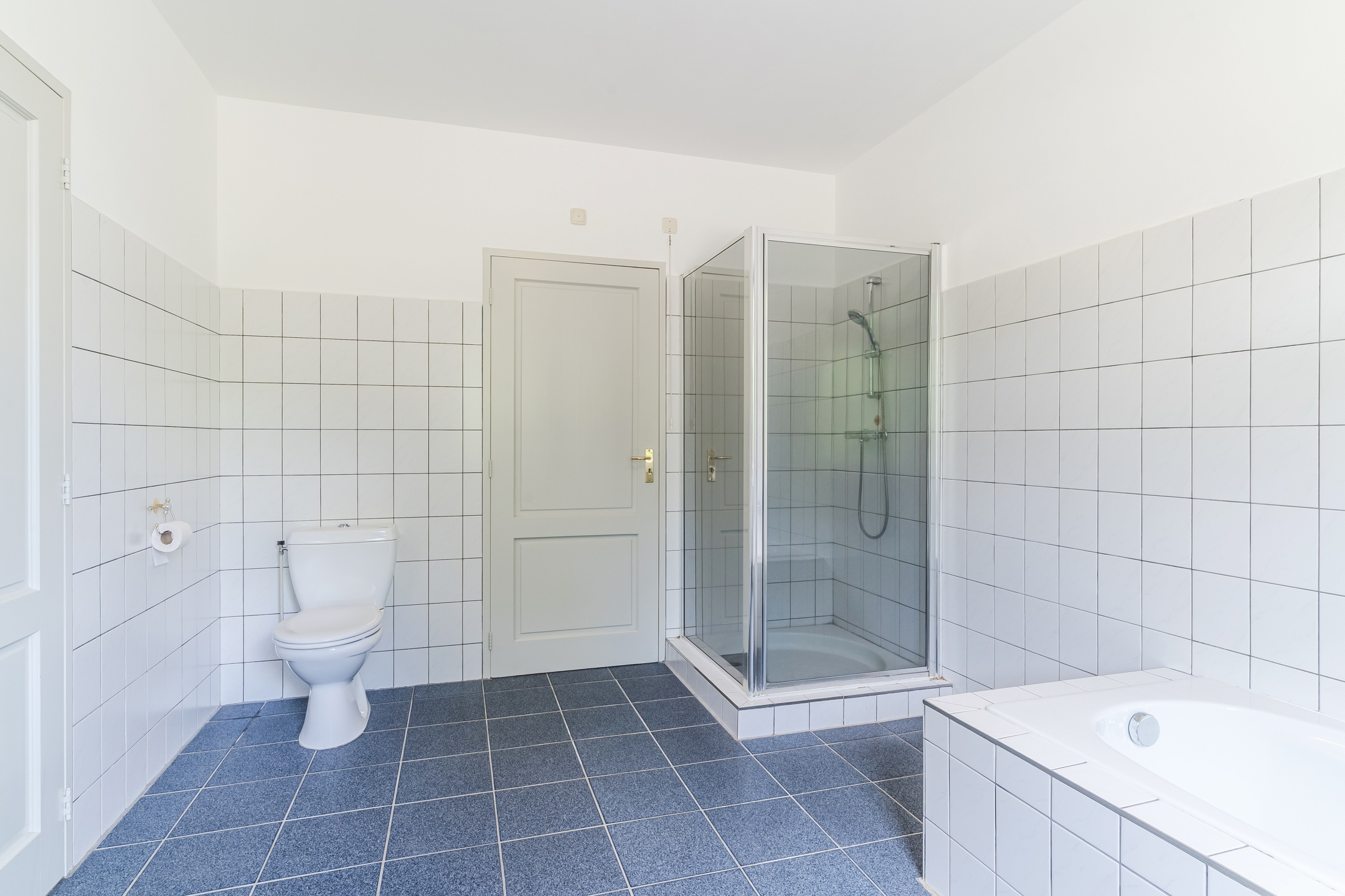 ca. 11,5 m² met tegelvloer voorzien van vloerverwarming, gedeeltelijk betegelde wanden, stucwerk plafond en voorzien van douche met thermostatische kraan, ligbad met thermostatische kraan, wastafelmeubel met 1 kraan en toilet.