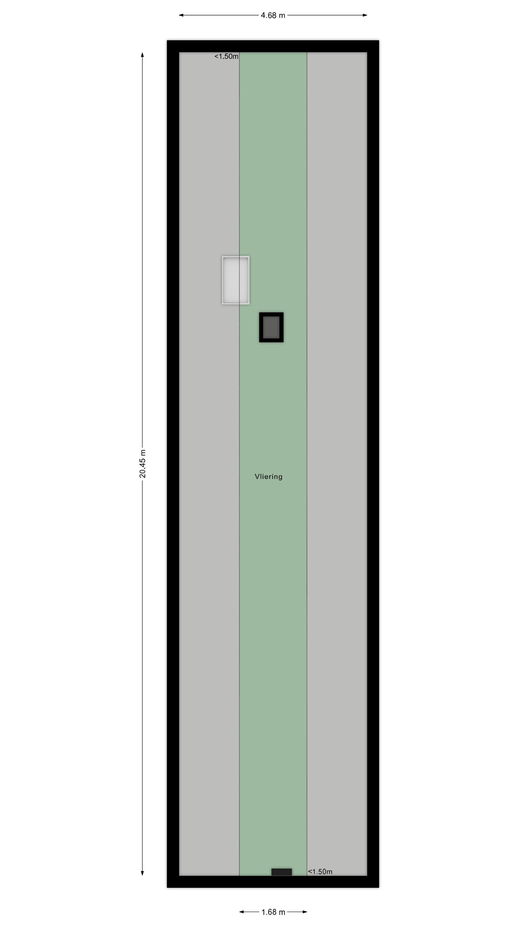 ca. 100 m² vloeroppervlakte gemeten met plankenvloer, metselwerk wanden, dakplaten plafond en een hoogte van ca. 2,12 m tot de nok.