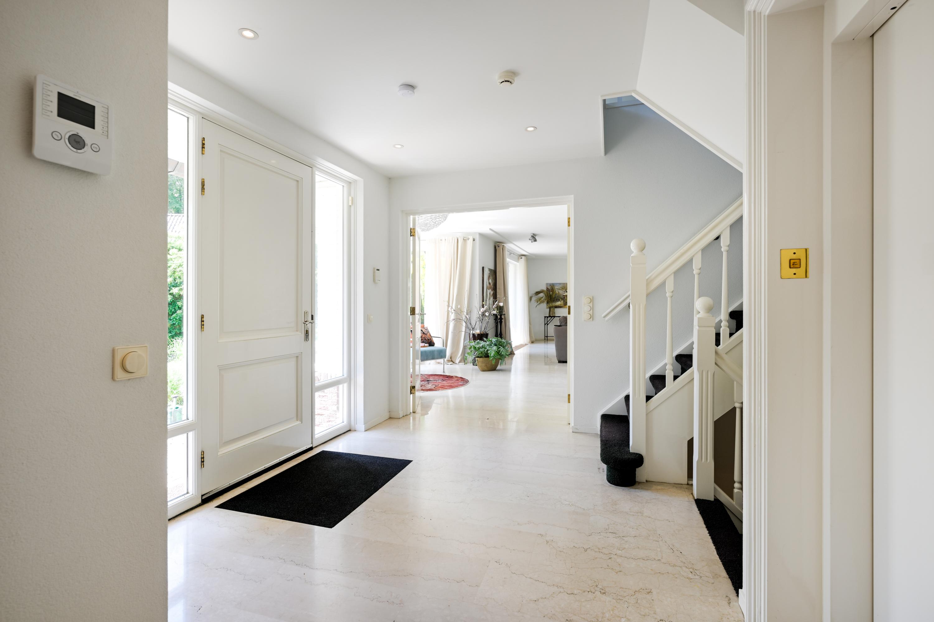 Royale hal met bordestrap en lift, modern toilet en garderobe, dubbele deuren naar lichte, ruime living met ronde erker, sfeervolle living met (gas-)haard en tuingerichte erker met openslaande deuren naar het terras (zuidwest), vanuit de hal en woonkamer toegang tot de royale lichte woonkeuken met diverse inbouwapparatuur, bijkeuken met aansluiting voor was- en droogapparatuur, deur naar tuin. Naast de hal gelegen studeer/werkkamer met op maat gemaakte rondgetrokken kastenwand en erker aan de voorzijde.