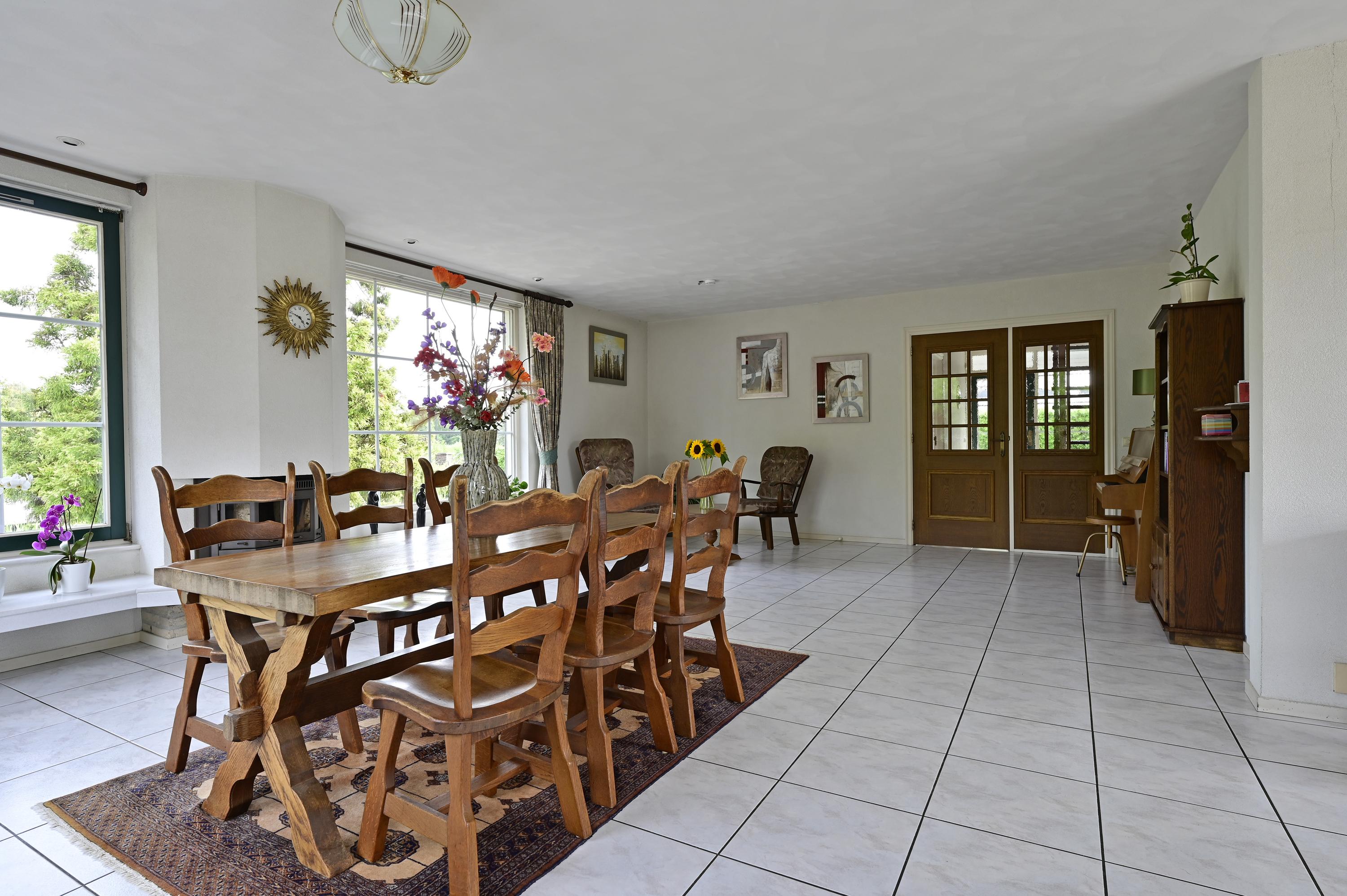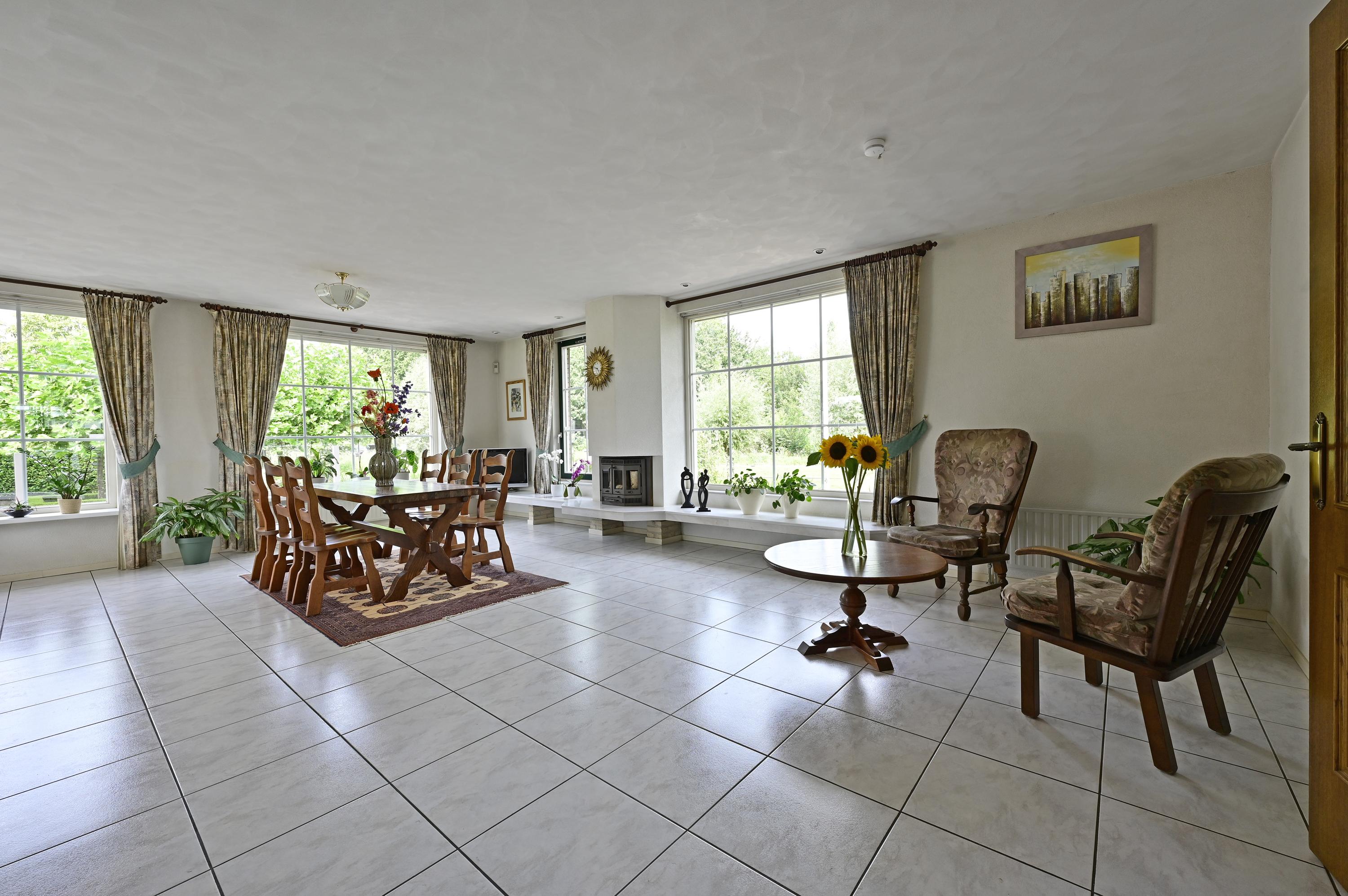 + Riante, lichte woonkamer met grote raampartijen, houtgestookte haard en directe toegang tot een verhoogd terras met windscherm.