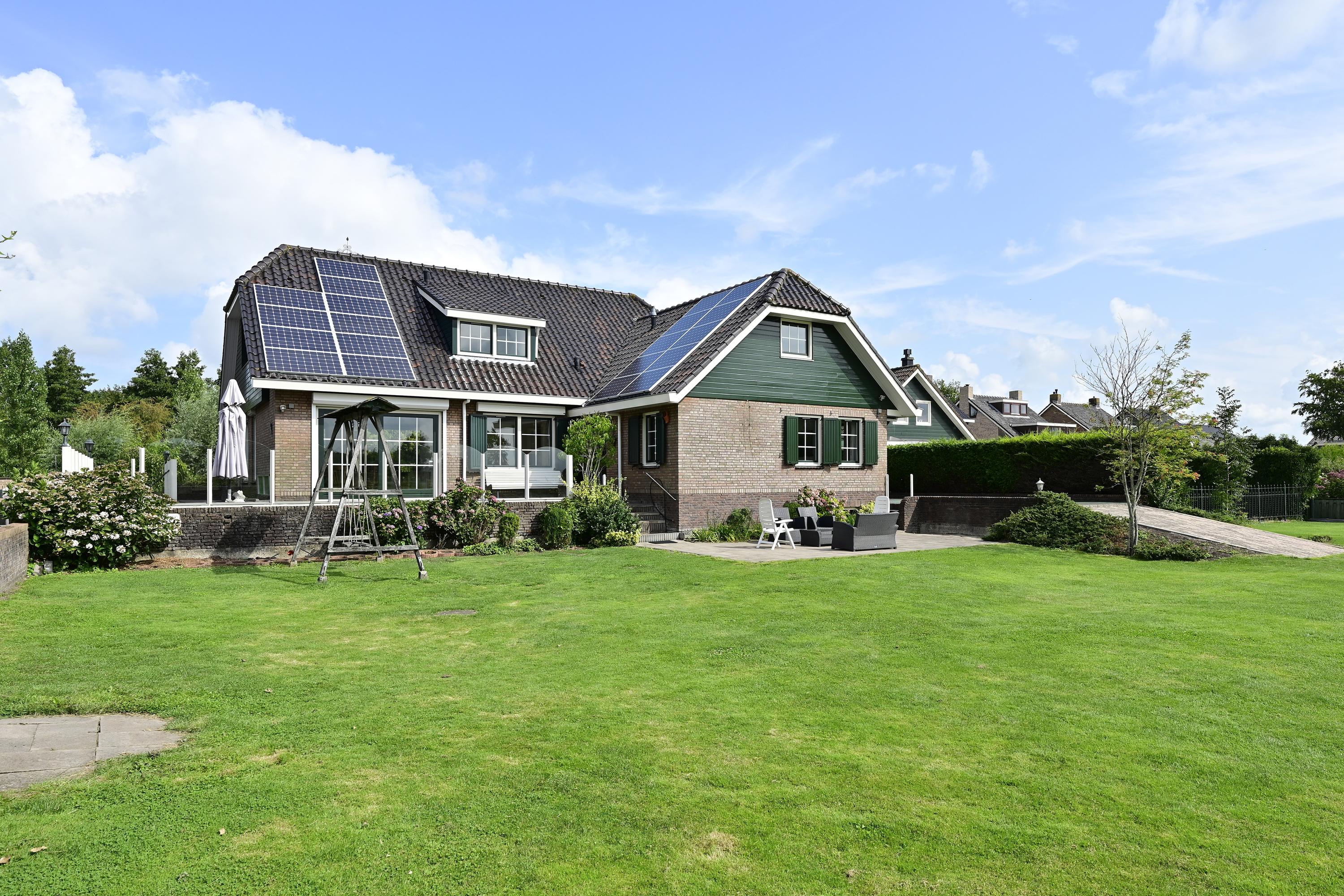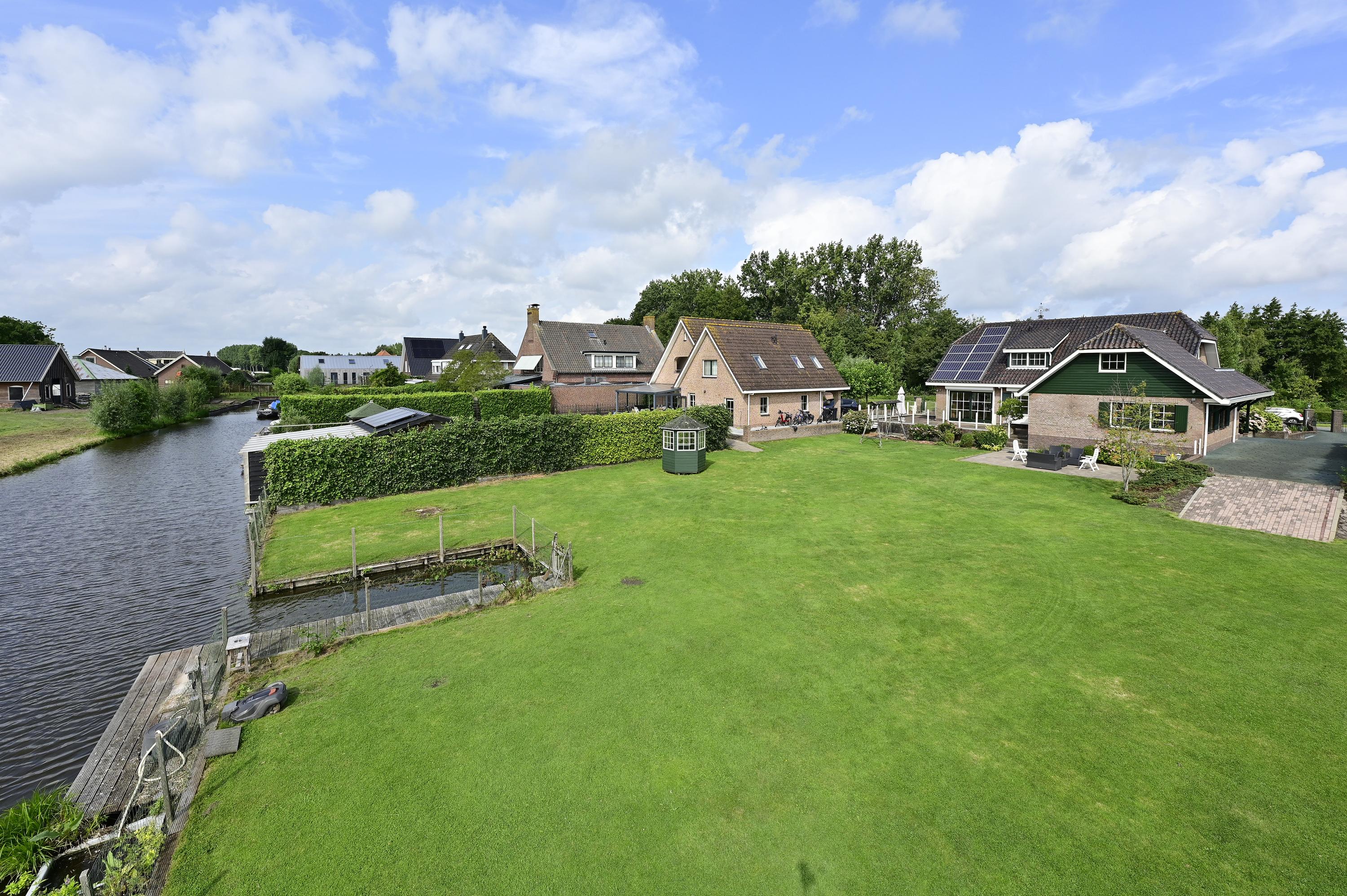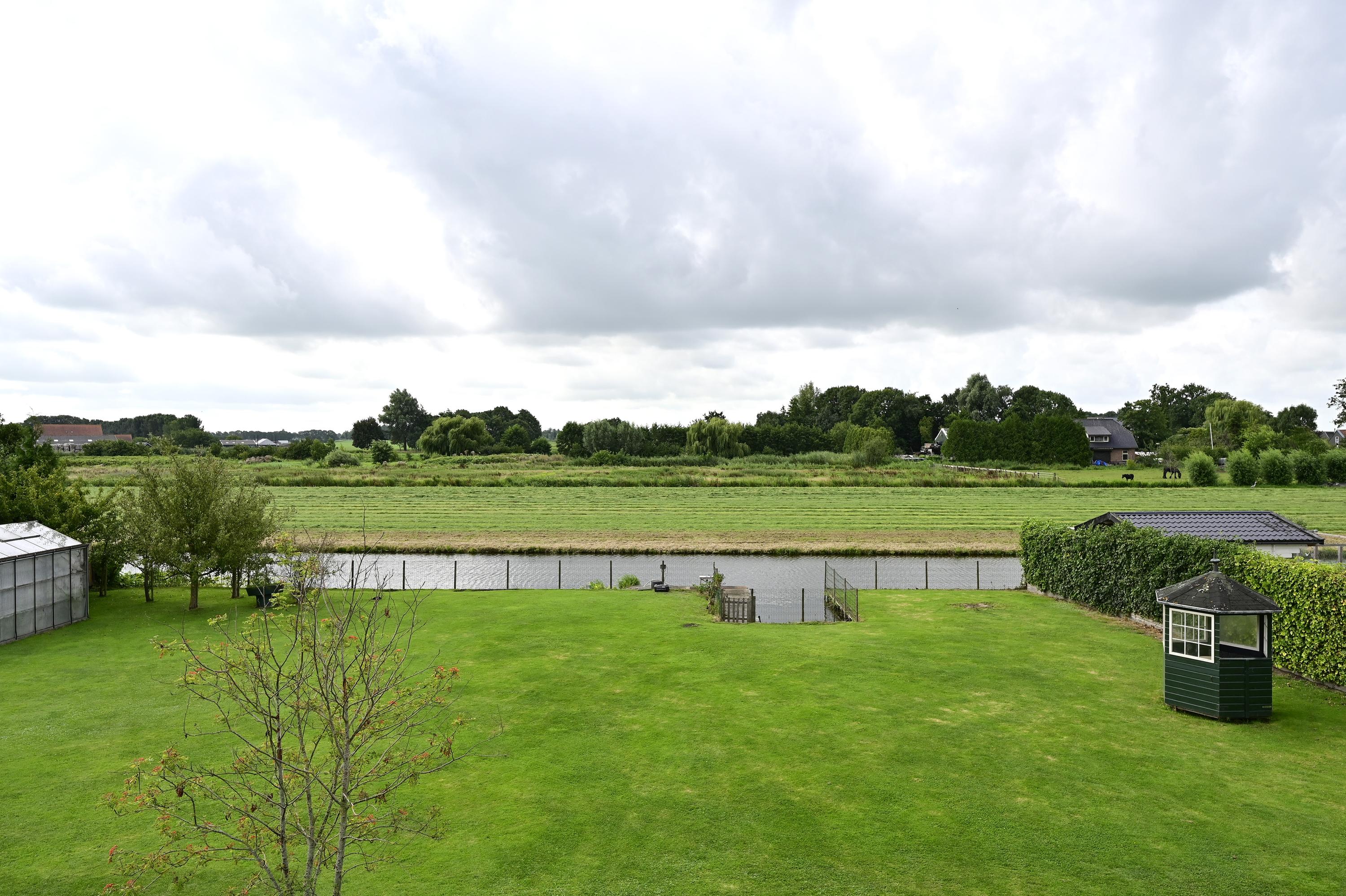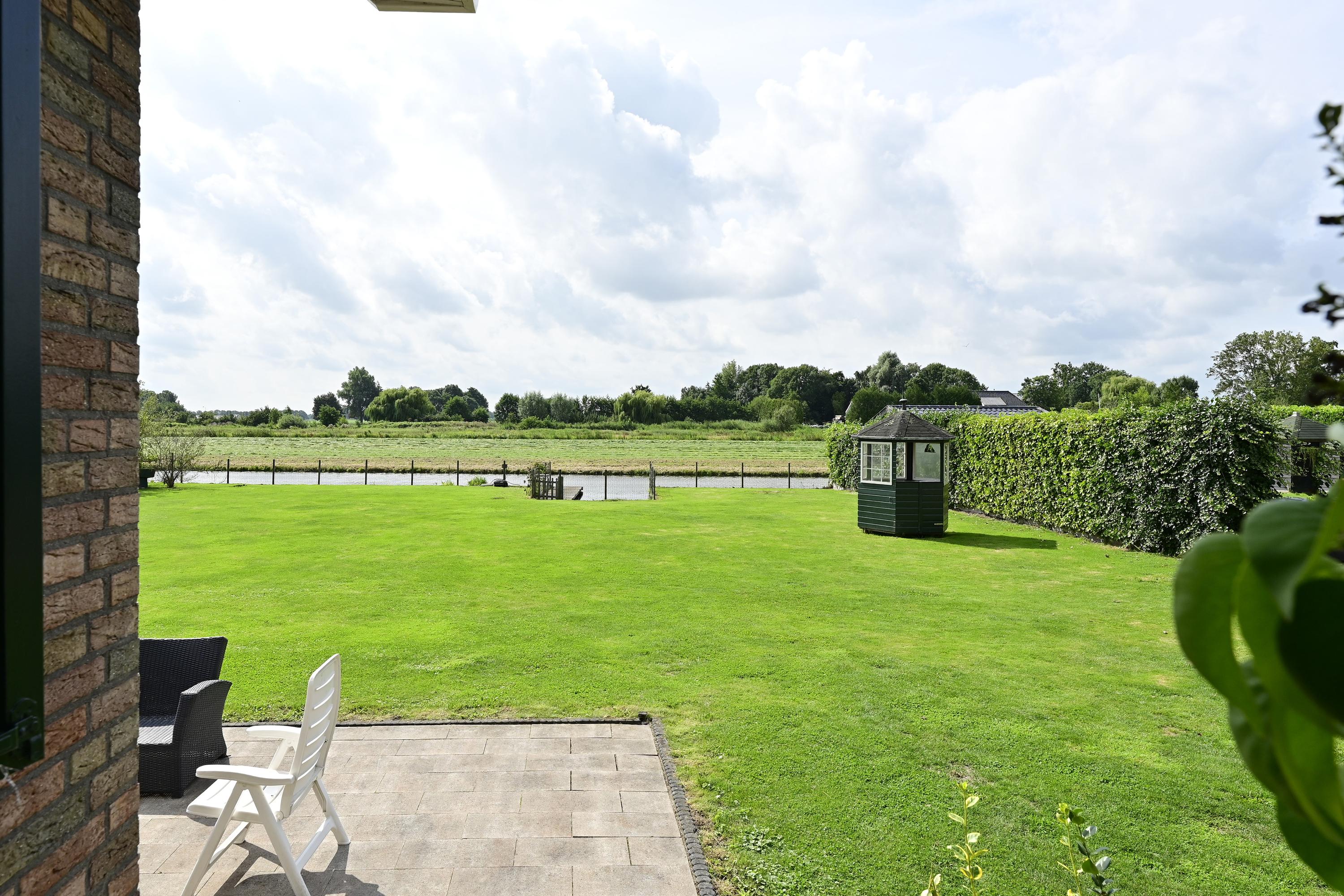 Verderop in de tuin vindt u een charmant prieeltje, een idyllisch plekje voor een kop koffie in de ochtendzon of een goed boek in de namiddag. De tuin biedt daarnaast meer dan voldoende ruimte voor het aanleggen van een zwembad – een waardevolle toevoeging met het oog op de steeds warmere zomers. Achter het huis ligt een ruim terras waar u een fijne zithoek kunt creëren. Via een trap bereikt u het verhoogde, onderheide terras direct aan de woning, dat is afgezet met een glazen windscherm. Deze beschutte plek is bij uitstek geschikt voor een luxe eethoek of loungeset, met een adembenemend uitzicht over de tuin, het water en het Hollandse landschap. Het volledige terras rondom de woning is onderheid, wat zorgt voor een solide basis en duurzaamheid op lange termijn.