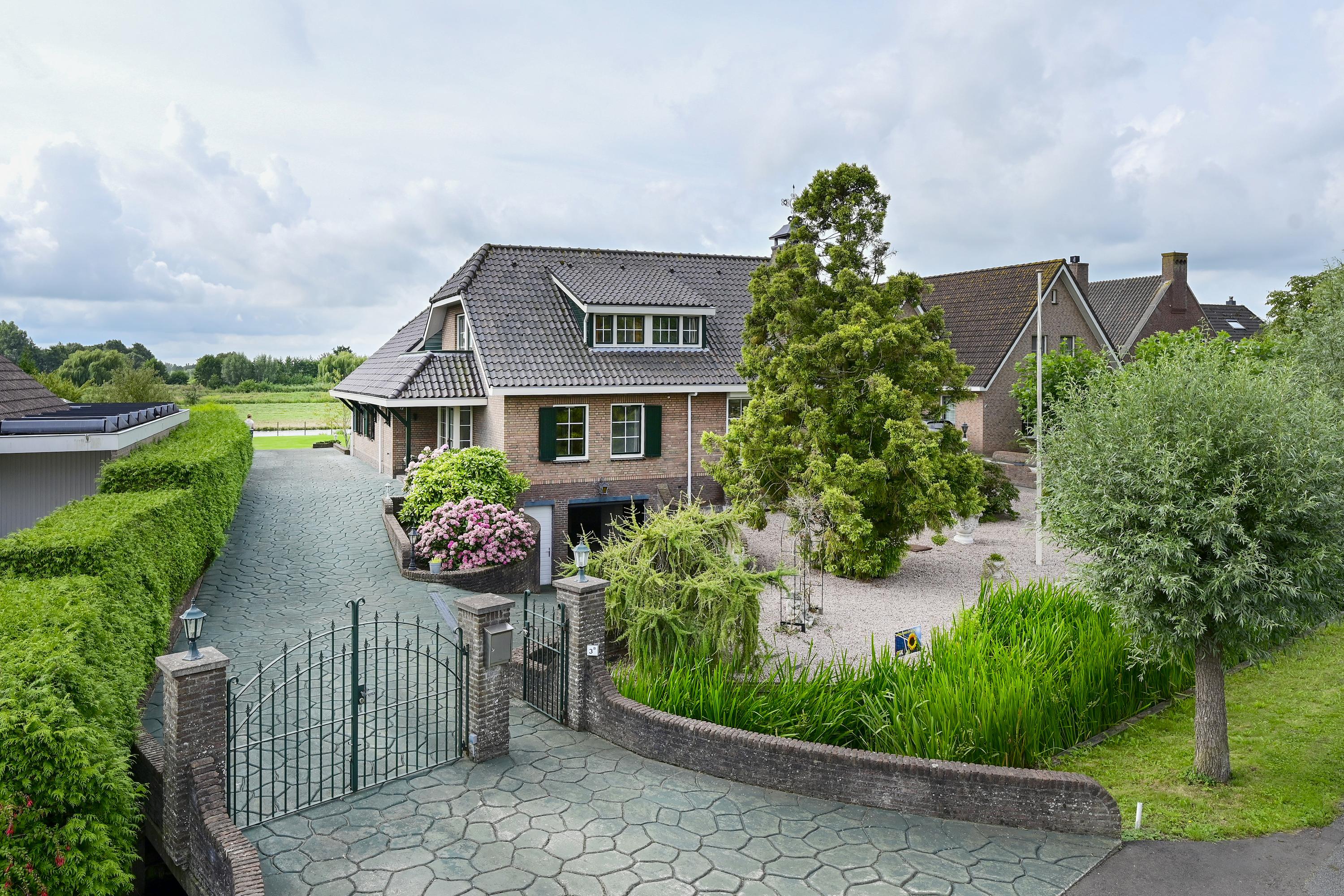 Via een charmant bruggetje bereikt u het toegangshek dat leidt naar het royale erf van de woning. Het hekwerk is fraai vormgegeven en praktisch ingedeeld: een brede, openslaande poort voor auto's en een aparte loopdeur voor voetgangers zorgen voor een gastvrije én functionele toegang. De onderheide oprit is uitgevoerd in hoogwaardig beton met een stijlvol design en leidt u langs de zijkant van de woning. Eerst passeert u een helling die toegang biedt tot de inpandige garage – ideaal voor dagelijks gebruik of als praktische werkruimte. Iets verderop bevindt zich de hoofdentree van de woning, eveneens aan de zijkant gelegen, en loopt de oprit naadloos door richting de achtertuin. Een entree met allure, die perfect past bij de solide en stijlvolle uitstraling van deze bijzondere villa.