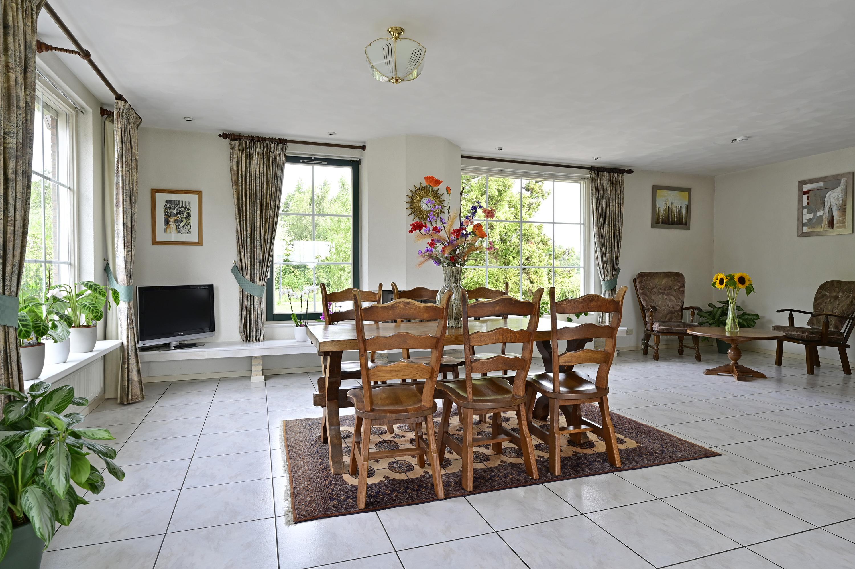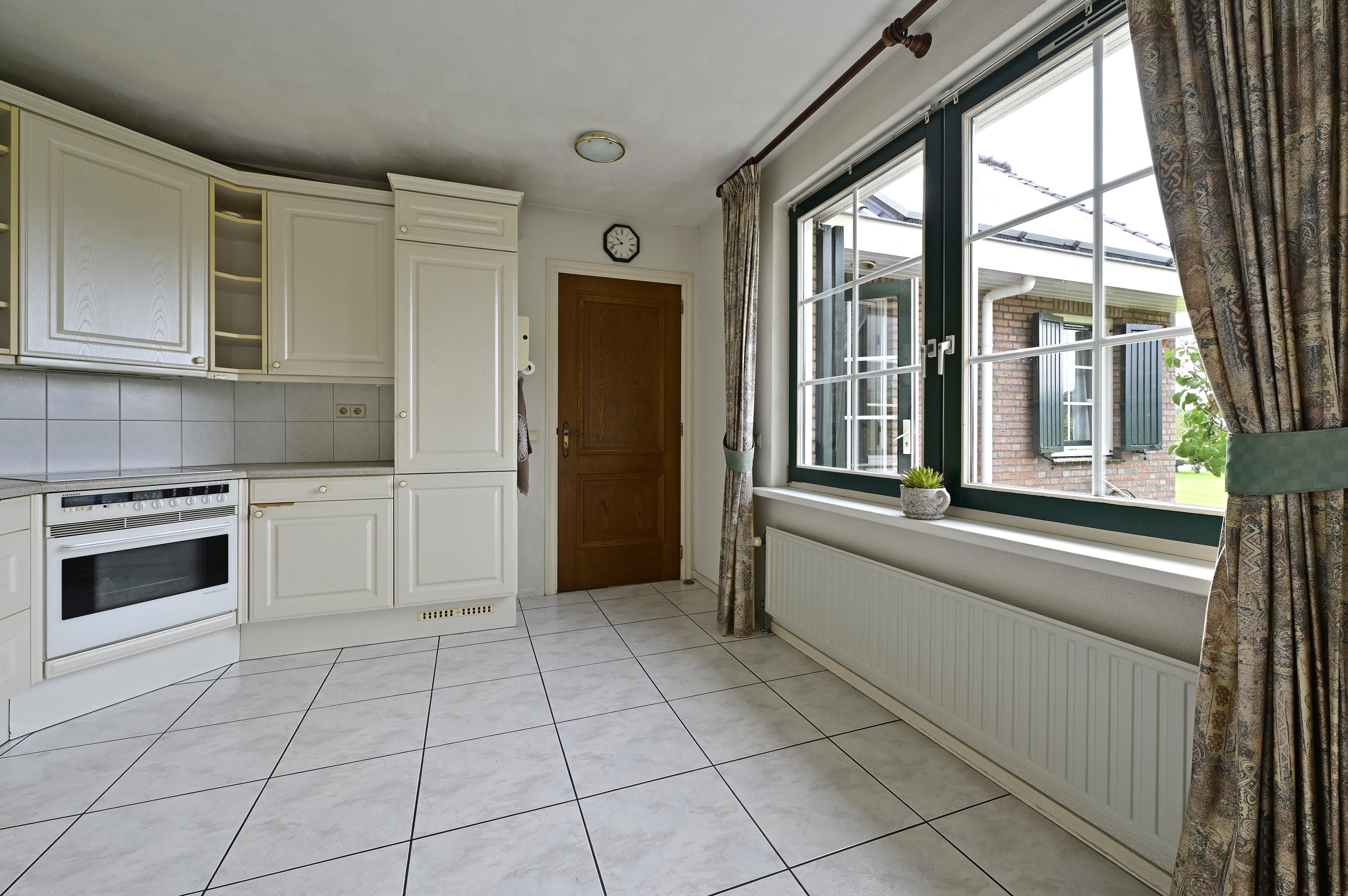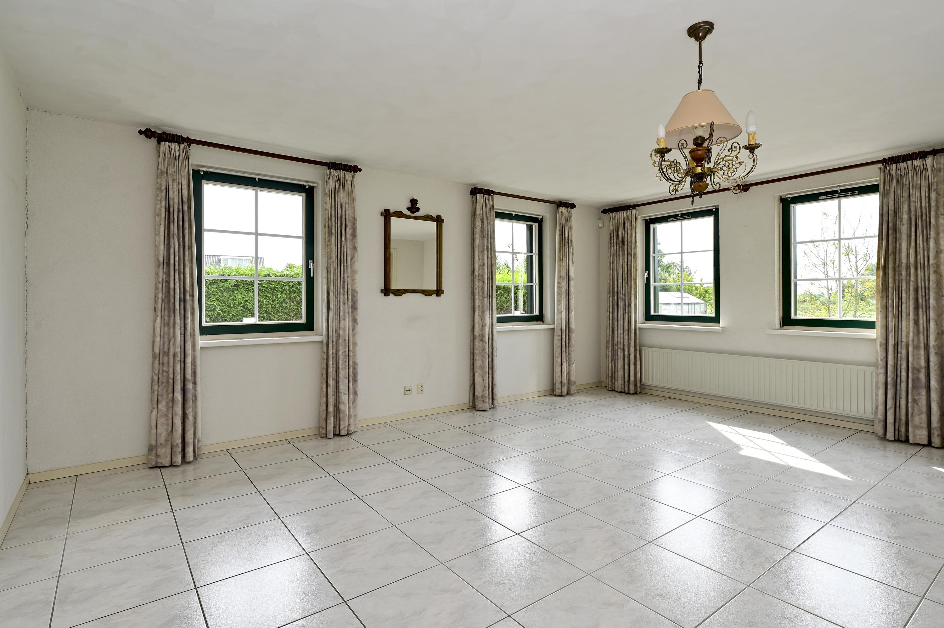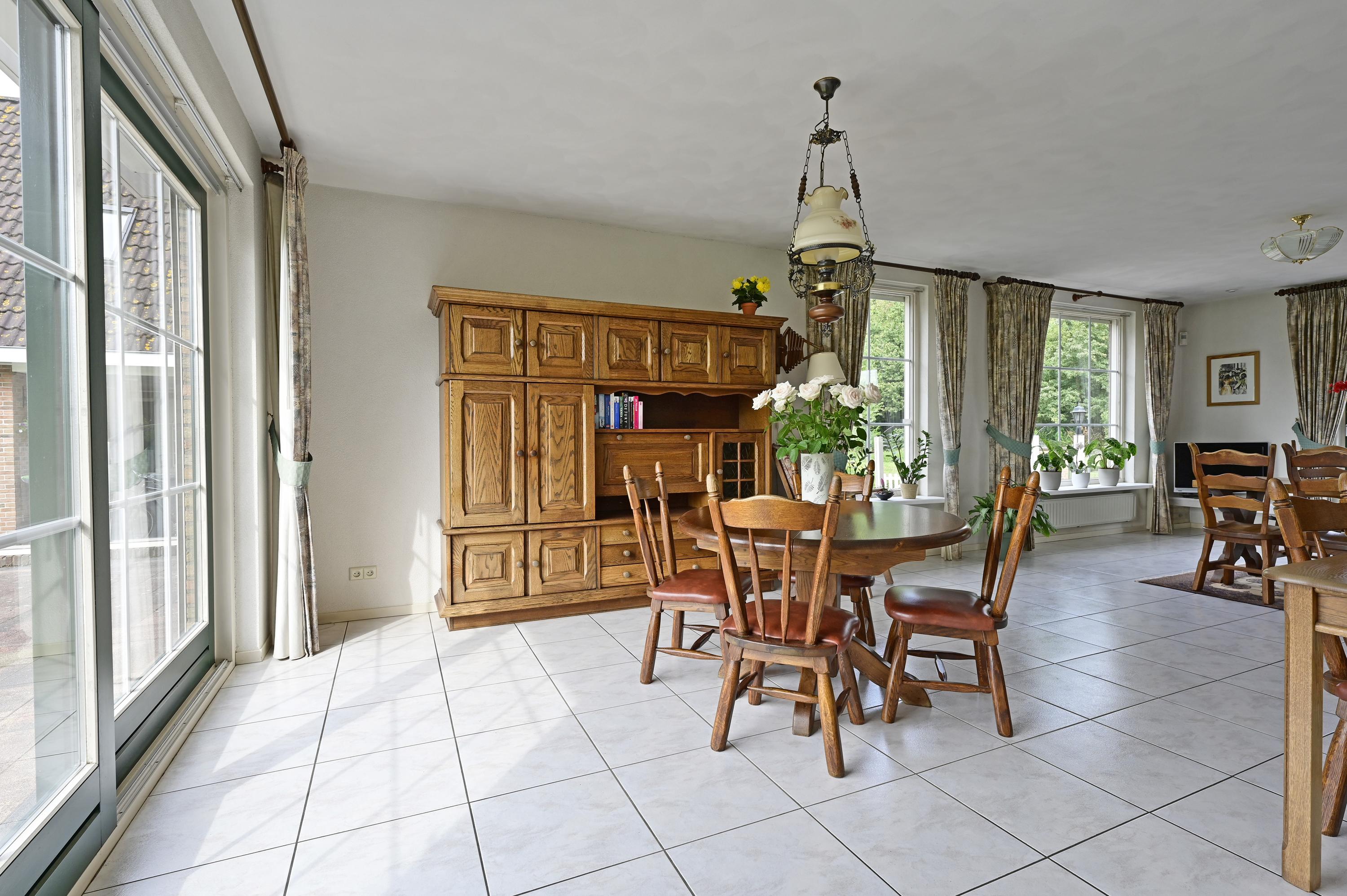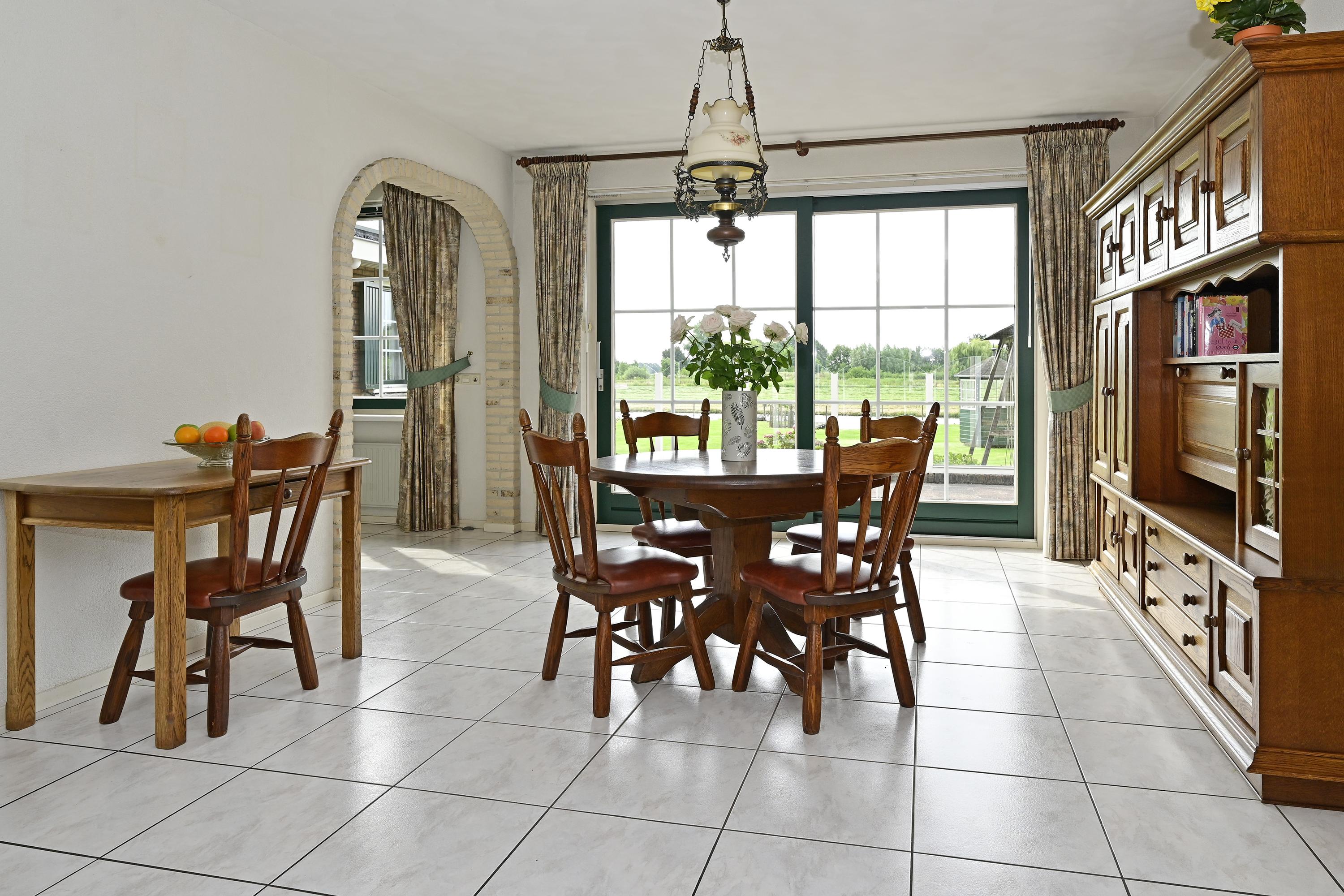 Via een fraaie houten glaswand met bijpassende deur betreedt u de sfeervolle woonkamer in L-vorm waar grote raampartijen zorgen voor een overvloed aan daglicht en een prachtig zicht op de voortuin en zijkant van het perceel. Een marmeren plateau met afsluitbare houtgestookte open haard vormt het centrale punt voor een gezellige zithoek. Aan de achterzijde is volop ruimte voor een grote eettafel, pal naast de openslaande deuren naar het verhoogde en onderheide terras – met een adembenemend uitzicht over de tuin, het water en het uitgestrekte polderlandschap. De eetkamer staat via een elegante toog in verbinding met de ruime, lichte keuken, die voorzien is van dubbele openslaande ramen met zicht op de achtertuin. De keuken is uitgerust met volop kastruimte en diverse inbouwapparatuur: een vaatwasser, oven, elektrische kookplaat met afzuigkap en een koel-/vriescombinatie. Aansluitend treft u de praktische bijkeuken met vaste kast (waar zich de verdeling van de vloerverwarming bevindt), extra opbergruimte, en aansluitingen voor de wasmachine en de wasdroger, een extra wastafel én een deur naar het verhoogde terras. De gehele begane grond is voorzien van een doorlopende tegelvloer met comfortabele vloerverwarming. Alle raamkozijnen zijn uitgevoerd in hardhout, en alle ramen zijn voorzien van houten luiken of rolluiken – een stijlvolle combinatie van comfort en klassieke charme.