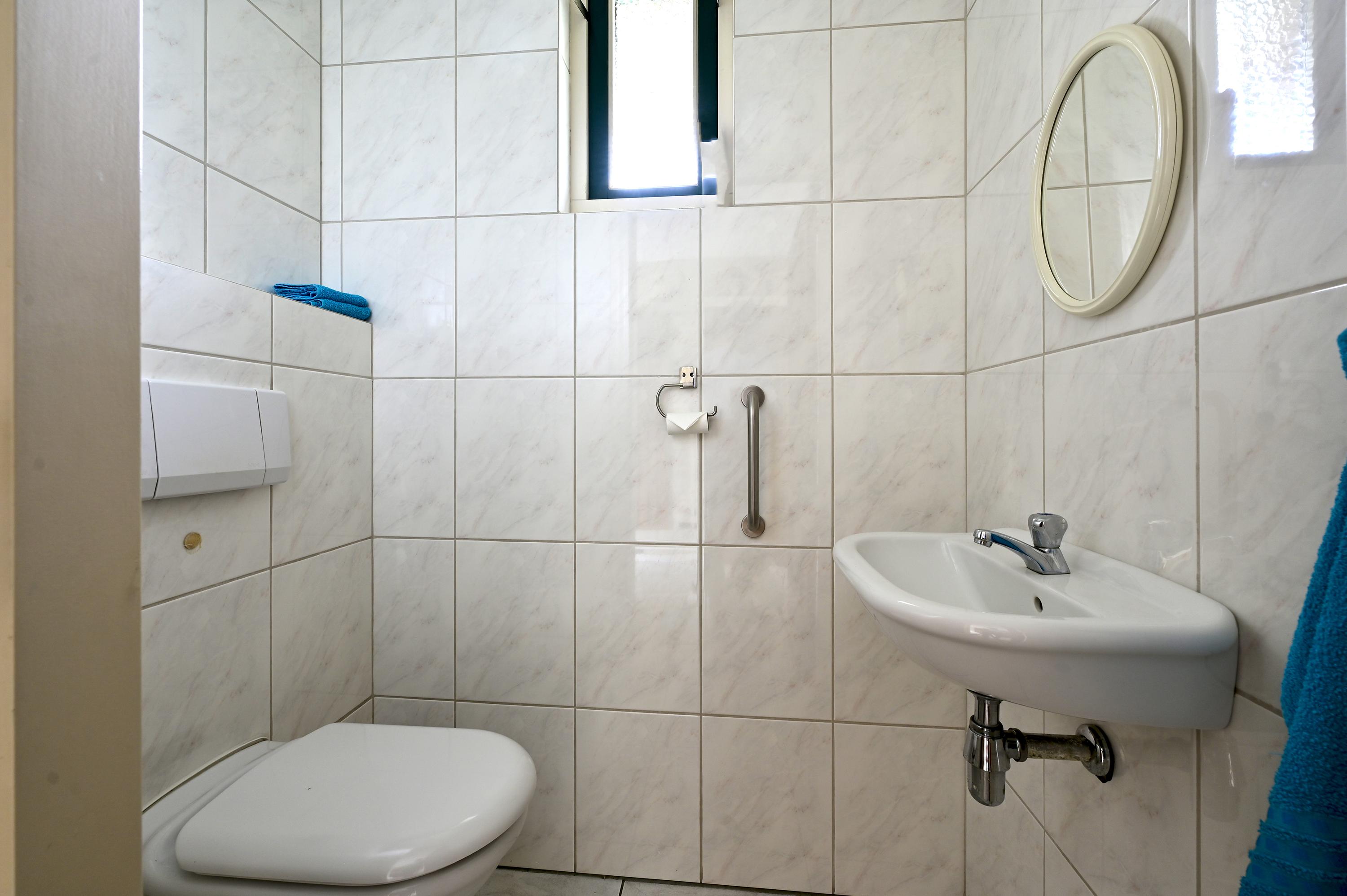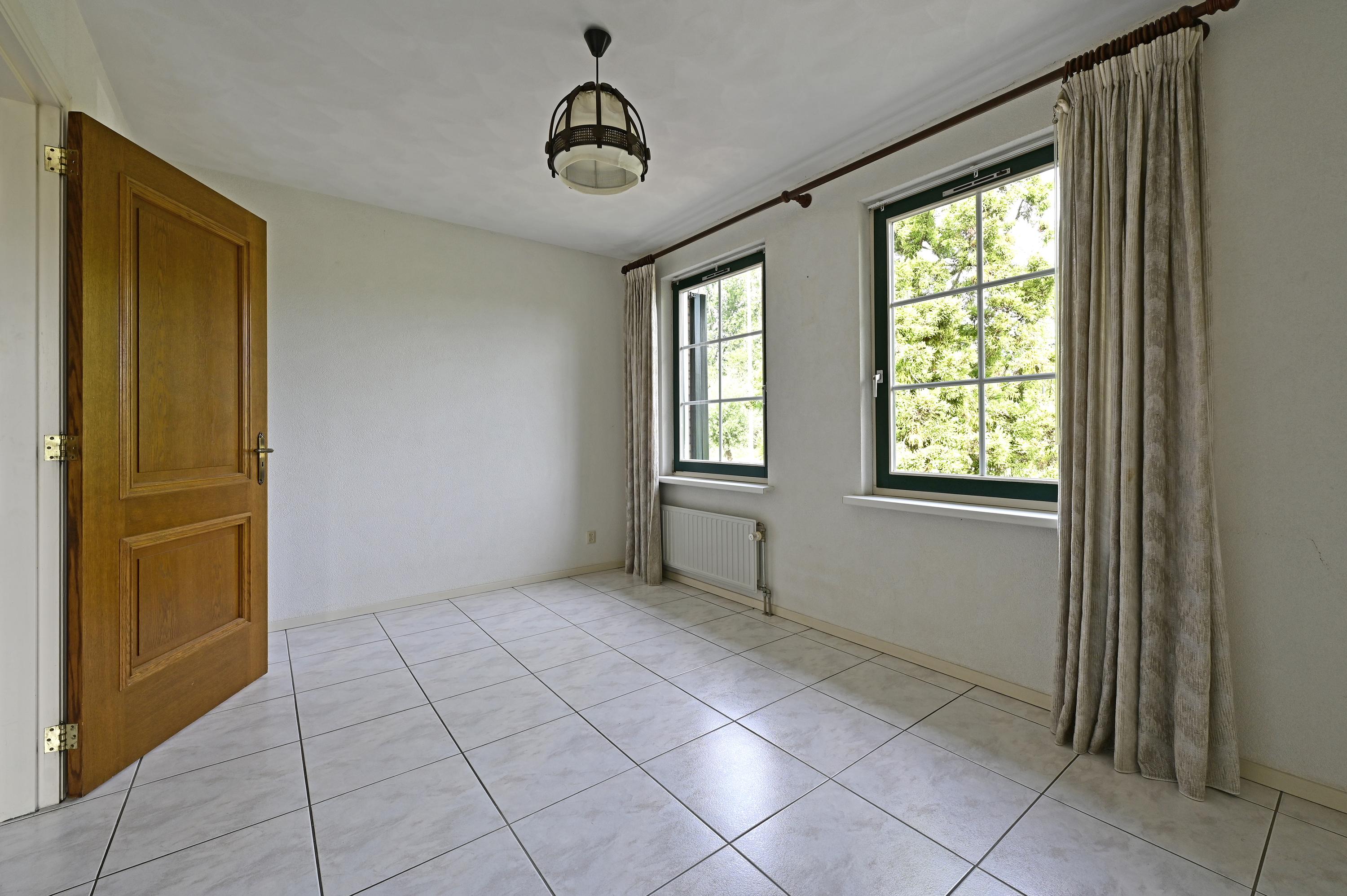 Tegenover de badkamer bevindt zich een ruim separaat toilet met fontein, in dezelfde stijl betegeld als de badkamer en met een te openen raam voor natuurlijke ventilatie. Direct daarnaast vindt u de meterkast, netjes weggewerkt achter een aparte deur. Aan de rechterzijde van de hal bevindt zich een tweede, iets kleinere slaapkamer met twee grote ramen die uitkijken op de voortuin. Deze kamer is veelzijdig in gebruik – ideaal als werkkamer, logeerkamer of speelruimte. Onder de trap is bovendien praktische ruimte voor een garderobe.