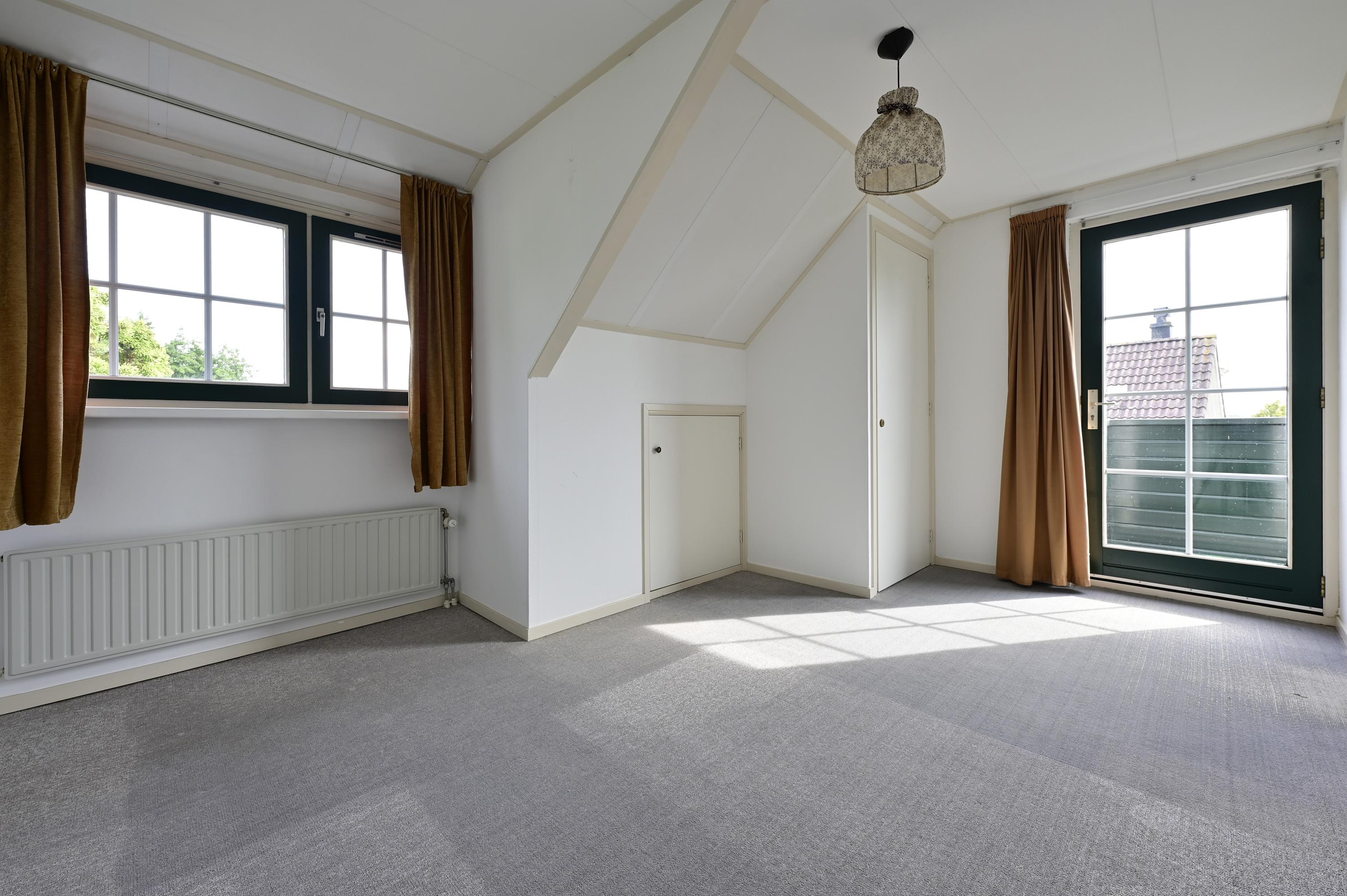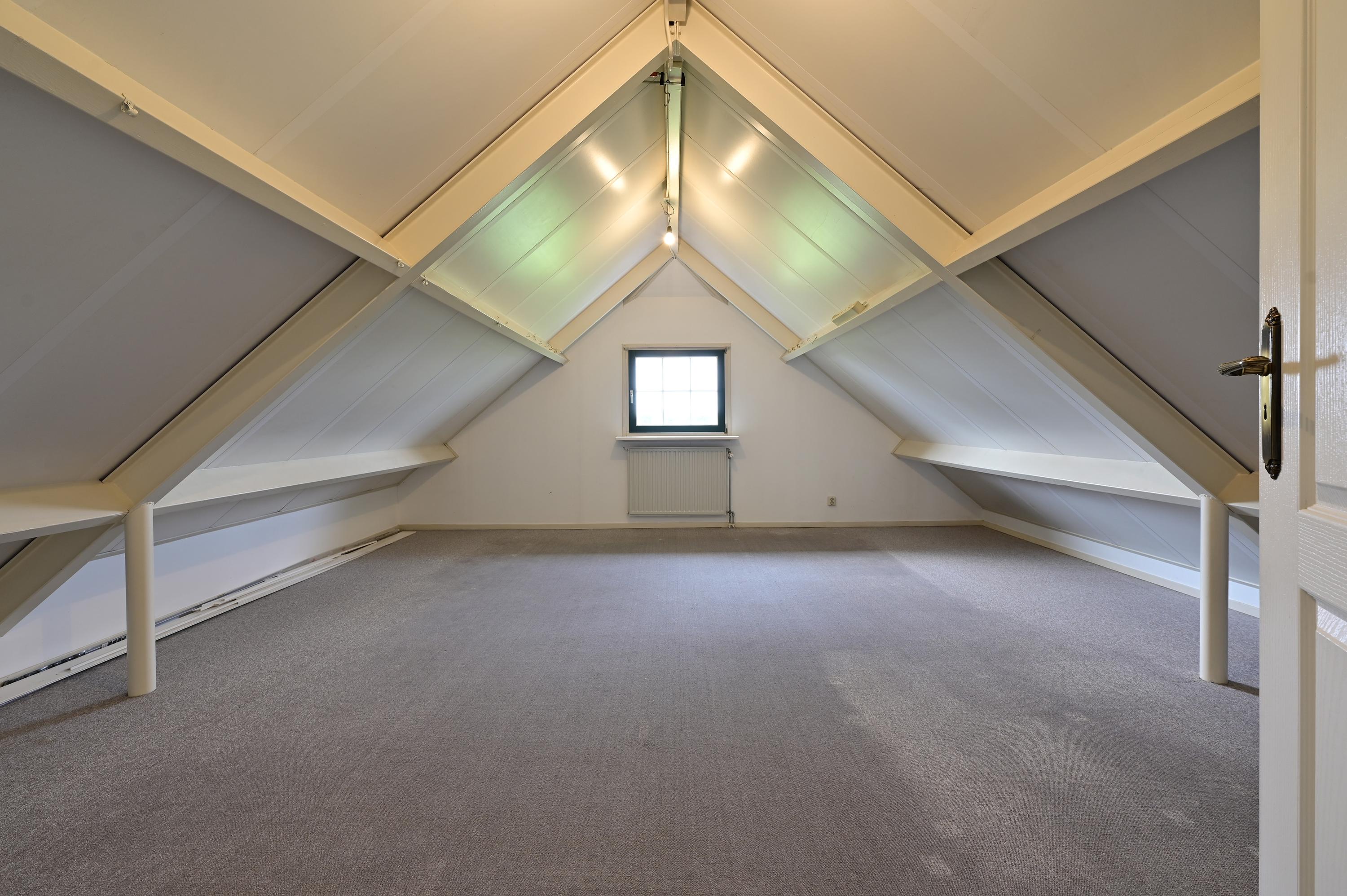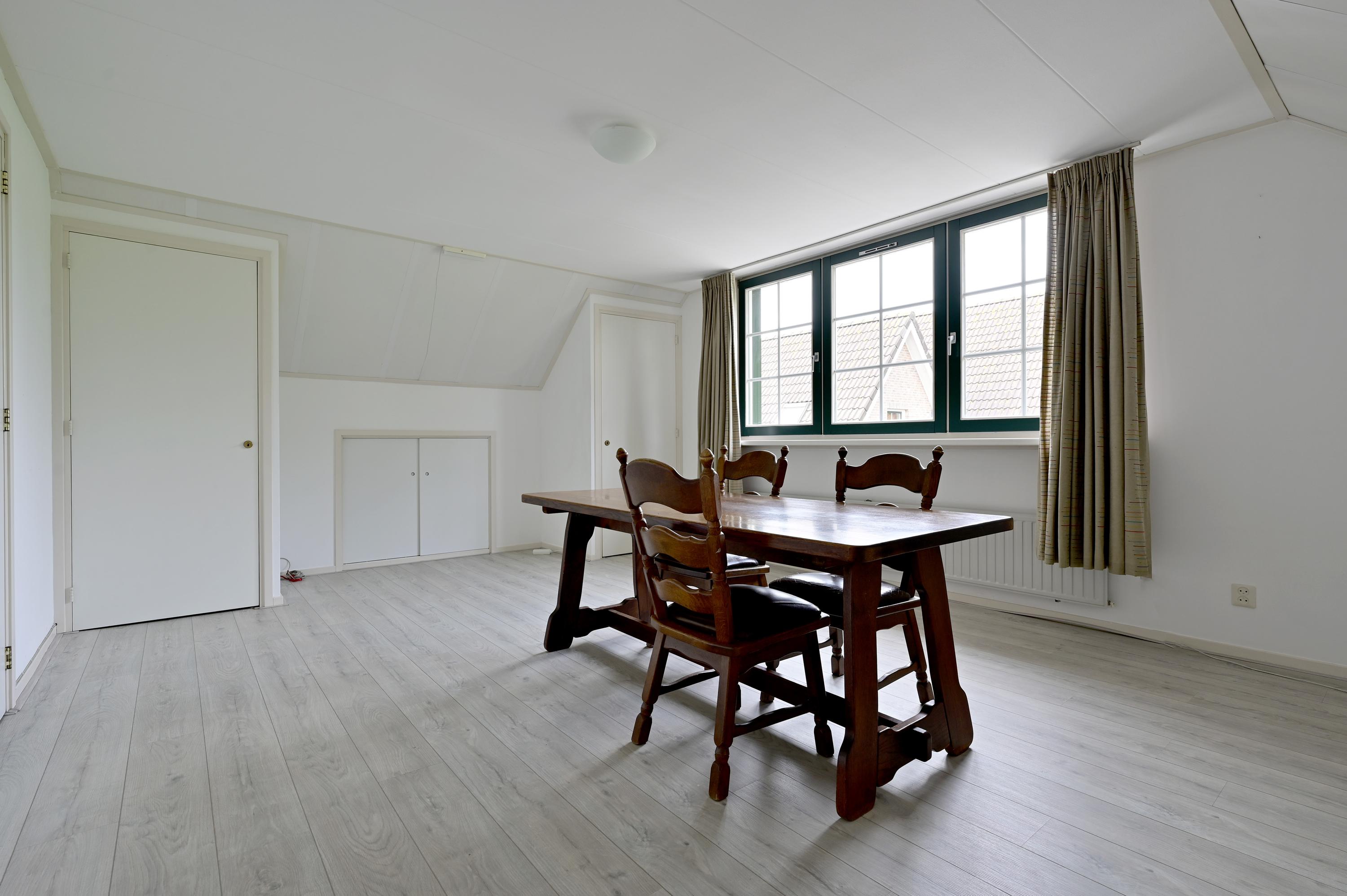 Centraal op de overloop vindt u een ruime opbergkast en de grote badkamer, uitgevoerd in wit en blauw tegelwerk. De badkamer is van alle gemakken voorzien: een ligbad, een toilet, een wastafelmeubel met spiegel én een royale inloopdouche. Dankzij de dakkapel met dubbele te openen ramen stroomt het daglicht royaal naar binnen en heeft u een prachtig vrij uitzicht over de achtertuin. Tot slot bevindt zich naast de badkamer een ruime slaapkamer met een groot raam aan de zijkant van de woning. Deze kamer beschikt over twee inbouwkasten en knieschotten aan weerszijden, waardoor ook hier volop bergruimte aanwezig is. Net als op de rest van de woning zijn alle raamkozijnen op deze verdieping uitgevoerd in hoogwaardig hardhout, wat bijdraagt aan de degelijke, duurzame uitstraling van het geheel.