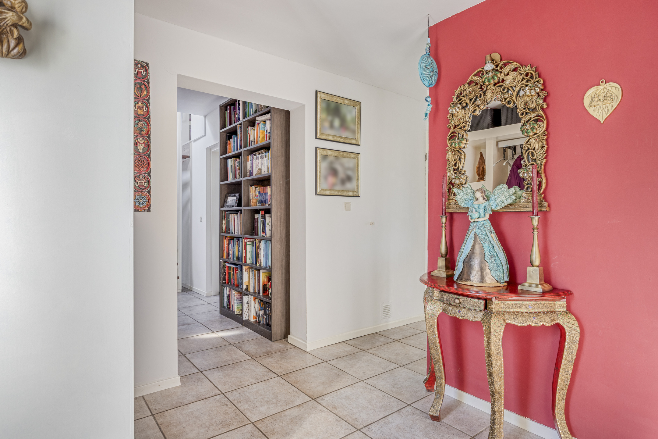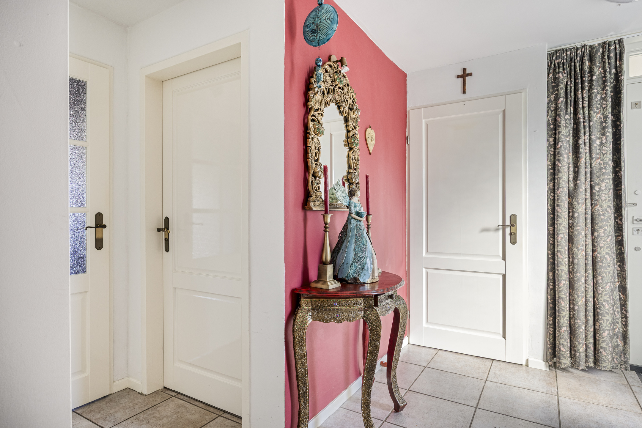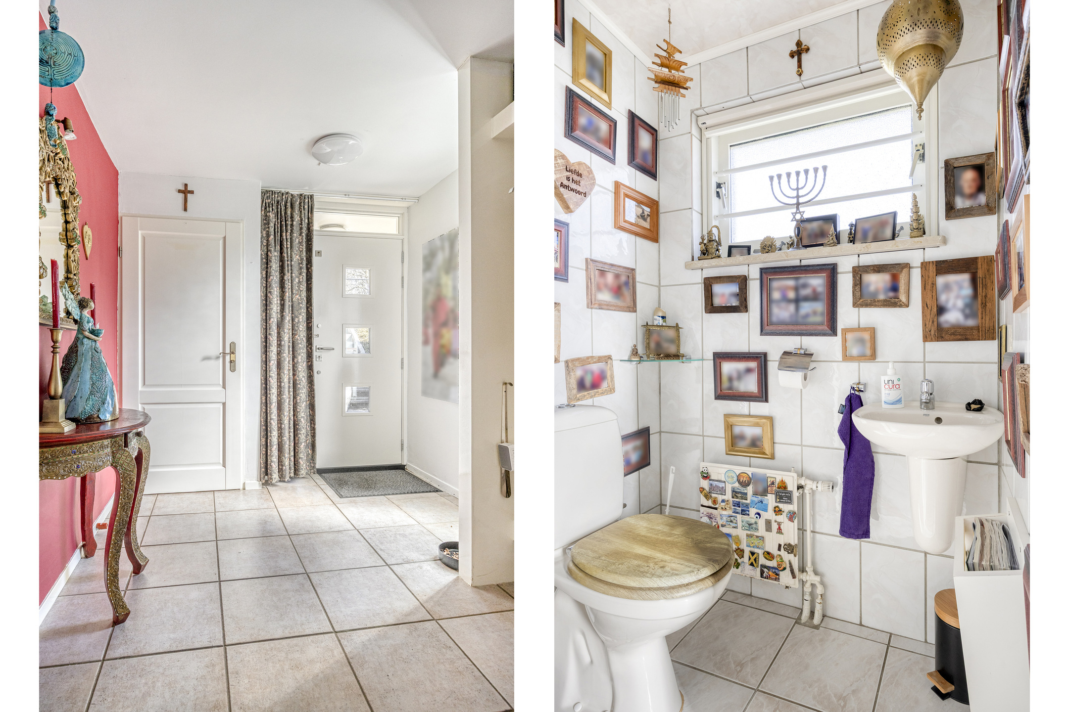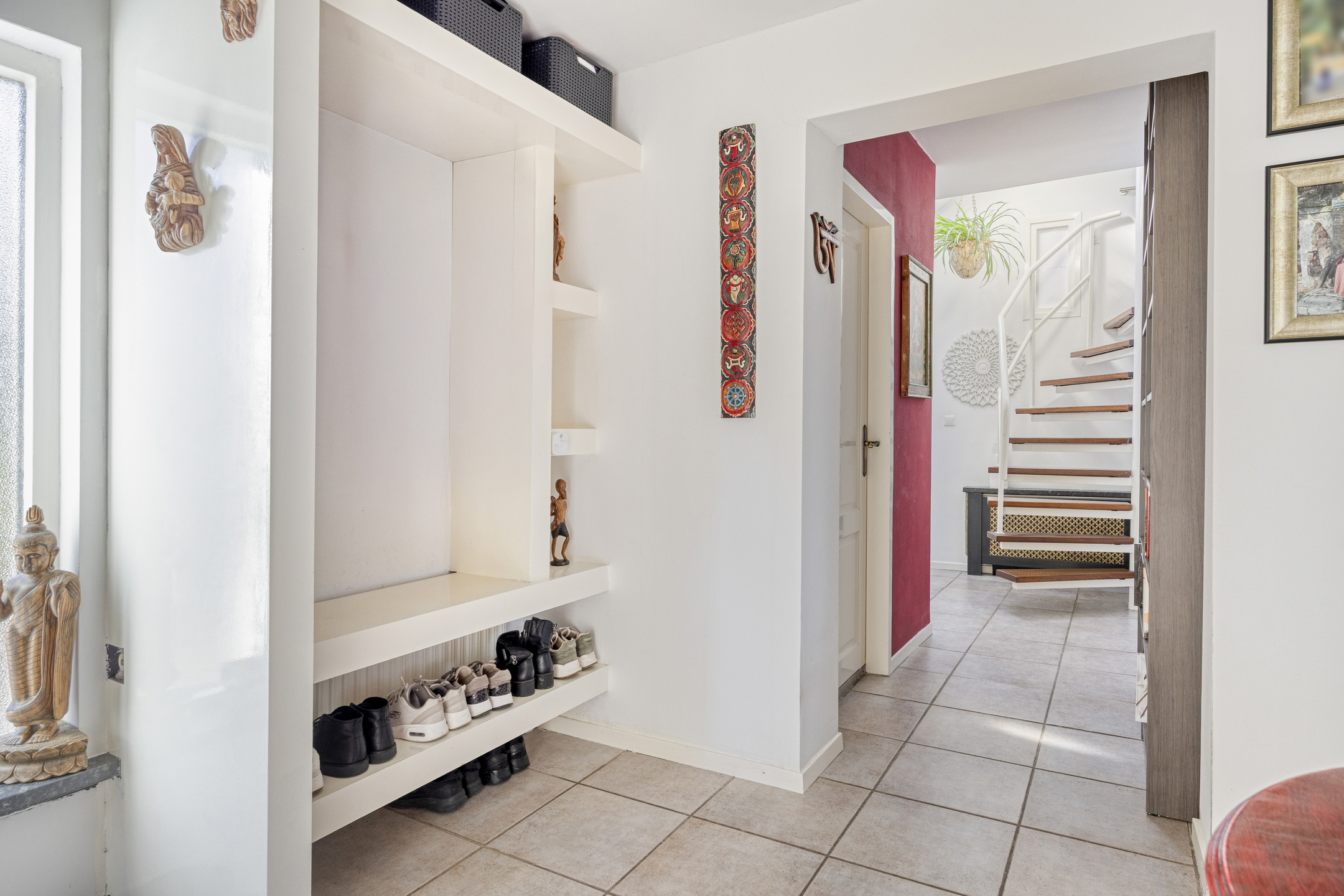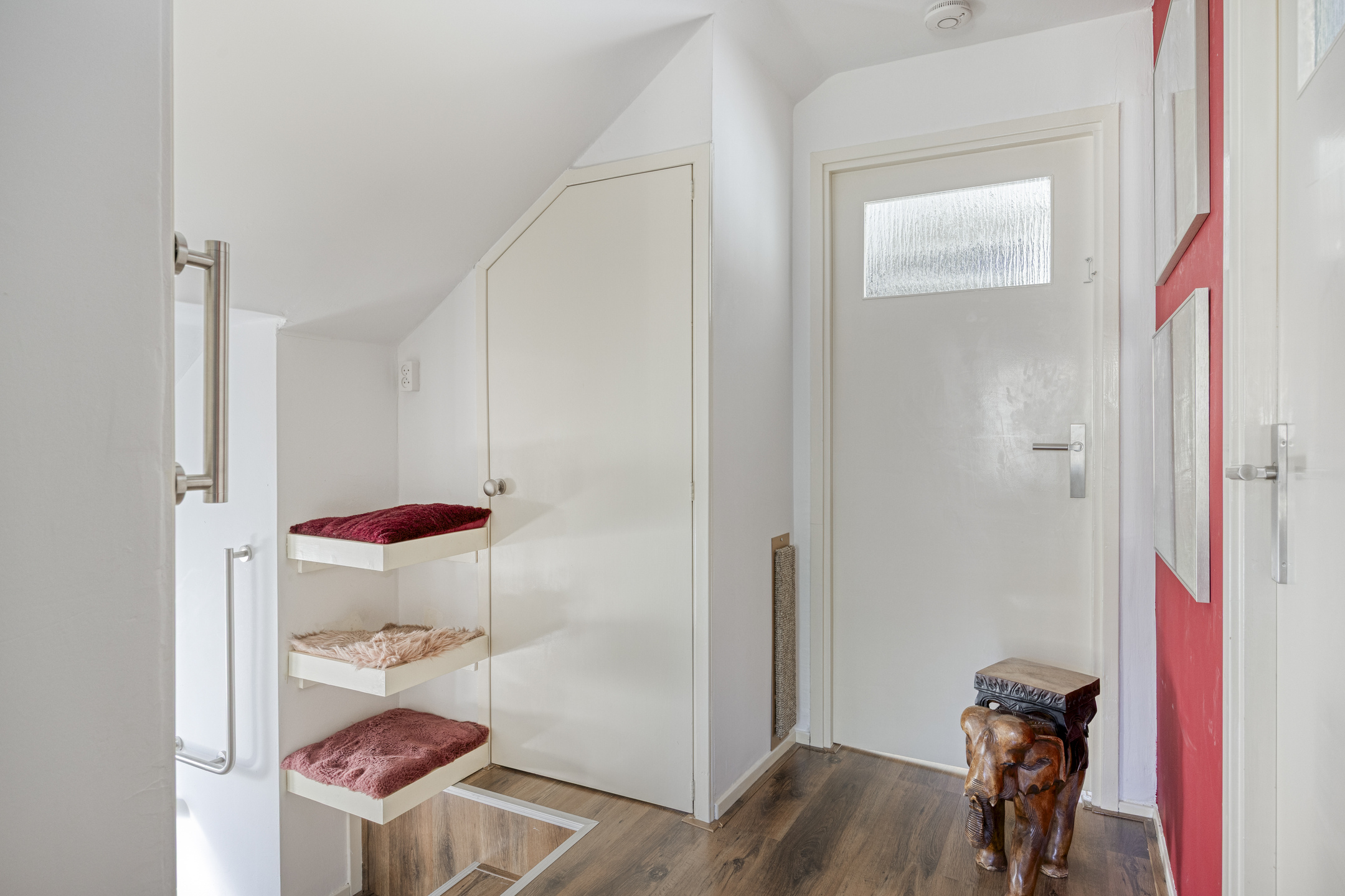 Hal/entree in 2 delen vv. trap naar de 1e verdieping, garderobe en bijkeukenruimte vv. opstelplaats HR-combiketel en wasmachine-/drogeraansluiting;