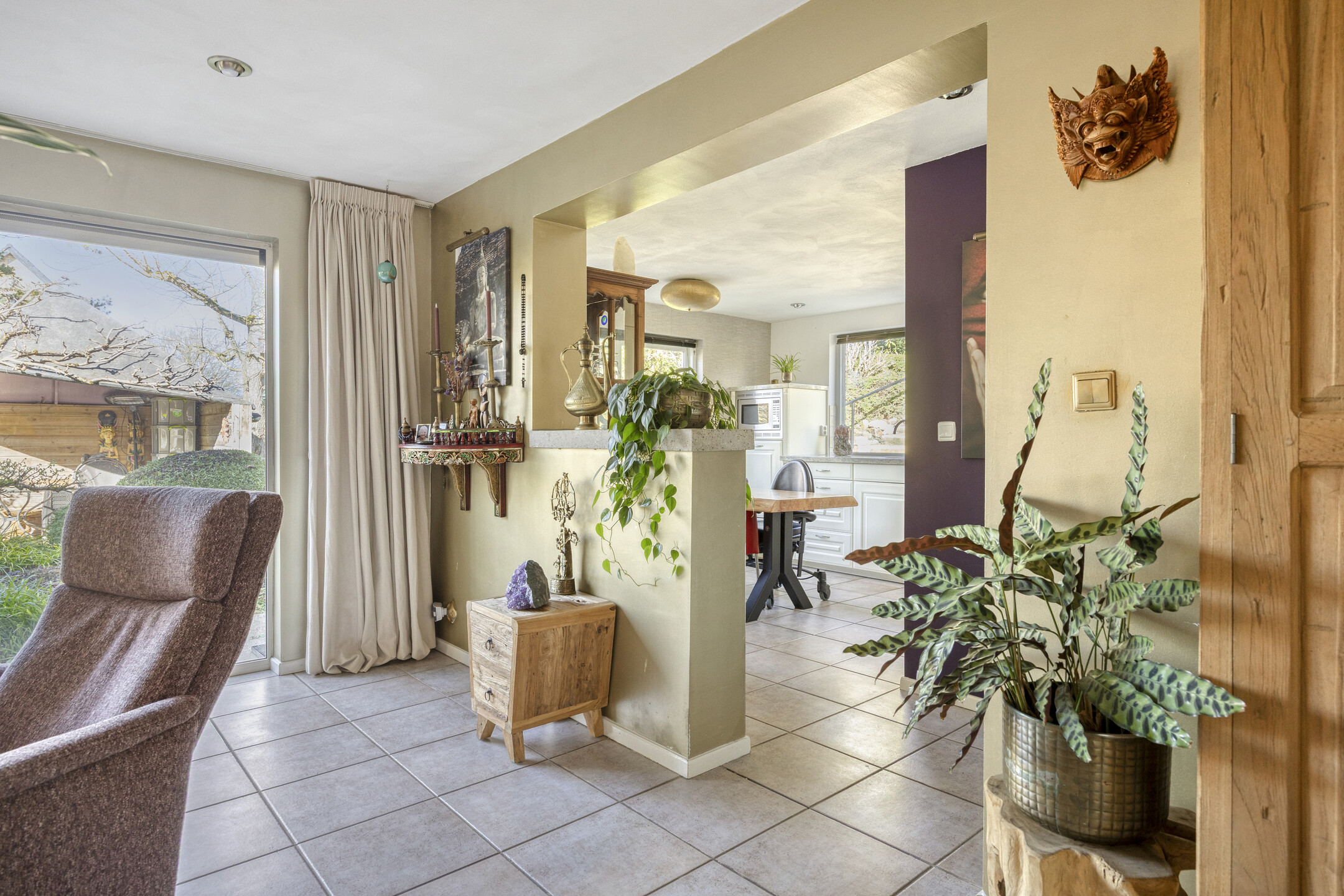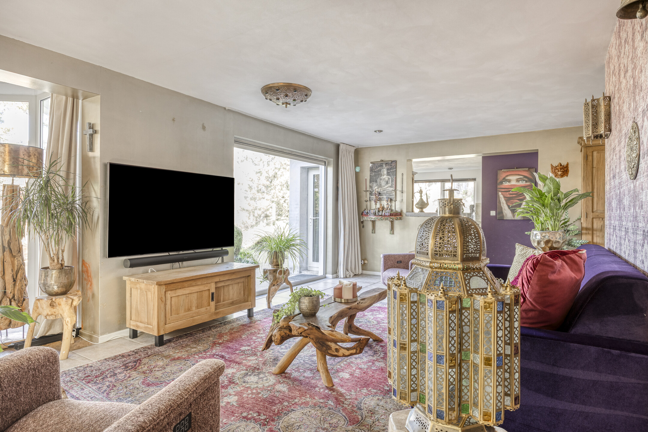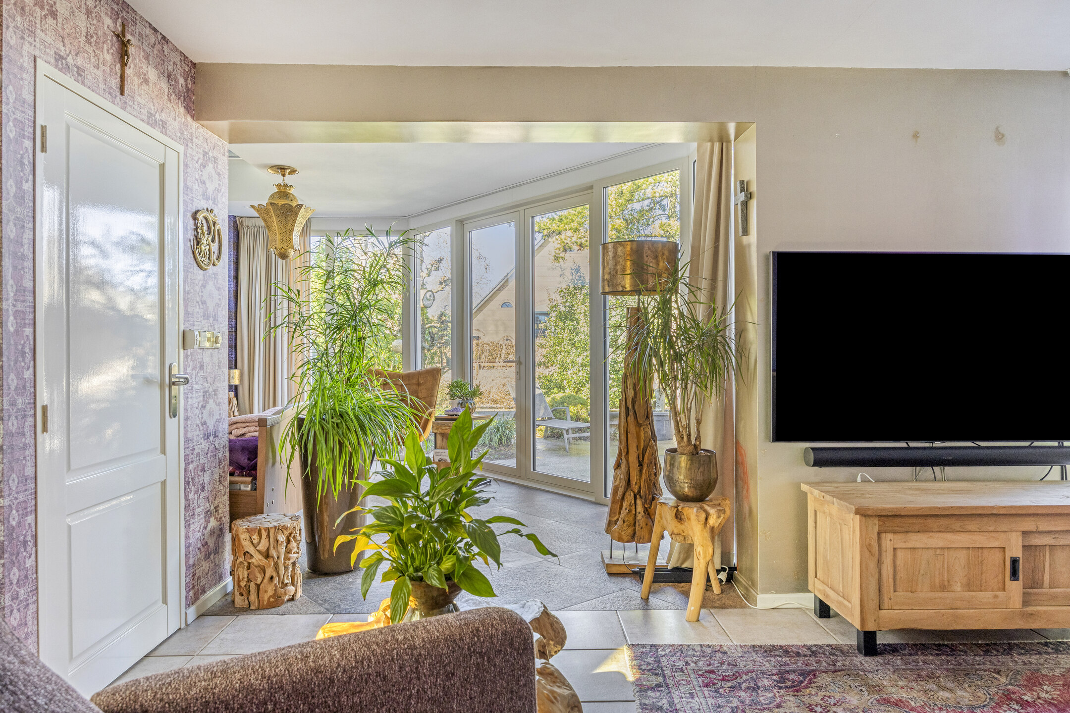 woonkamer met airco, een trapkast vv. luik naar de betegelde kelder en open toegang tot de serre vv. gashaard, lichtstraat en glazen pui vv. tuindeuren met zicht op de tuin en watergang;