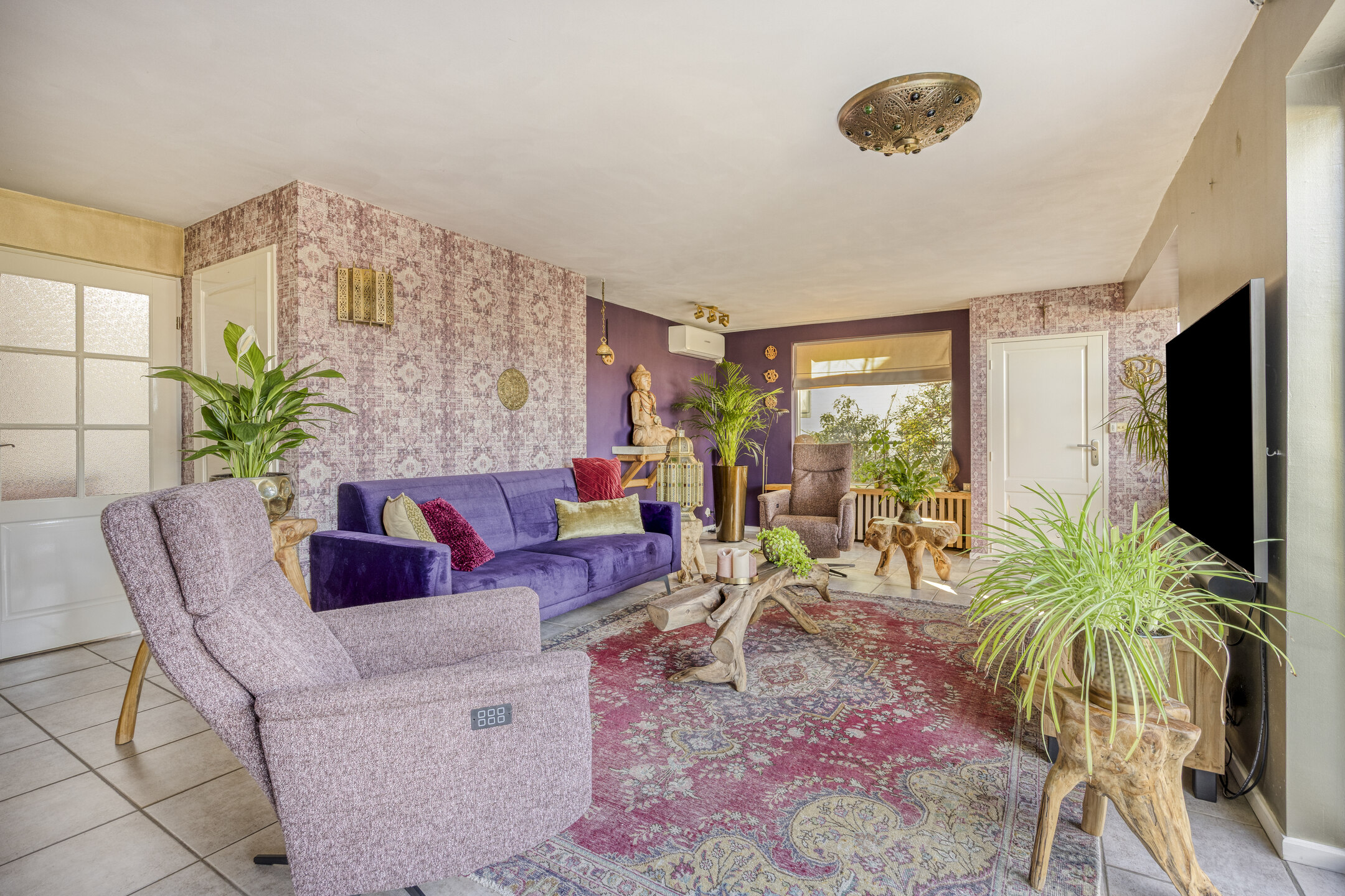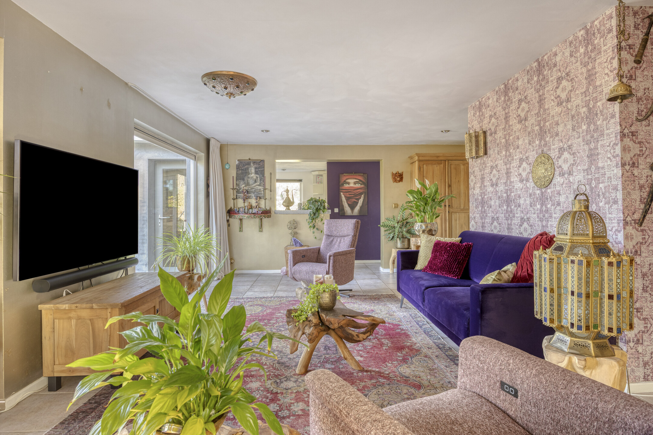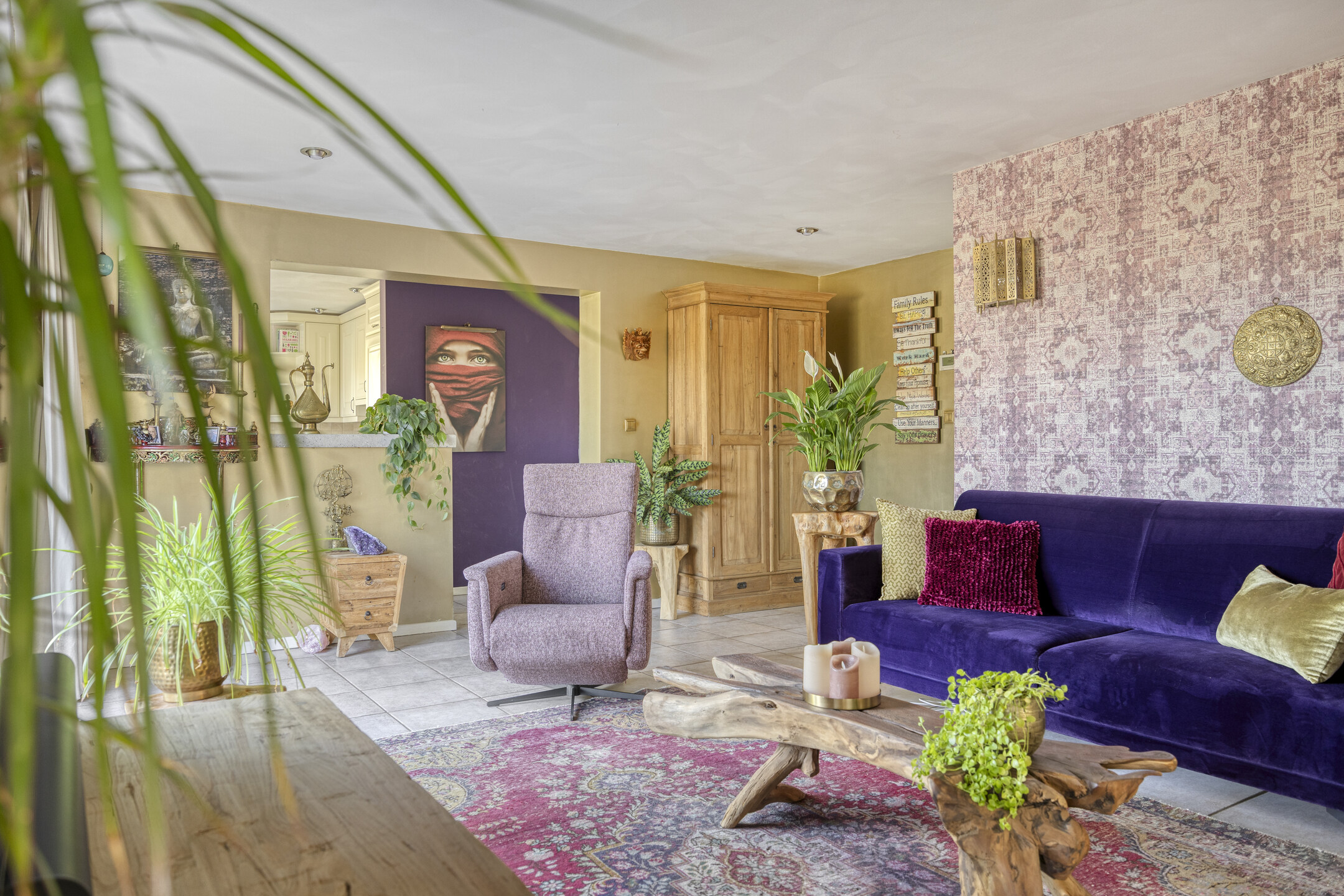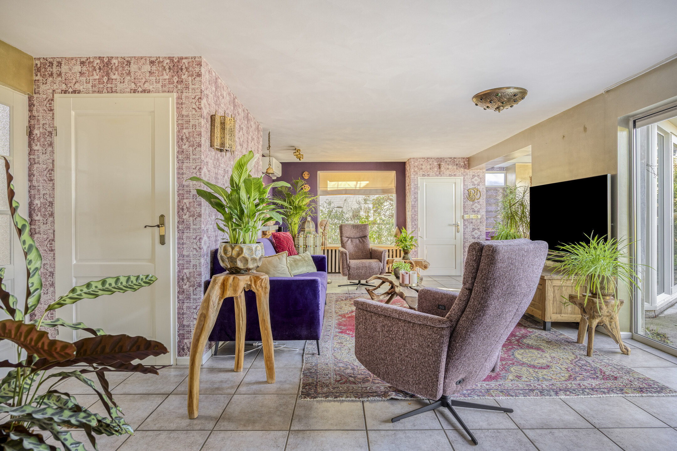 woonkamer met airco, een trapkast vv. luik naar de betegelde kelder en open toegang tot de serre vv. gashaard, lichtstraat en glazen pui vv. tuindeuren met zicht op de tuin en watergang;