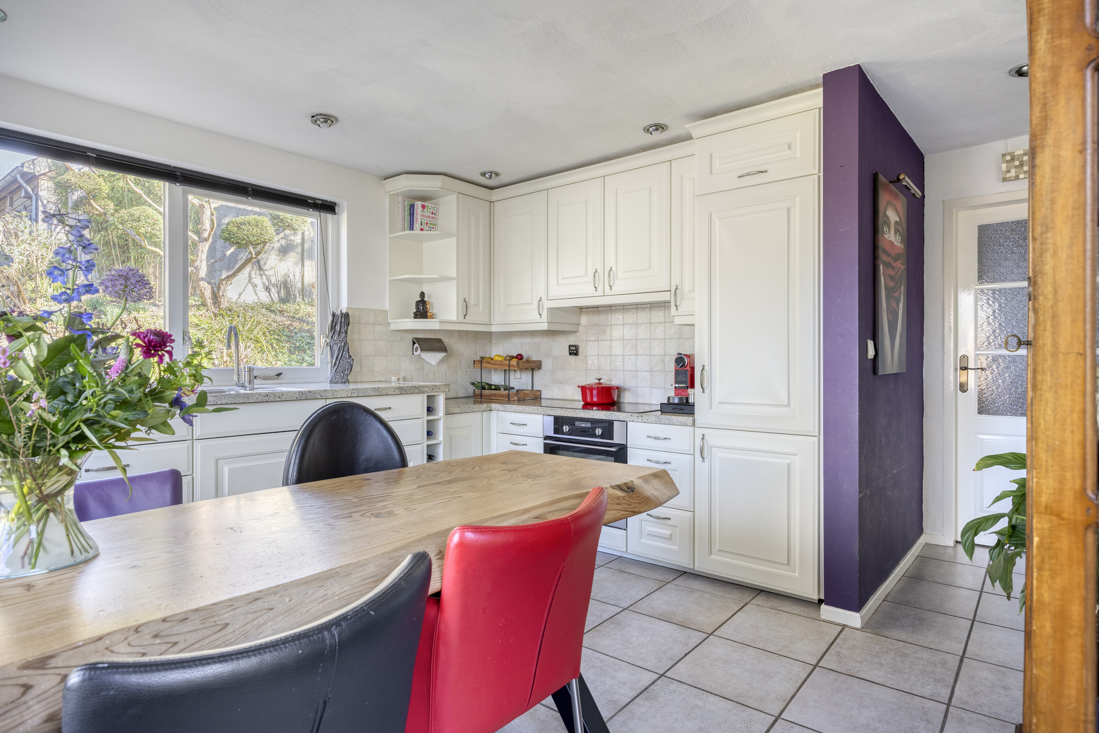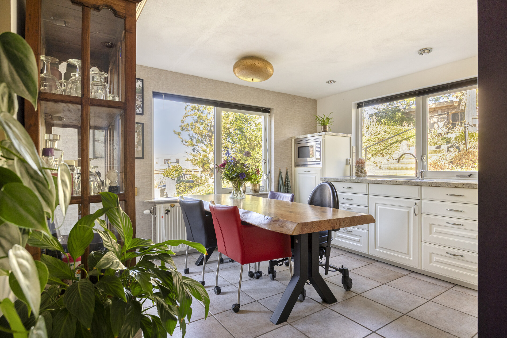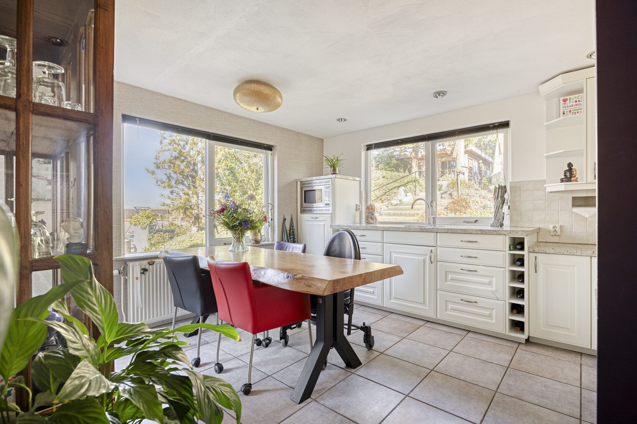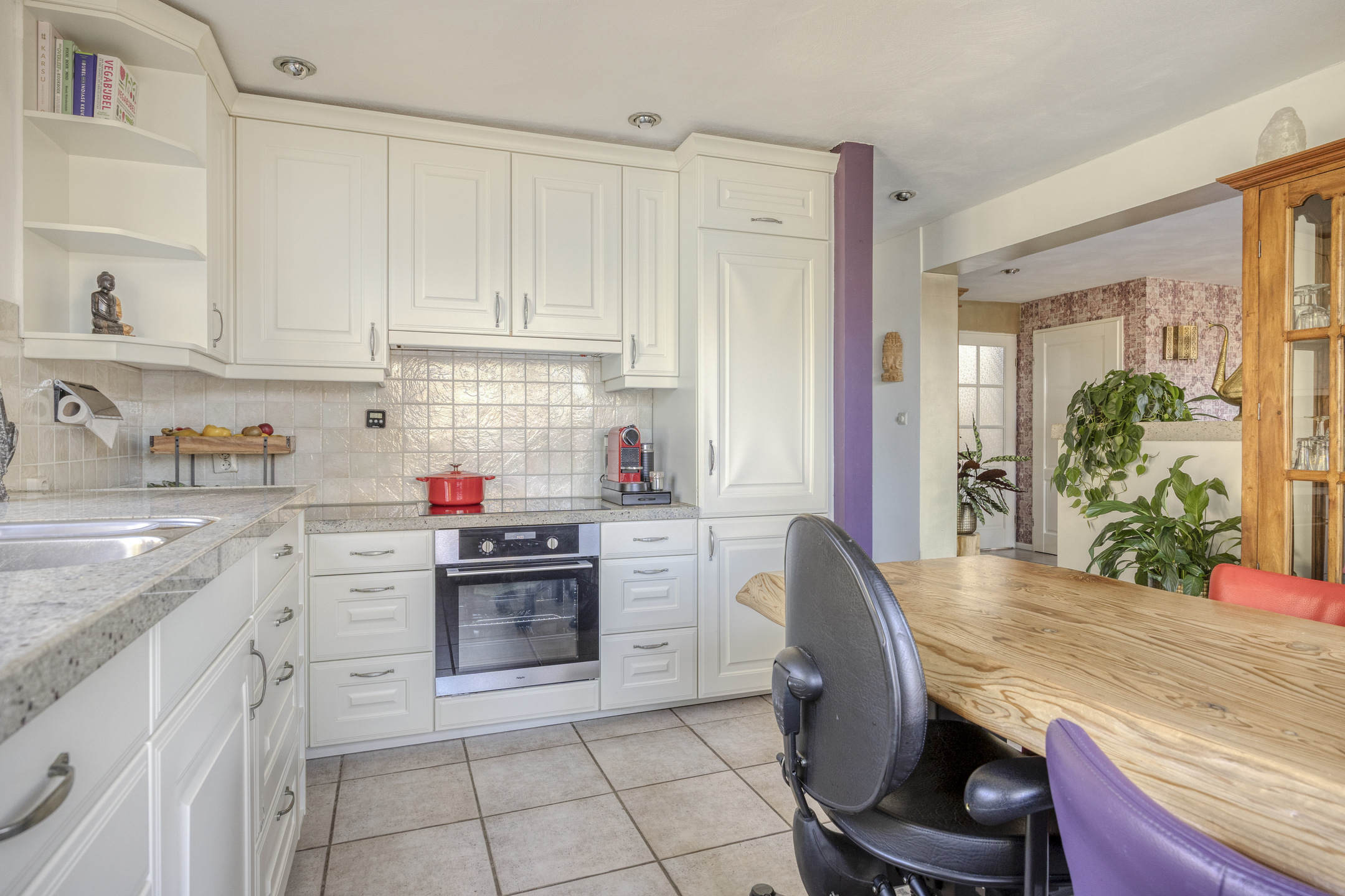 woonkeuken waarin geplaatst een in de hoek opgestelde inbouwkeuken voorzien van een granieten aanrechtblad met 1½ spoelbak, inbouw inductie kookplaat, -koel/vriescombi, -combi oven/magnetron, -elektrische oven, - verhoogde vaatwasser en een afzuigkap, wandafwerking tegels, tegelvloer, plafond vv. inbouwspots;
