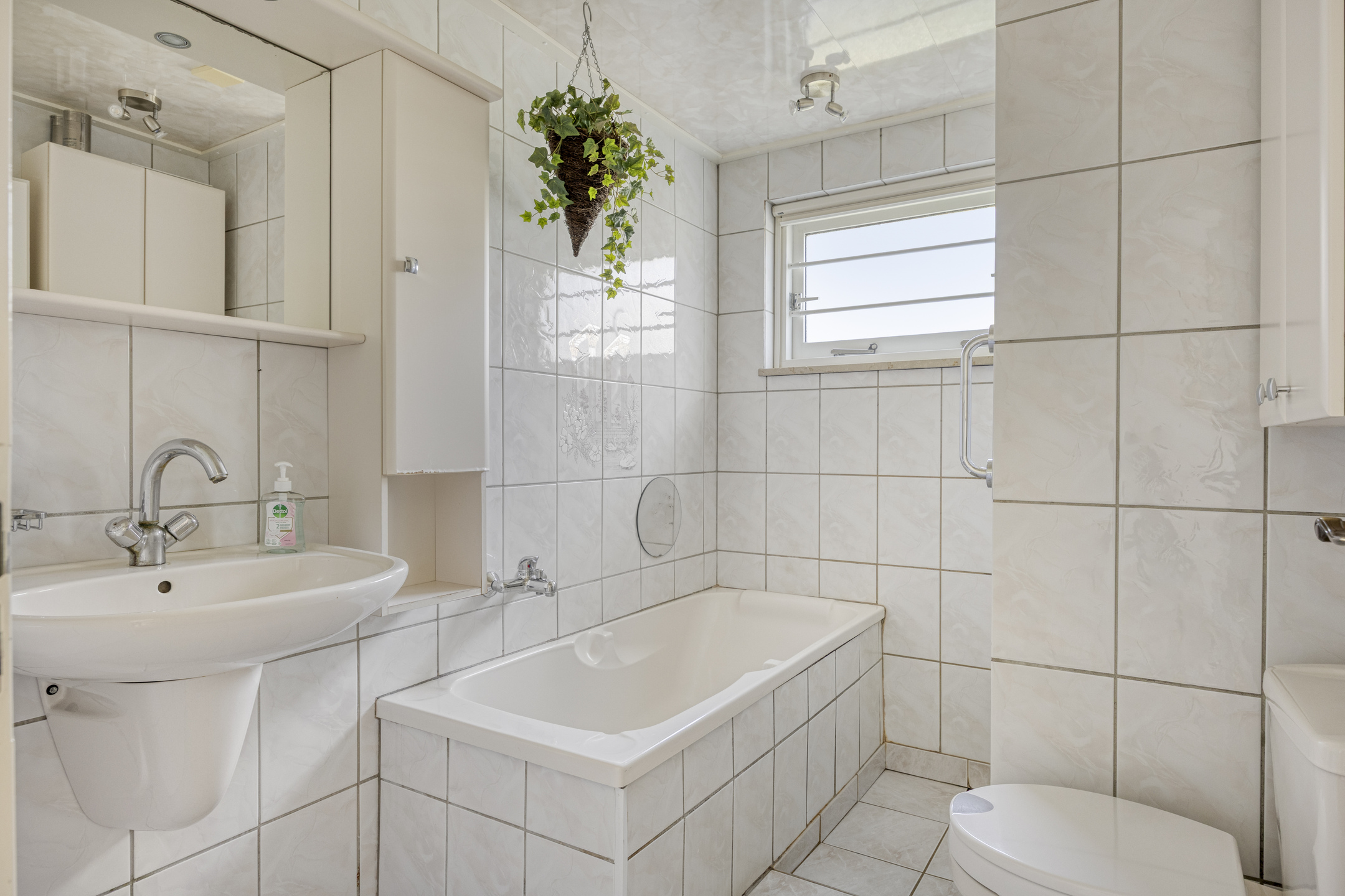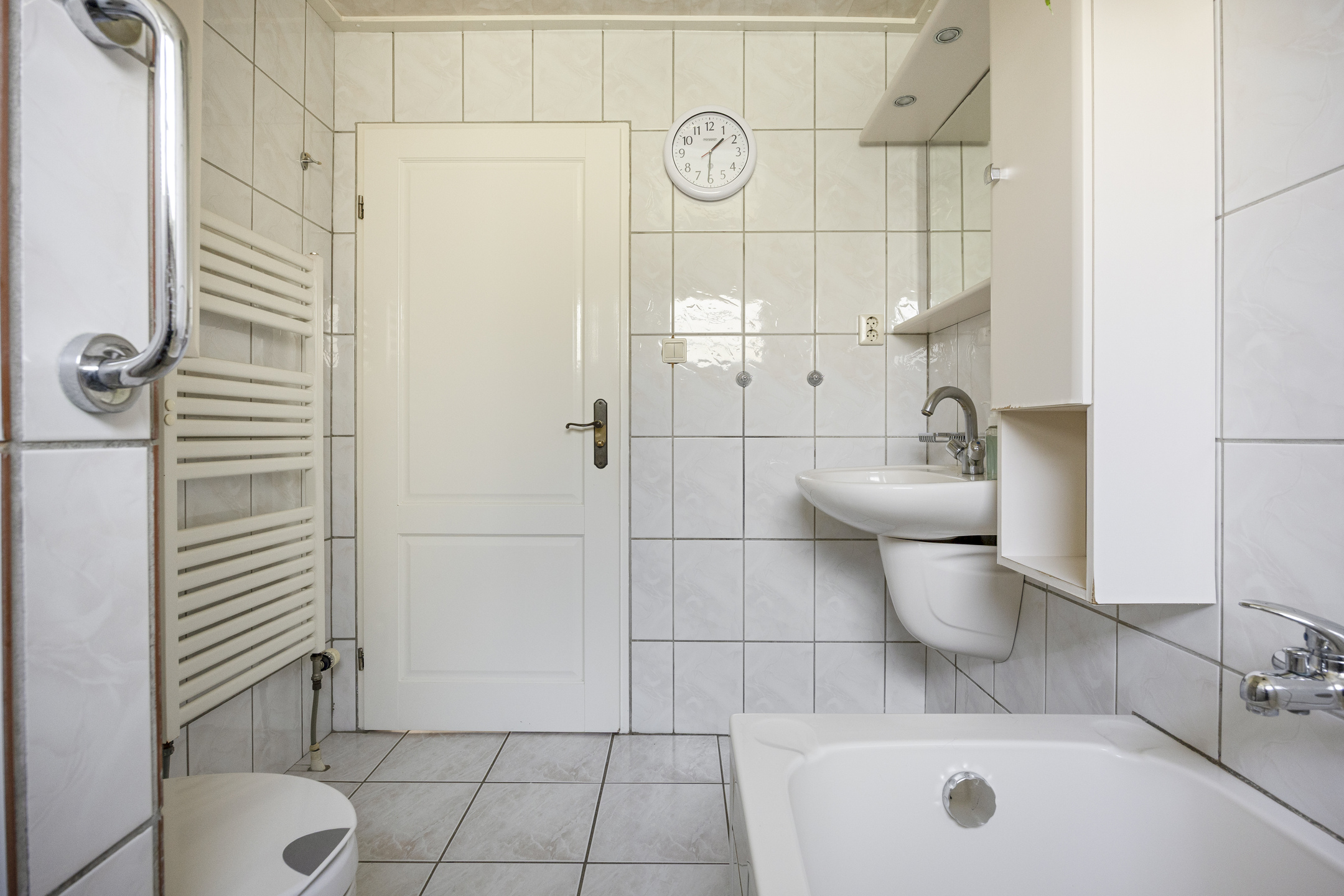betegelde badkamer voorzien van een ligbad, douche, wastafel en toilet;