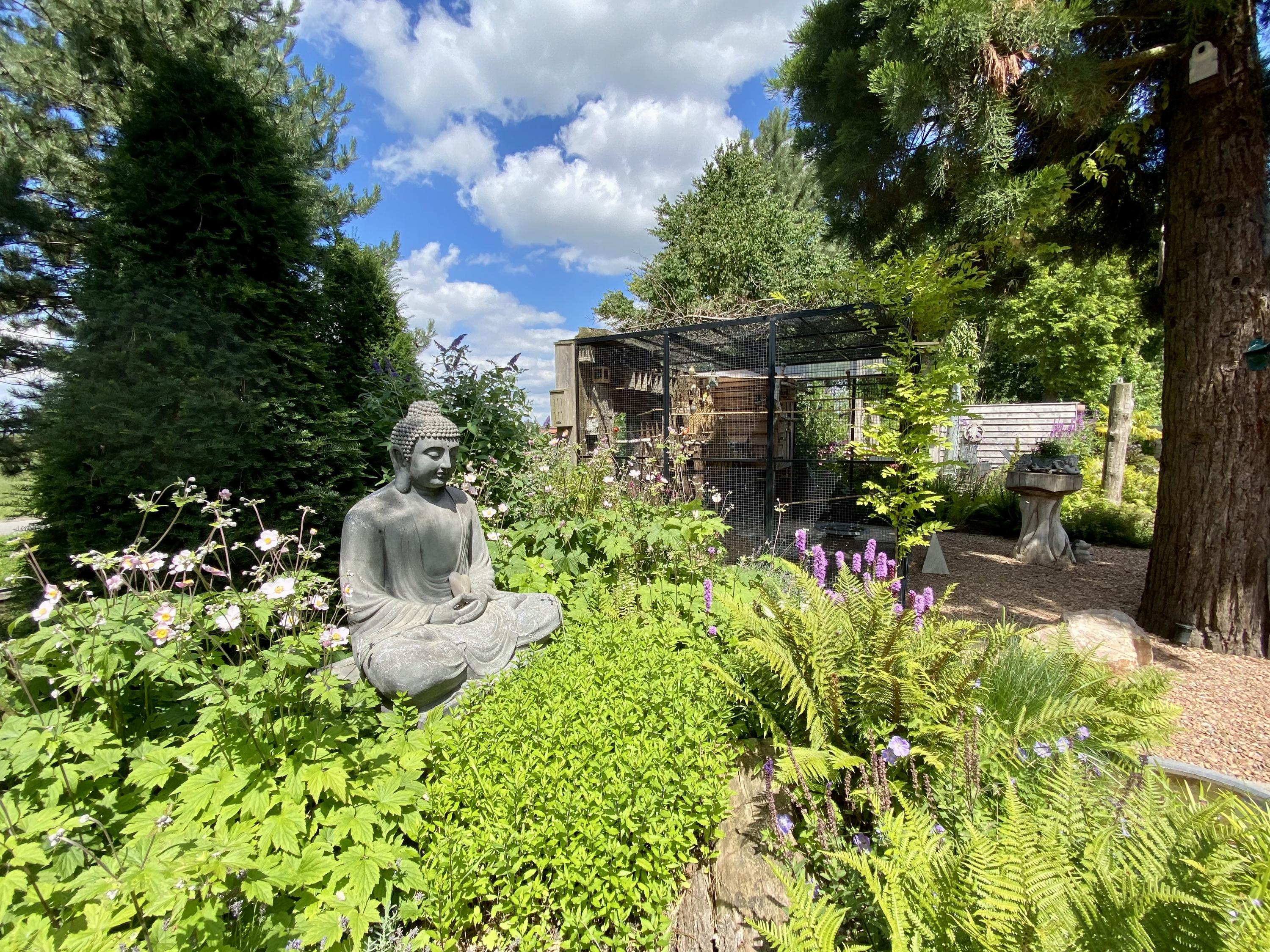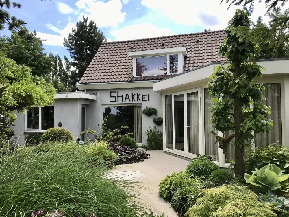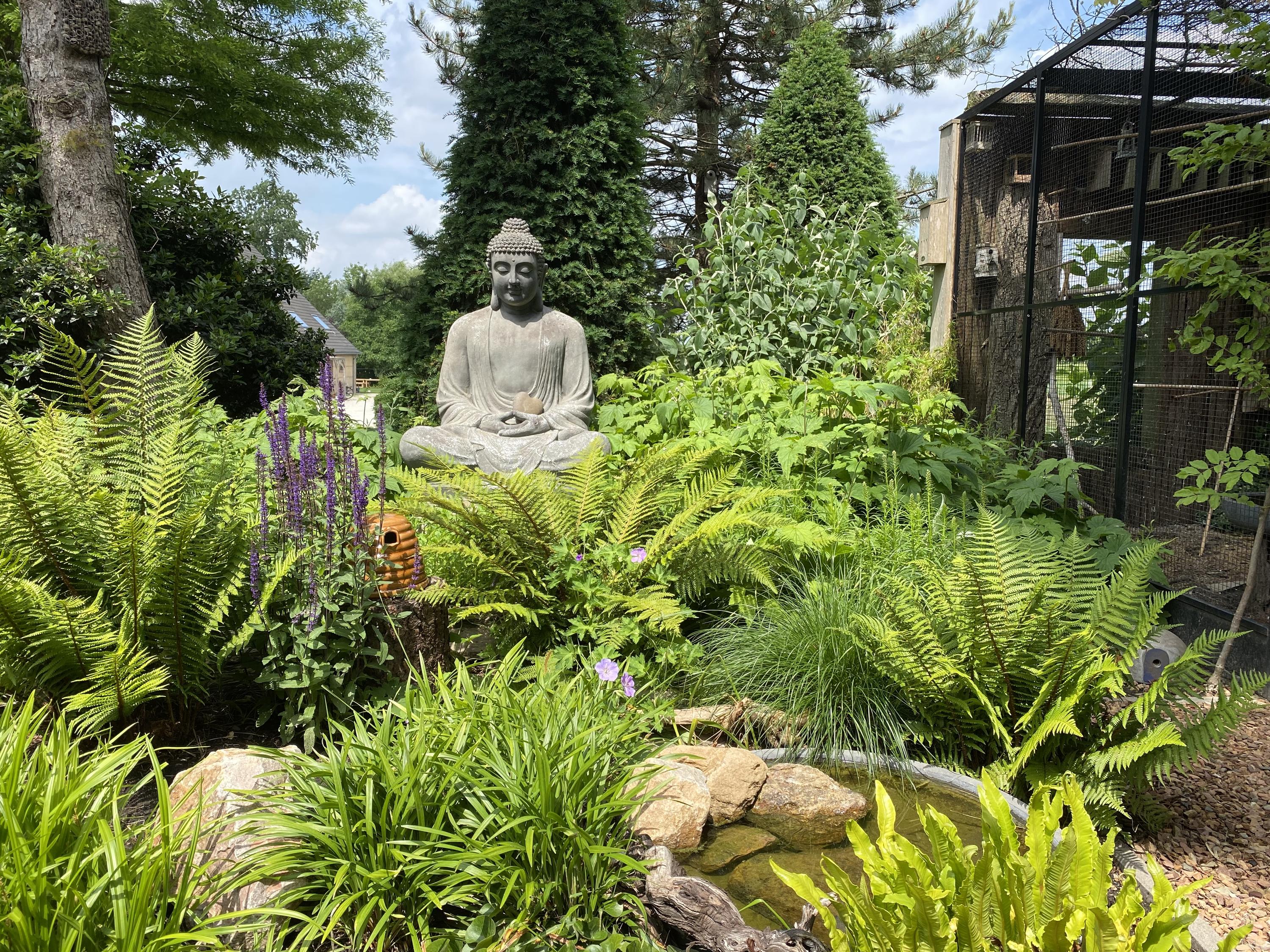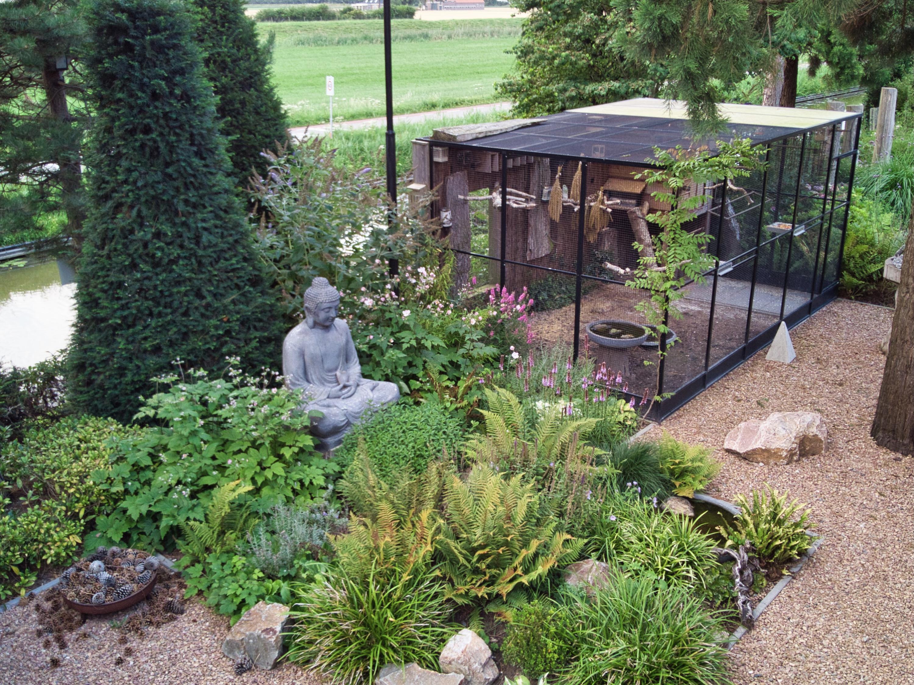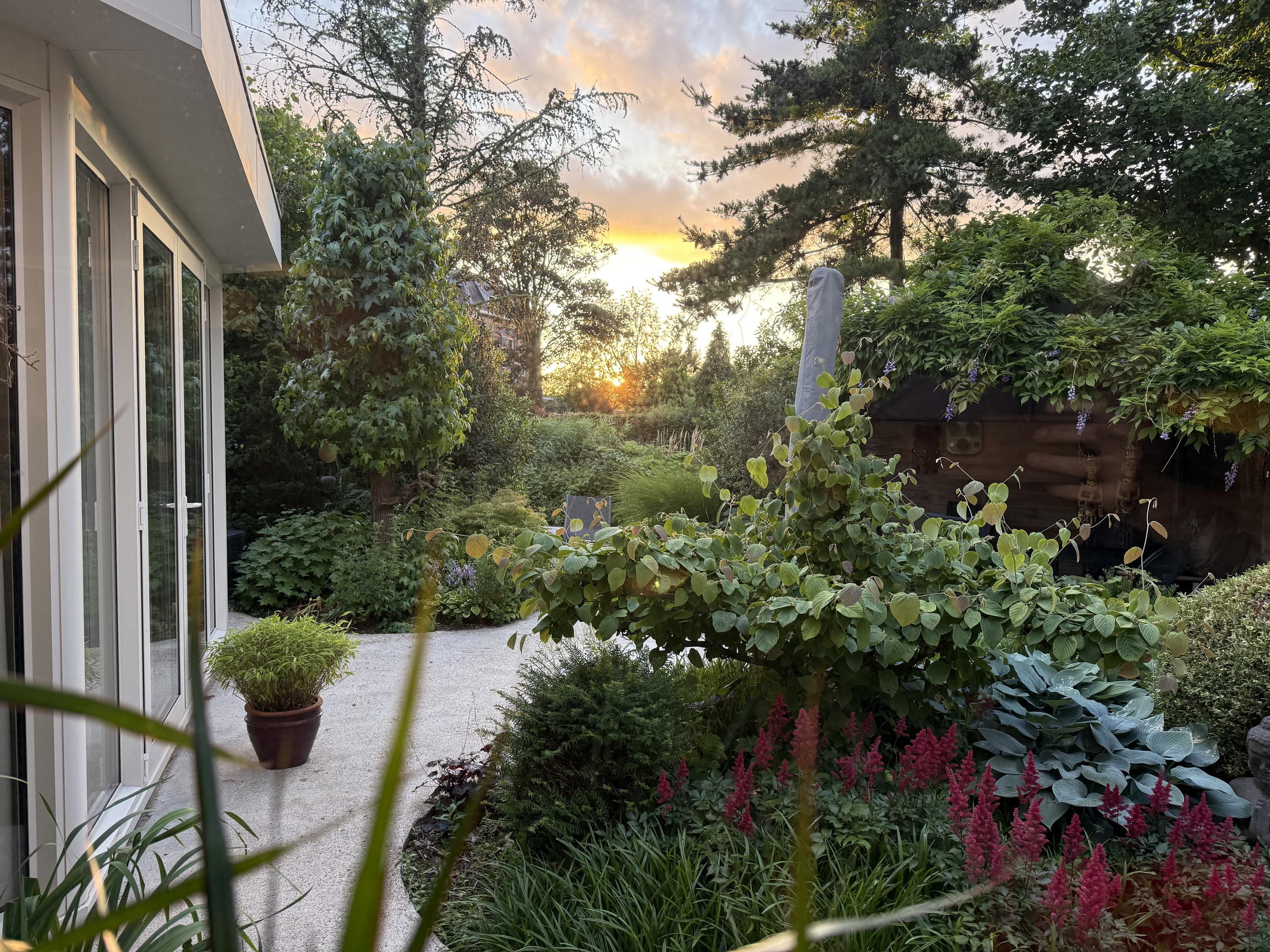 Stijlvol aangelegde en inspiratievolle tuin rondom met Greenlabel A certificering, opgetrokken / ingericht in Japanse stijl vv. veel groen en diverse terrassen, beton gegoten paden (vv. staalnetten), borders, grindpaden, niveauverschil, waterschalen, houten veranda, vogelverblijf;