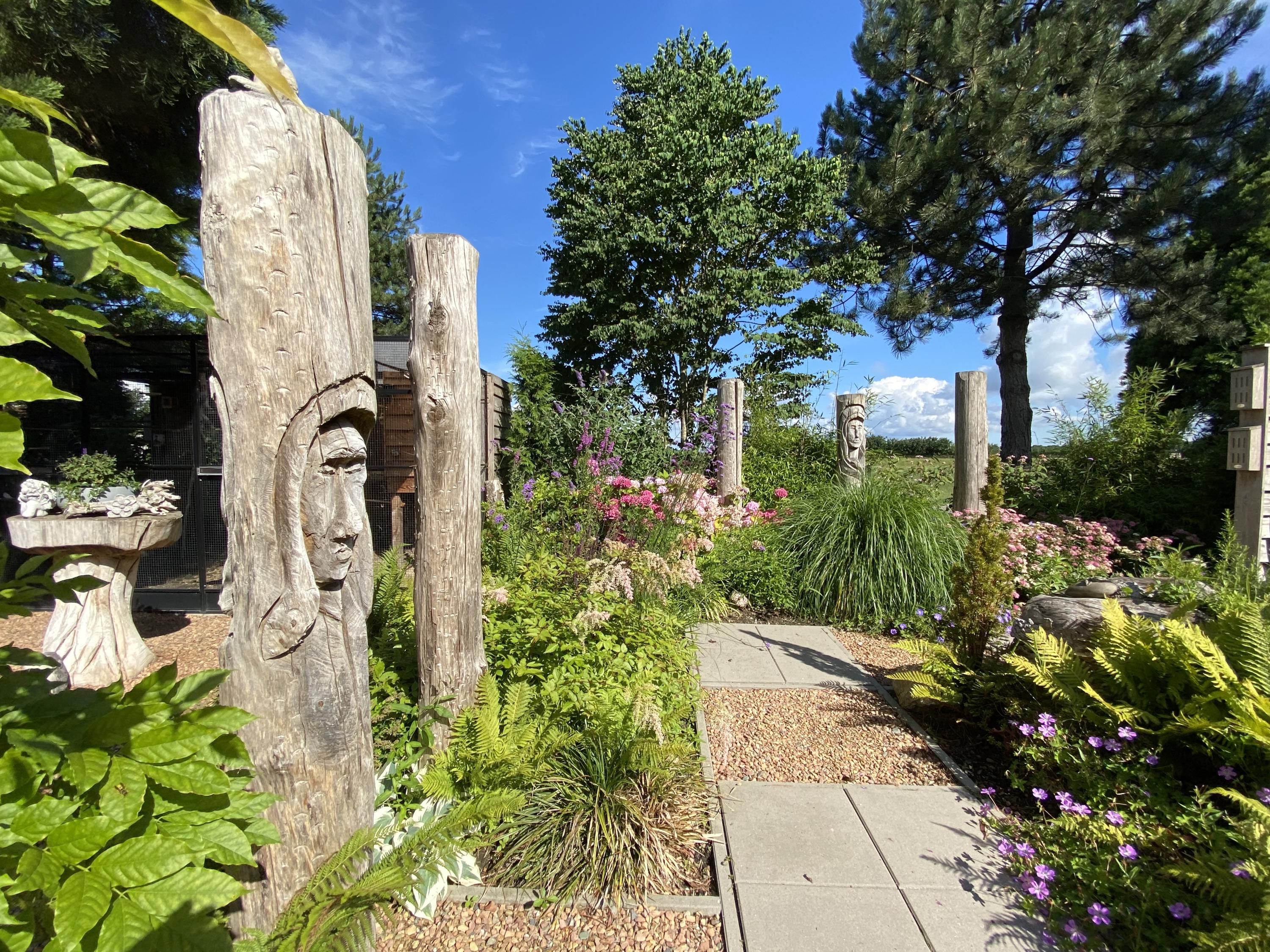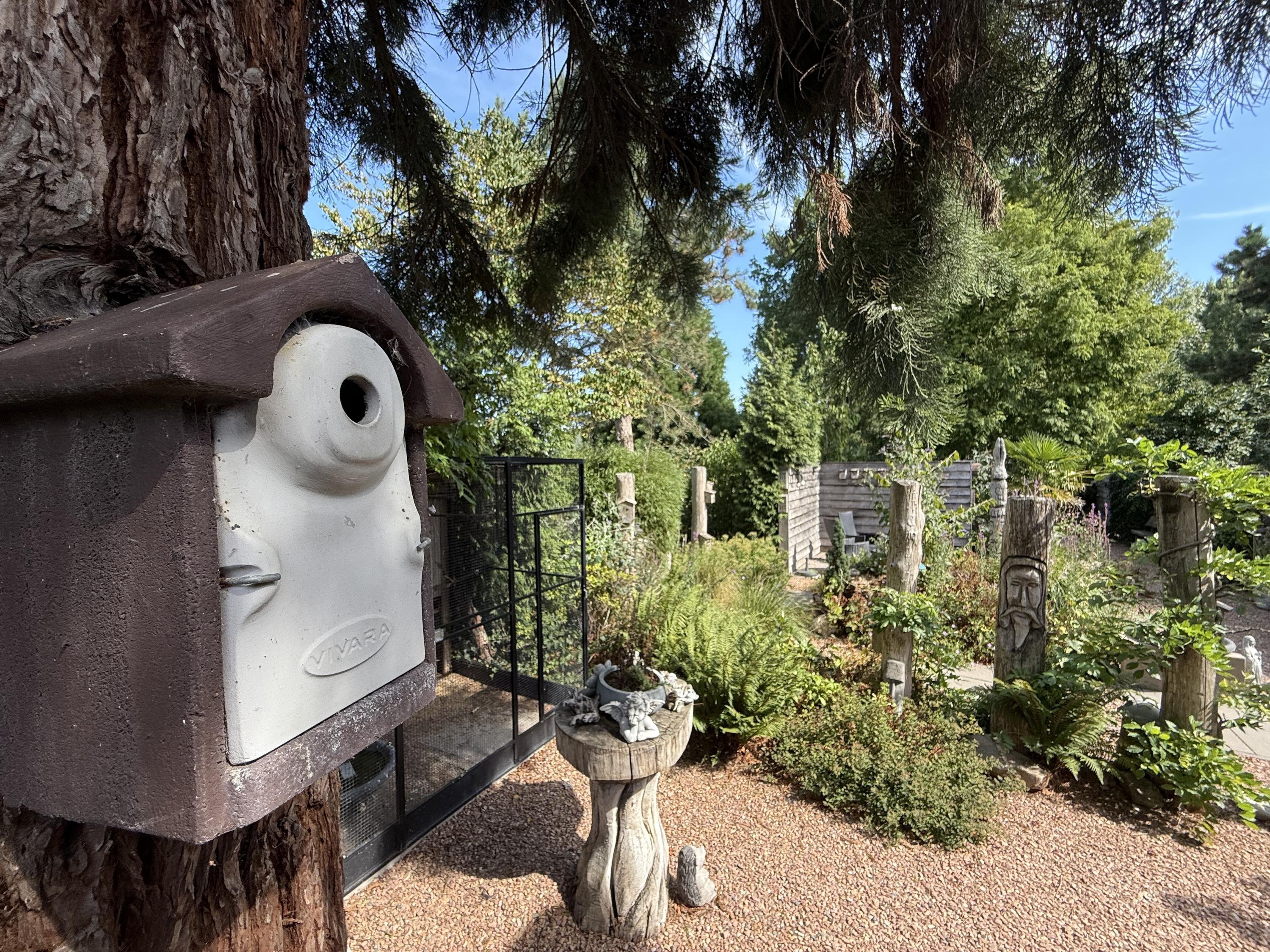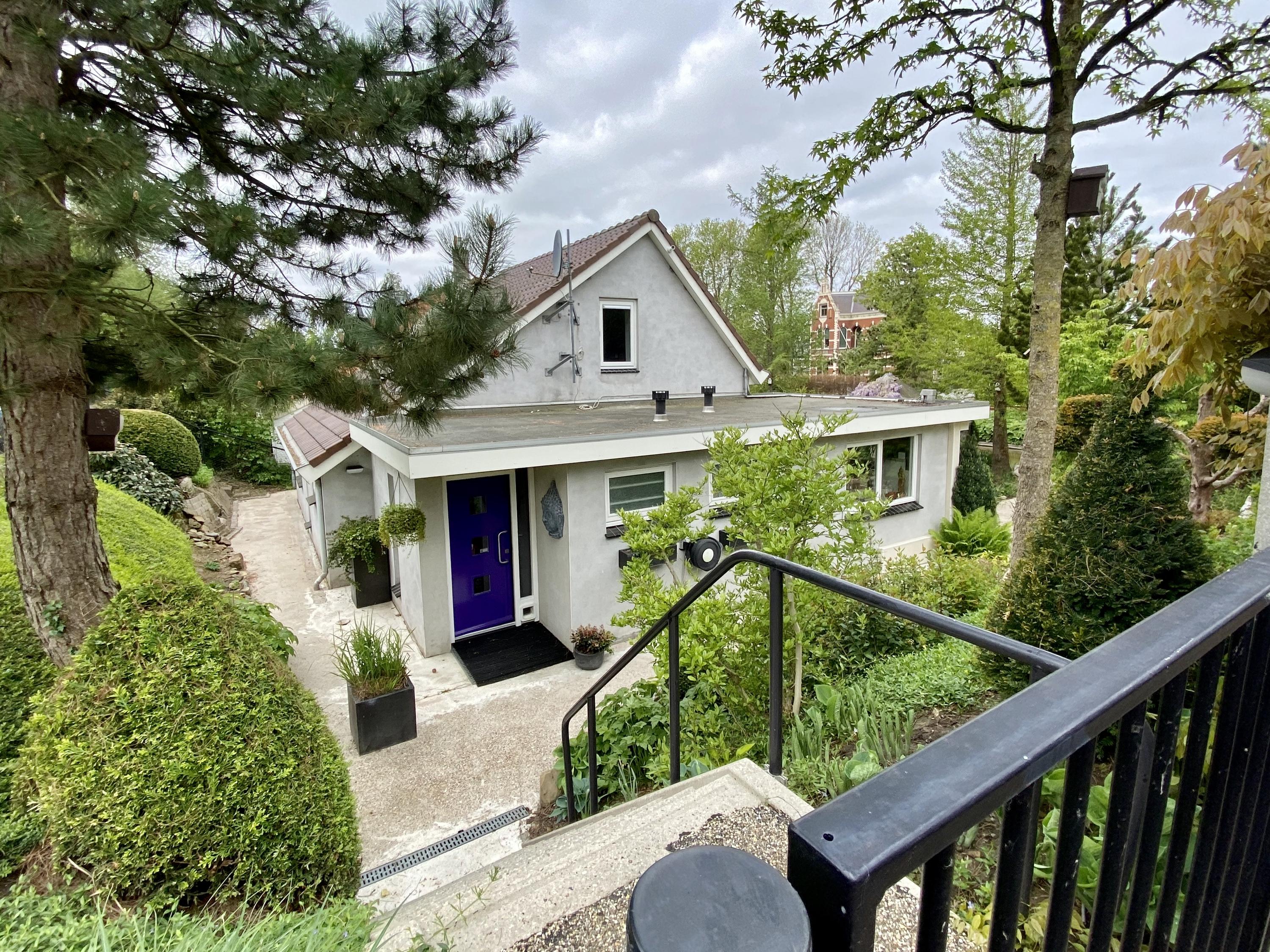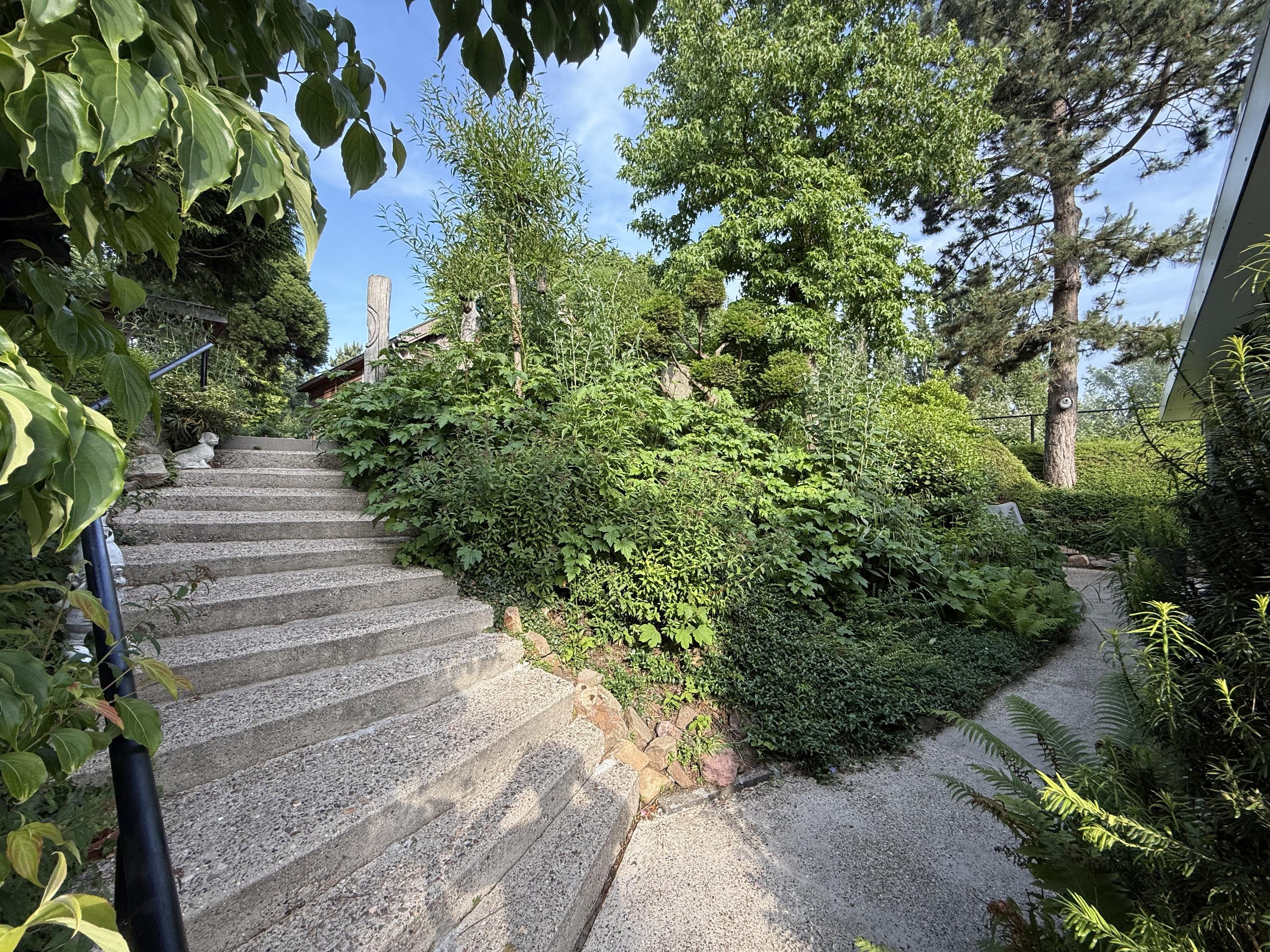 Stijlvol aangelegde en inspiratievolle tuin rondom met Greenlabel A certificering, opgetrokken / ingericht in Japanse stijl vv. veel groen en diverse terrassen, beton gegoten paden (vv. staalnetten), borders, grindpaden, niveauverschil, waterschalen, houten veranda, vogelverblijf;