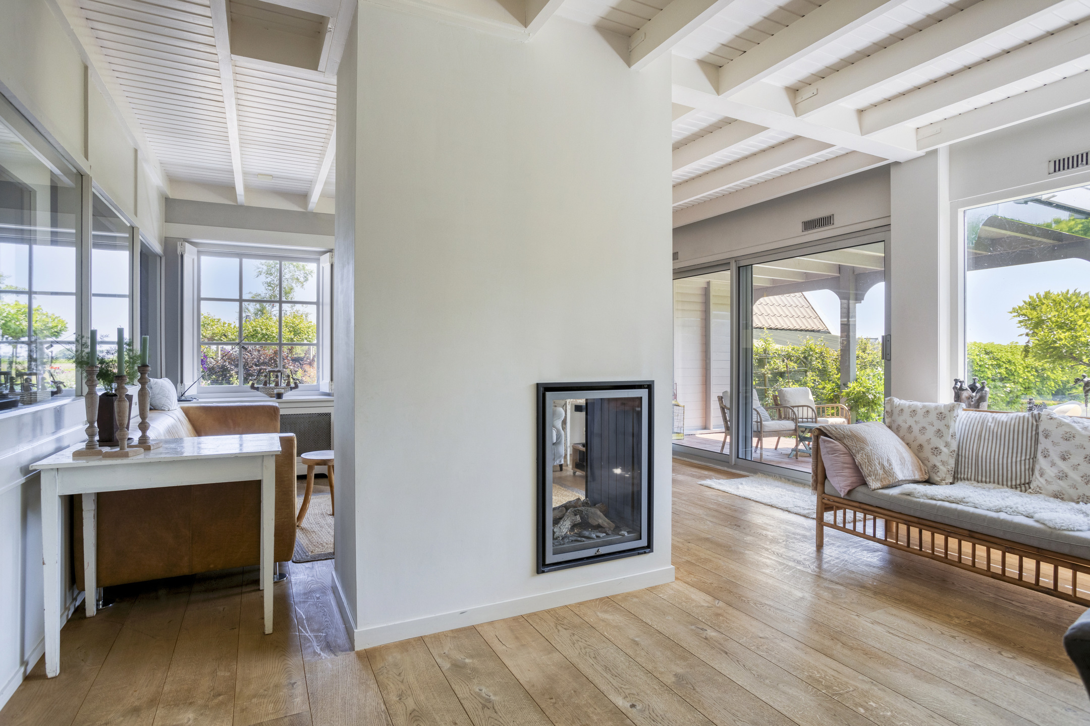 In het achterhuis bevindt zich een indrukwekkende tuingerichte woonkamer, met een sfeervolle gashaard en een grote schuifpui naar de tuin met overkapping. De schuifpui is voorzien van een rolluik, wat extra comfort en privacy biedt. De woonkamer voelt ruim en open aan, met prachtig zicht op de achtertuin. Aansluitend is er een bijkeuken, ideaal voor wasmachine, berging of extra opslag. Tevens is de tussenhal bij de trap perfect te gebruiken als kantoor of werkruimte.